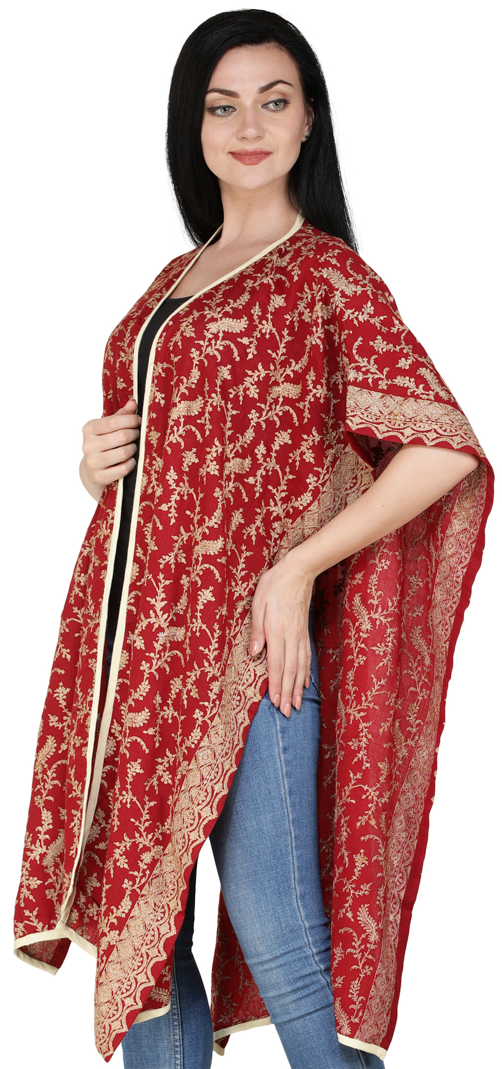 Wool Short Jacket with Aari Embroidered Floral Vines and Side Pockets from Kashmir
