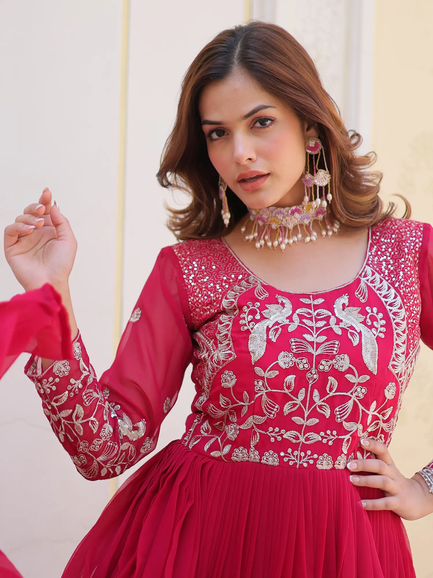 To preserve the exquisite beauty and delicate nature of this piece, we recommend professional dry cleaning. Handle with care to protect the intricate embroidery and delicate georgette. With proper attention, this garment will remain a cherished treasure in your wardrobe for years to come, a testament to enduring style and quality.