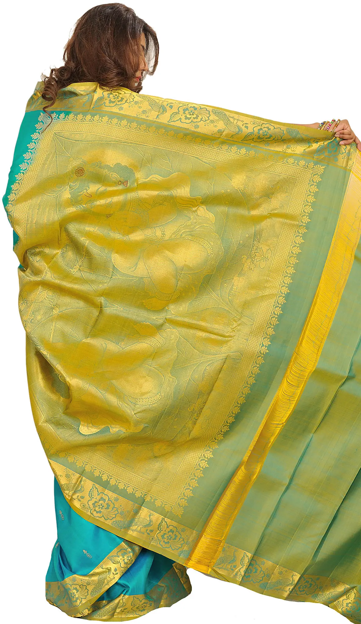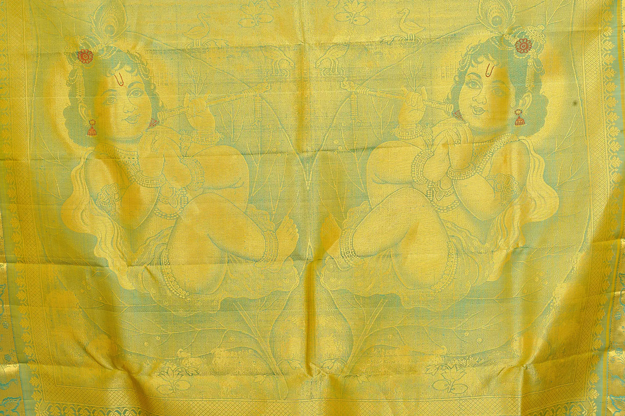 Hawaiian-Ocean Kanjivaram Saree with Woven Little Krishna on Aanchal