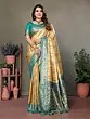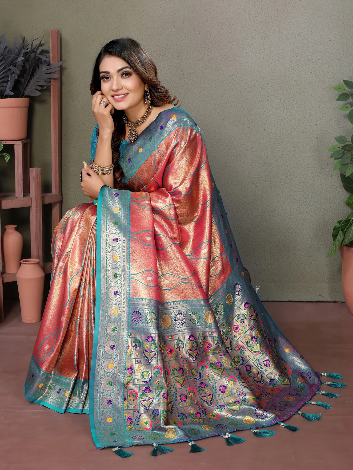 The chosen color palette, featuring a radiant gold base complemented by vibrant teal and hints of purple and yellow in the woven motifs, makes this saree an ideal choice for festive occasions. This delightful contrast ensures that the saree stands out, making a bold yet elegant statement. The tassels on the pallu add a playful touch, enhancing the festive charm and completing the traditional aesthetic. This saree is not just an attire; it's an embodiment of celebration and joy, perfect for weddings, parties, and other special gatherings where you wish to shine.