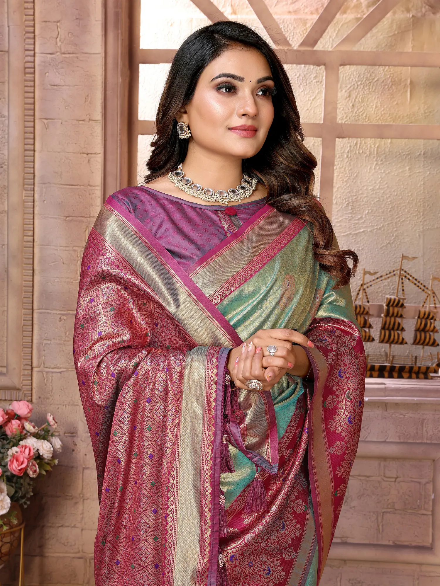 Lichi Silk Woven Floral Motifs Attractive Party Wear Saree With Matching Blouse