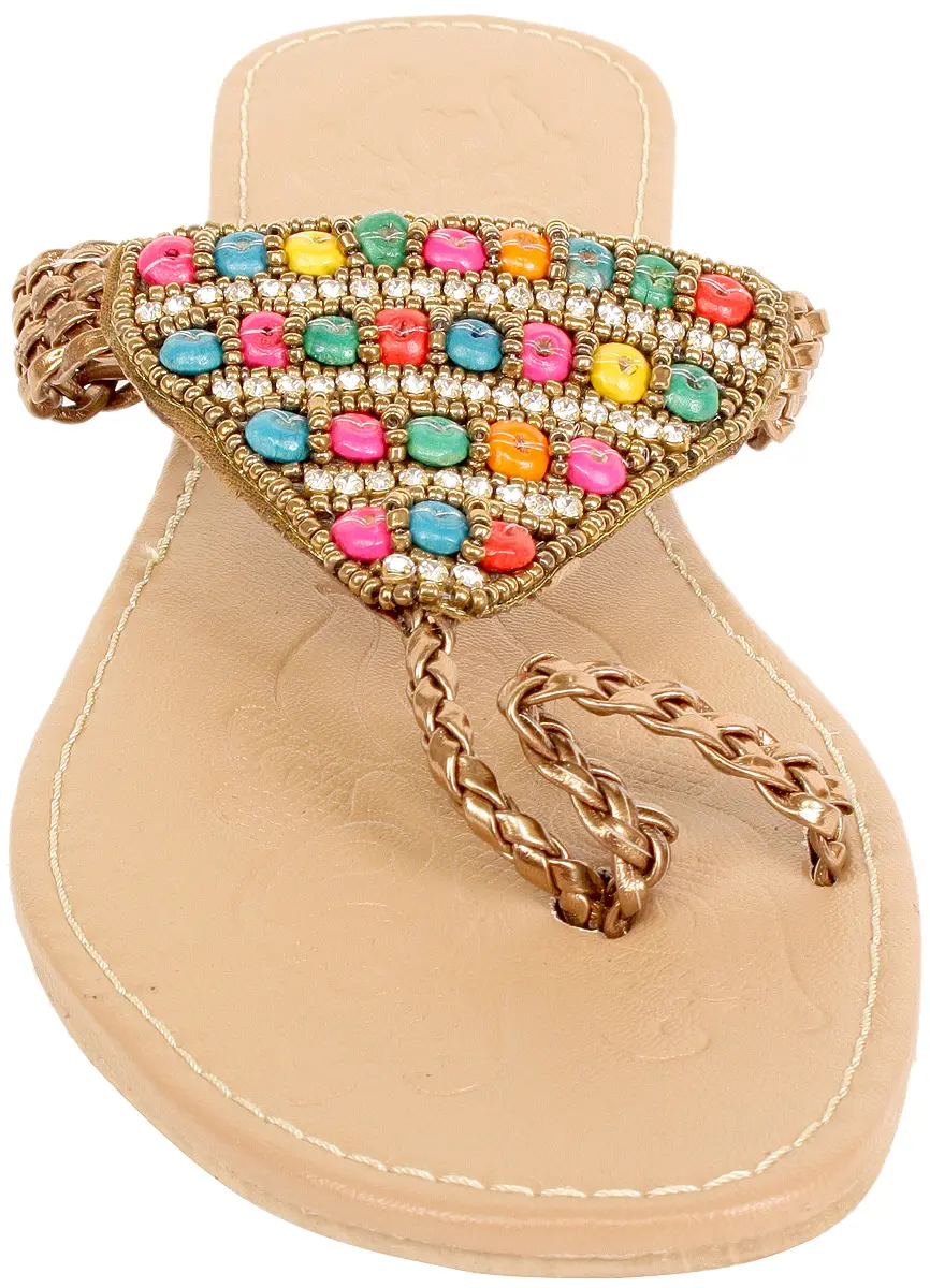 Each step is a dance of hues, as vibrant multi-color beads cascade across the buttery richness of toasted-almond leather. Symbolizing warmth, sophistication, and versatility, the toasted-almond hue envelops you in cozy elegance.
