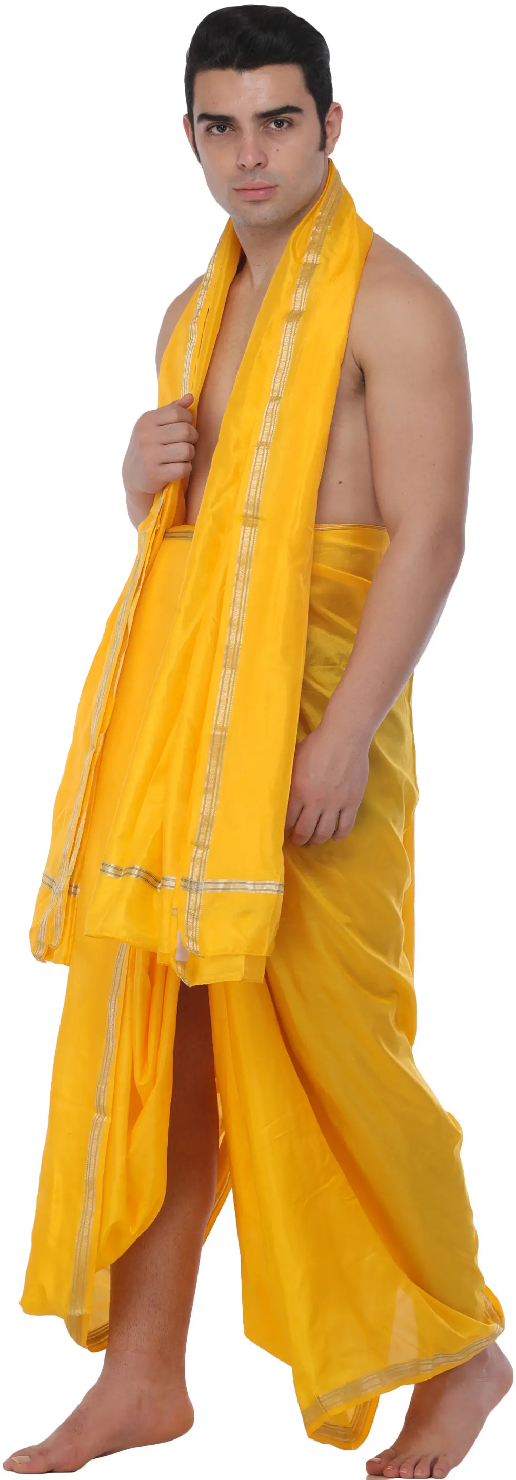 In the South Indian states men either fold their dhoti into half and tuck it at the waist reaching only to their knees which is mostly worn on informal occasions, or a full-length dhoti which is mostly plain white bearing a golden border. They wear it with an unstitched piece of cloth known as “Angavastram” draped over their shoulders. Some men wear the dhoti along with a shirt which they call a “Chokka”.