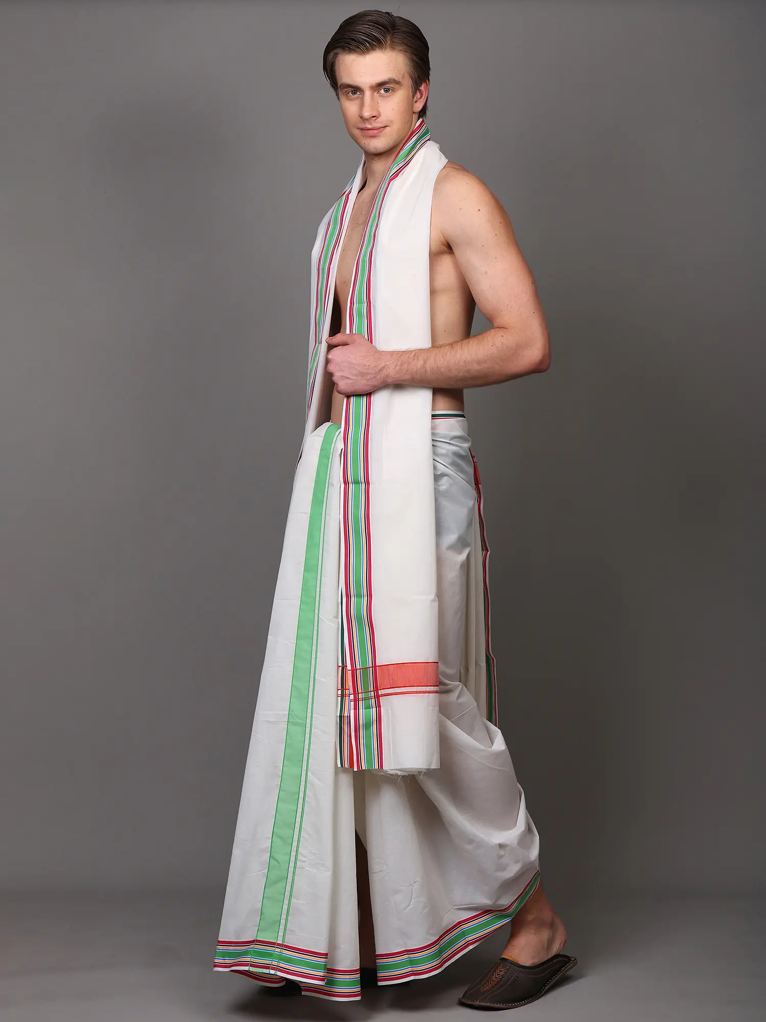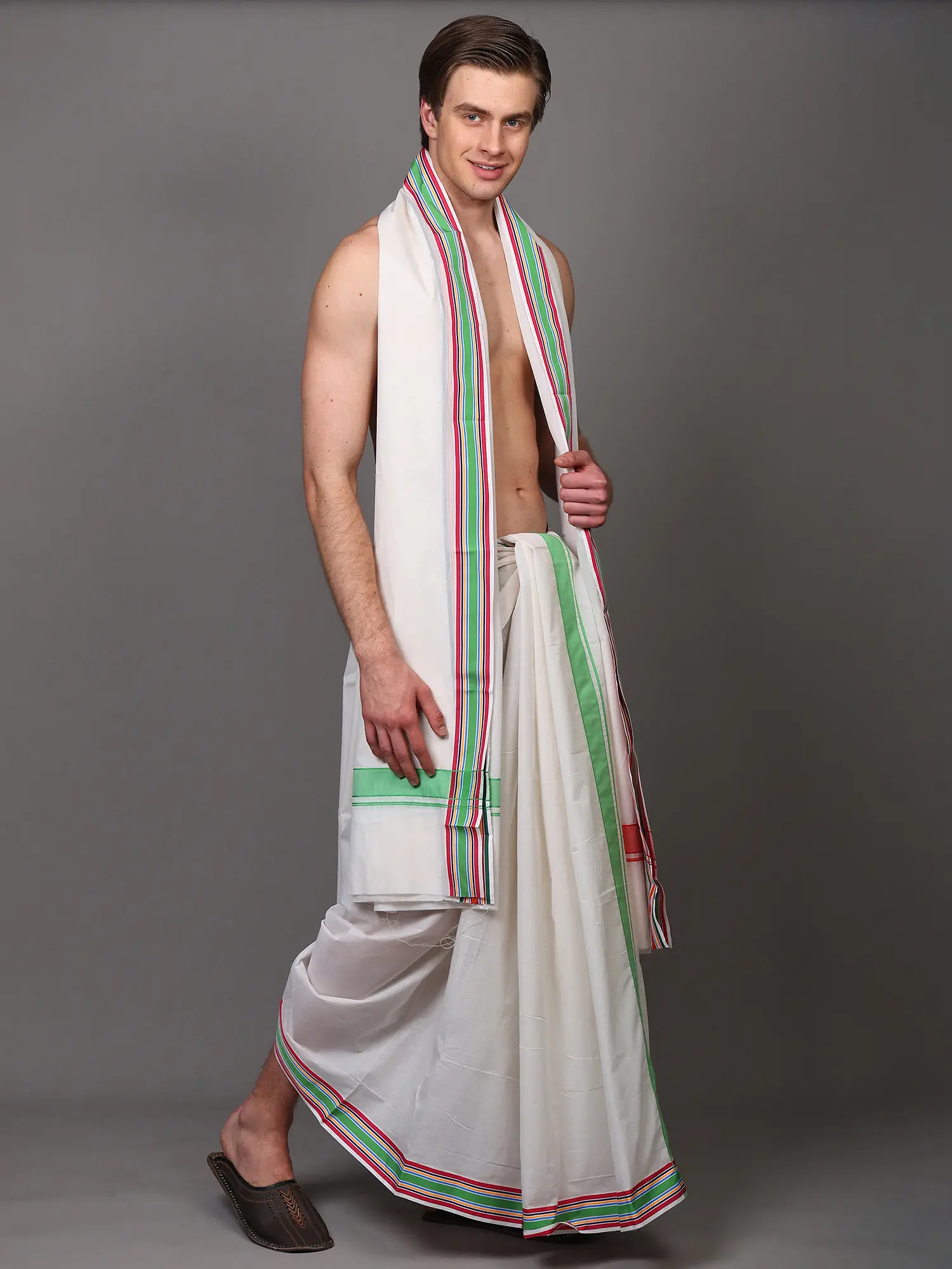 Discover the essence of traditional Indian attire with this exquisite dhoti and angavastram set. Crafted from pure cotton, this ensemble offers unparalleled comfort and breathability, making it perfect for any occasion, from religious ceremonies and cultural festivals to casual gatherings. The classic white fabric serves as a pristine canvas, elegantly adorned with a vibrant multi-stripes border. This intricate detailing, featuring a harmonious blend of green, gold, and red hues, adds a touch of refined sophistication and traditional charm.