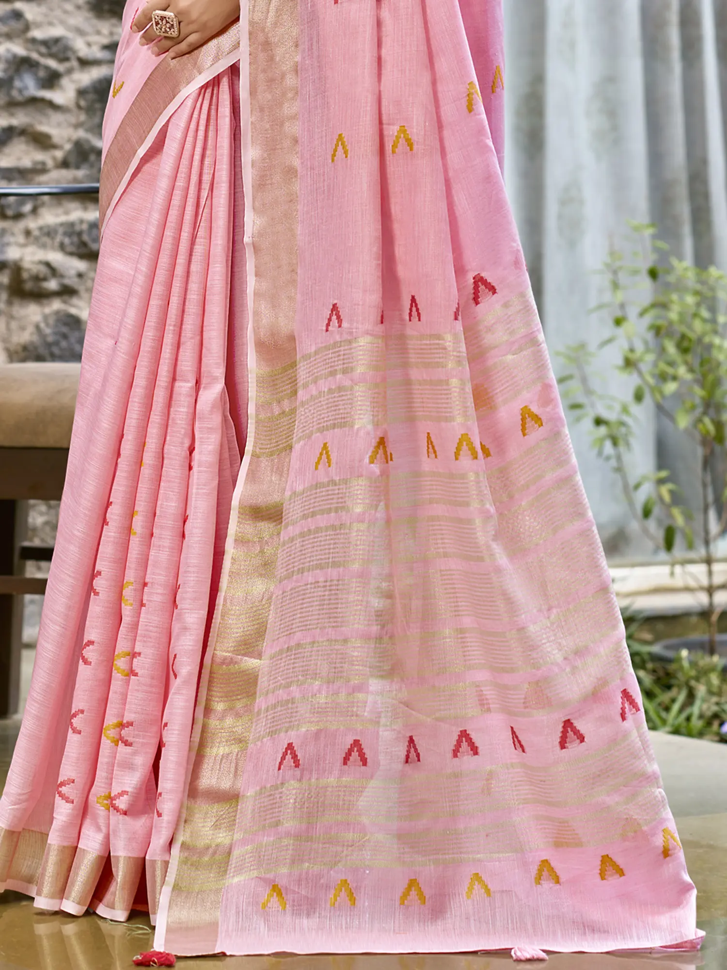 The true artistry of this saree lies in its meticulous weaving work. Delicate, geometric patterns in vibrant shades of red and yellow are intricately woven across the fabric, creating a captivating visual texture. These motifs add a subtle yet eye-catching detail that speaks volumes about the artisanal skill involved. The pallu, a statement piece in itself, features a sophisticated striped design interspersed with the same charming woven patterns. A touch of tradition is added with charming tassels adorning the hem of the pallu, lending a playful and authentic finish. The border of the saree is accented with a complementary fine gold border, enhancing its opulent appeal without being overpowering.
