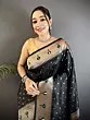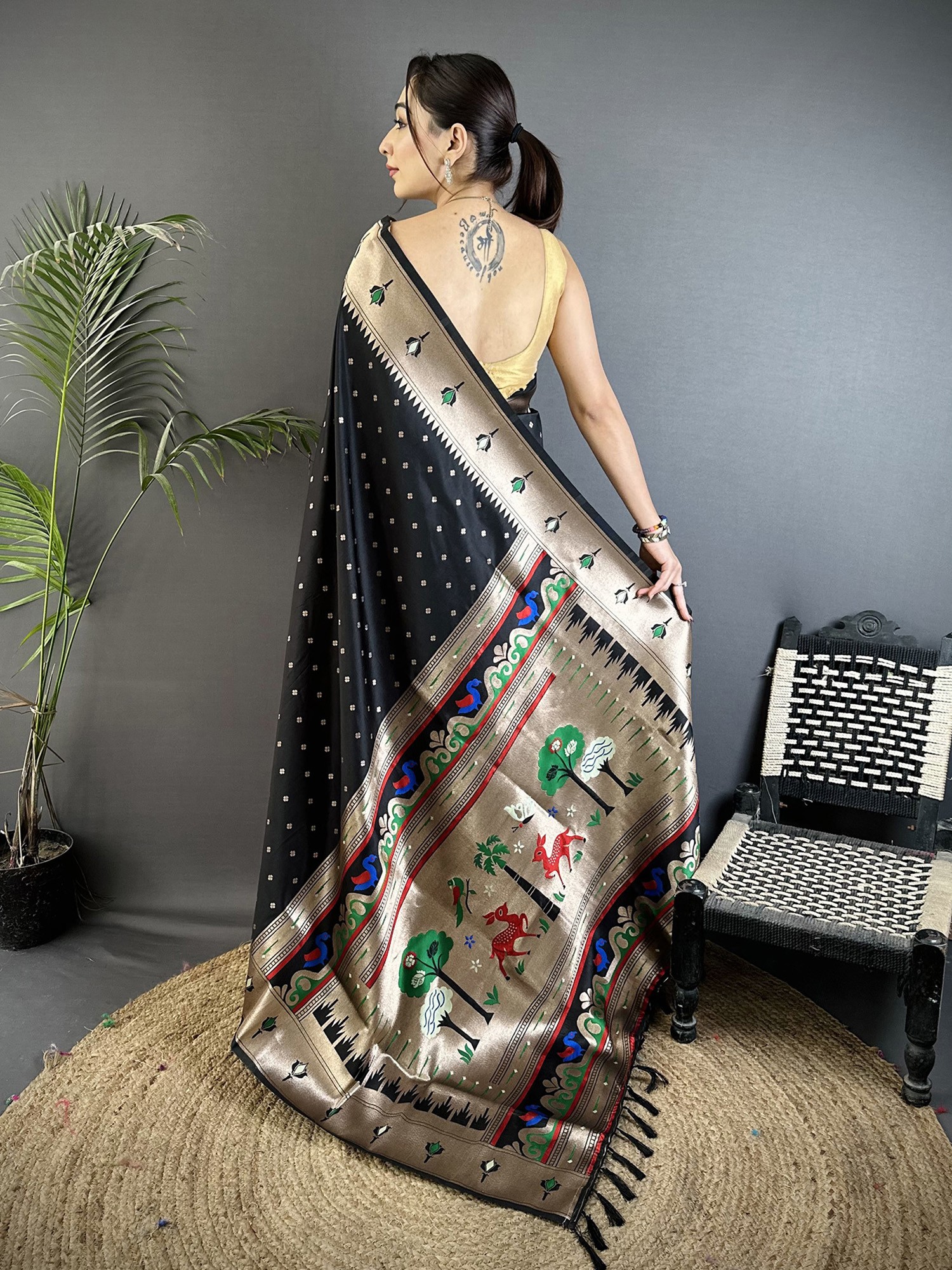 The rich, dark expanse of the silk serves as a dramatic backdrop for the opulent artistry that adorns its borders and body. You'll discover exquisitely detailed peacocks and a symphony of floral designs, each motif rendered with precision and vibrant color. Tiny, shimmering squares are scattered across the fabric, catching the light and adding a subtle, playful sparkle. The broad pallu showcases a breathtaking tableau of nature, featuring graceful deer amidst stylized trees and colorful avian motifs, a true testament to the weaver's imagination.