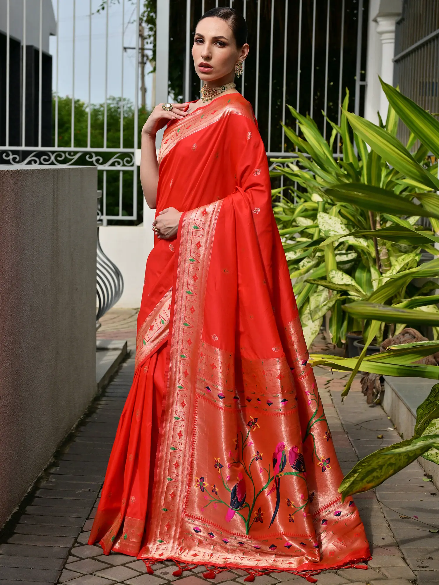 The true artistry of this saree lies in its resplendent pallu and borders. The pallu is a canvas of vibrant artistry, showcasing the mesmerizing Meenakari technique. This intricate form of enamel work, fused with traditional weaving, brings to life a captivating tableau of colorful birds perched on blossoming branches. The detailed motifs and bold colors of the Meenakari work create a striking contrast against the silk, making the pallu a focal point of breathtaking beauty. Complementing this splendor is the broad zari border, woven with shimmering gold threads. This border is adorned with traditional geometric patterns and delicate floral motifs, adding a regal touch and framing the saree with an undeniable sense of luxury.