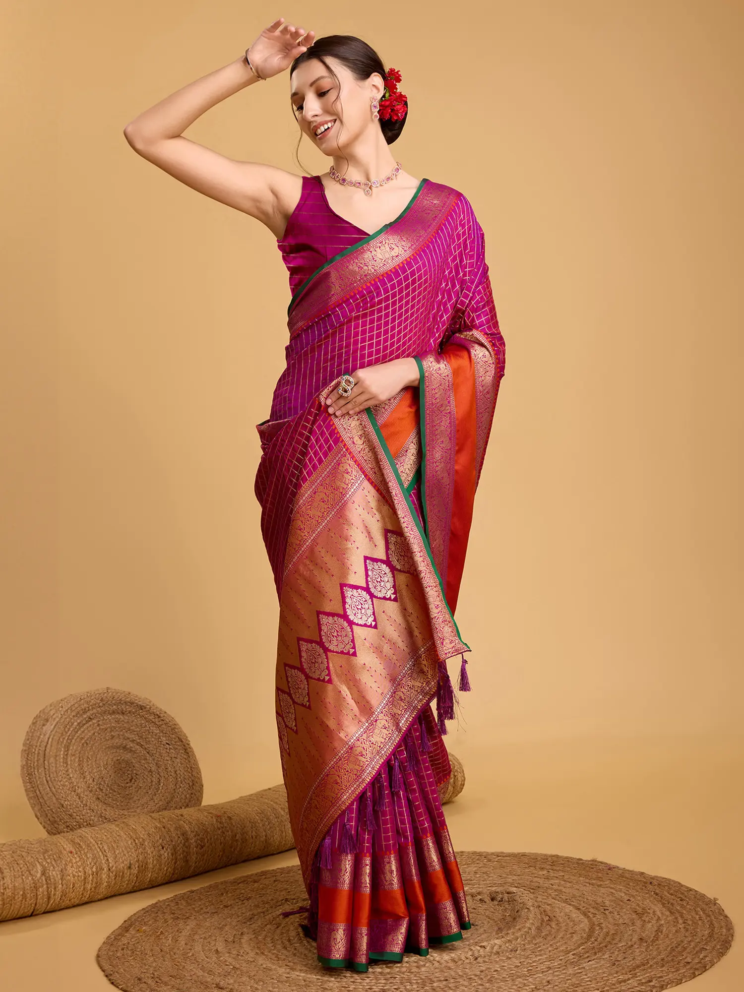 Silk Saree with Zari-Woven Border and Geometric Motifs All-Over