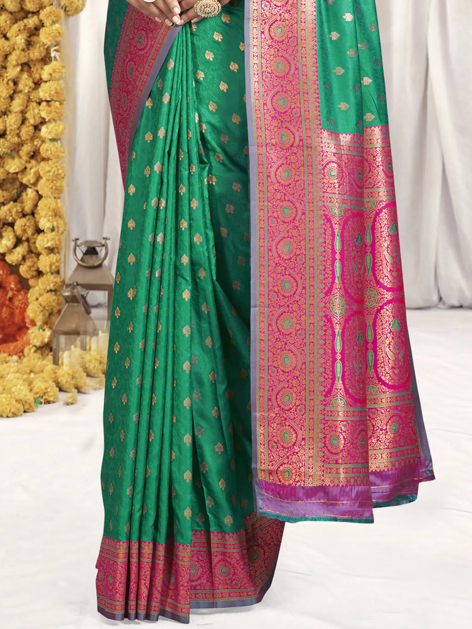 Dual Shade Pure Silk Saree with Golden Zari Woven Peacock-Elephant Motif Broad Border and Bold Aamra Motif on Pallu