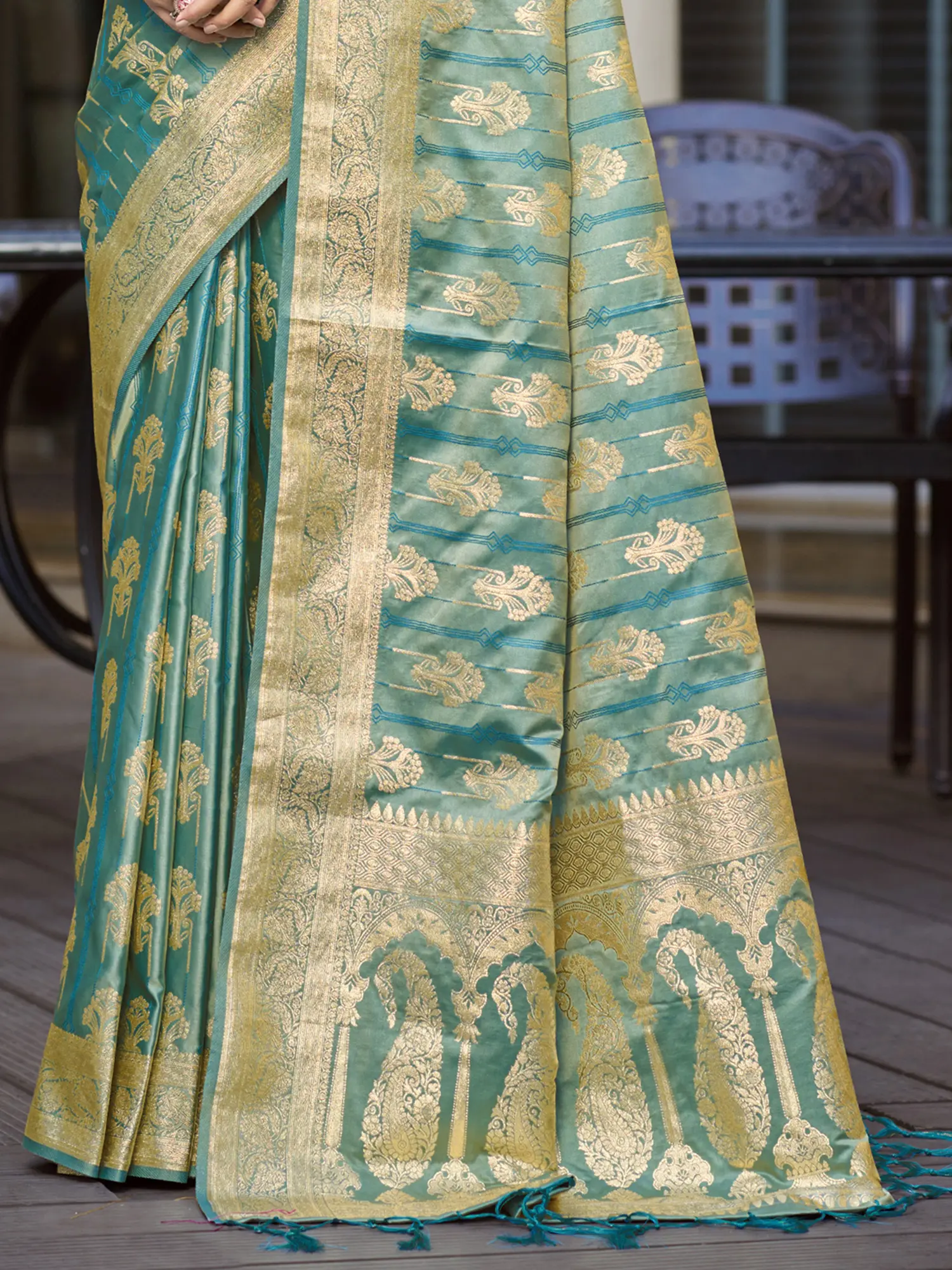 The saree's beauty lies in its intricate detailing. Traditional woven motifs are meticulously embroidered throughout the body, adding a touch of classic charm. These motifs, rich in cultural significance, narrate stories of heritage and craftsmanship. The subtle yet striking gold accents against the sage green background create a captivating visual tapestry.