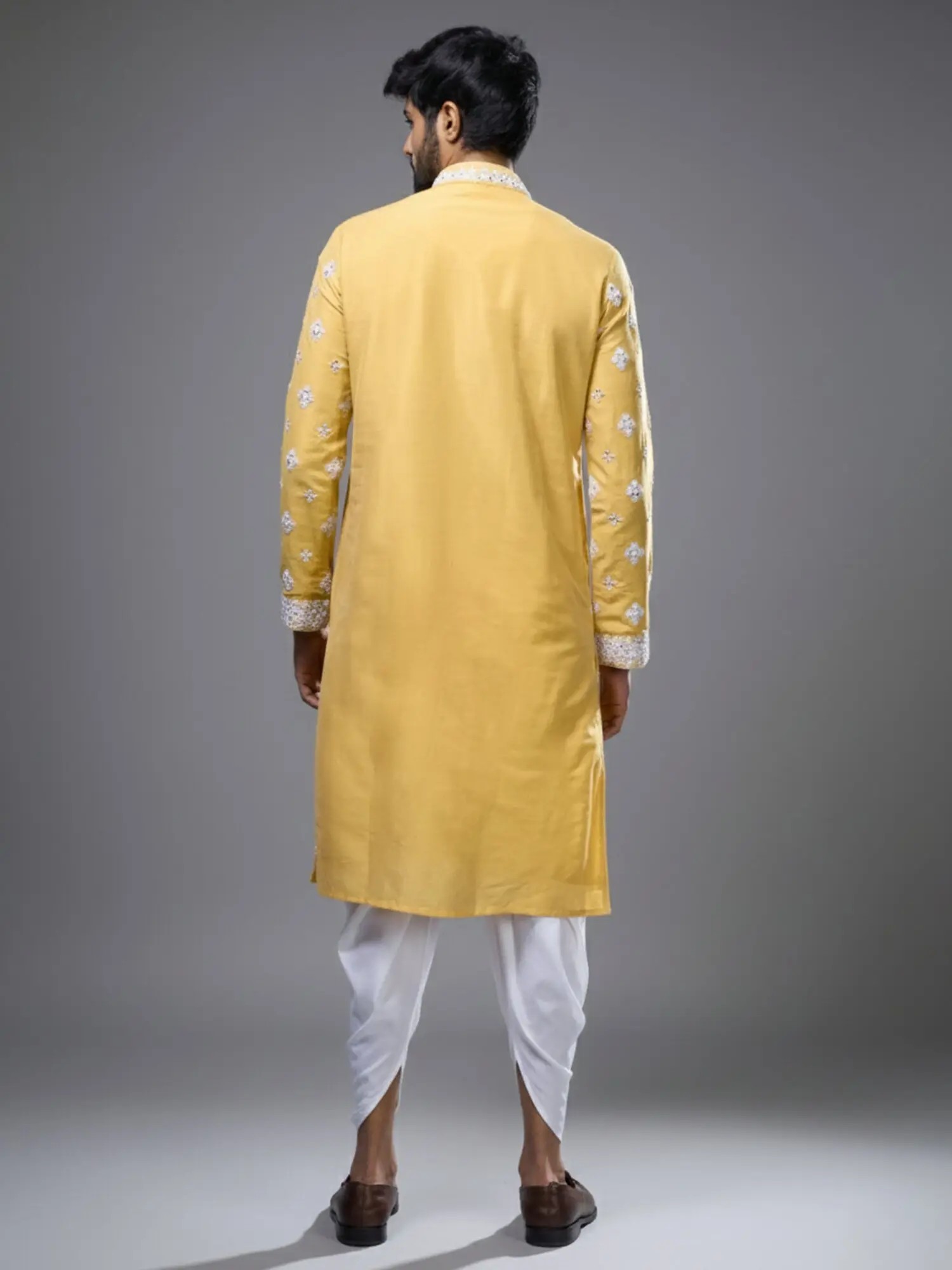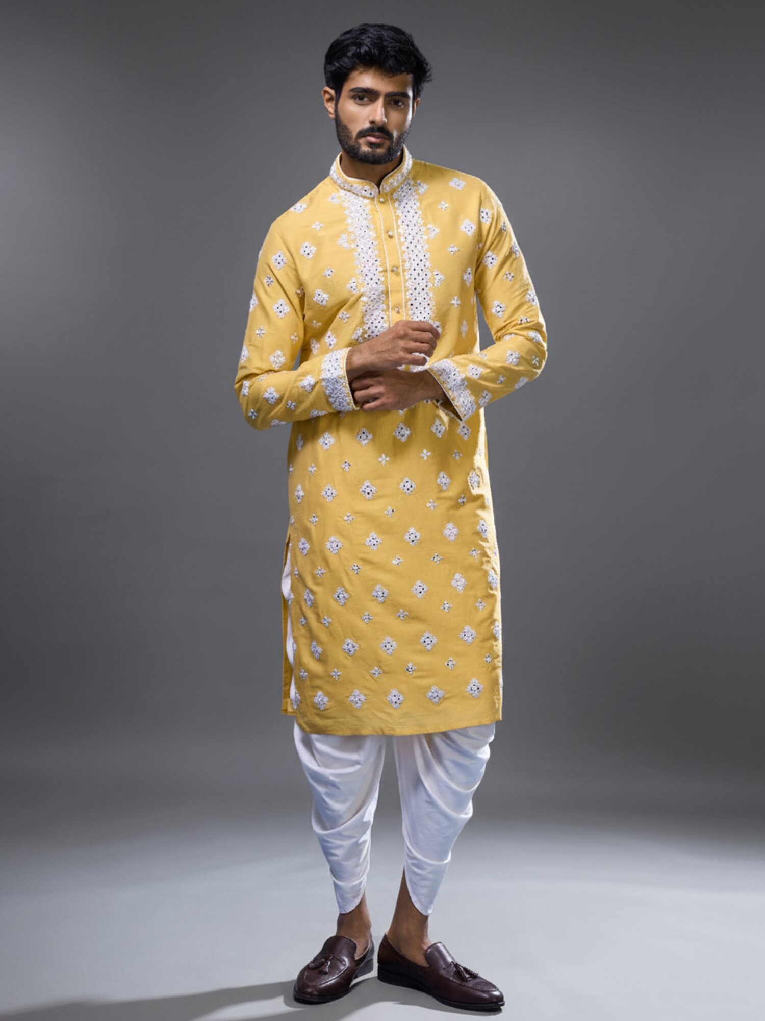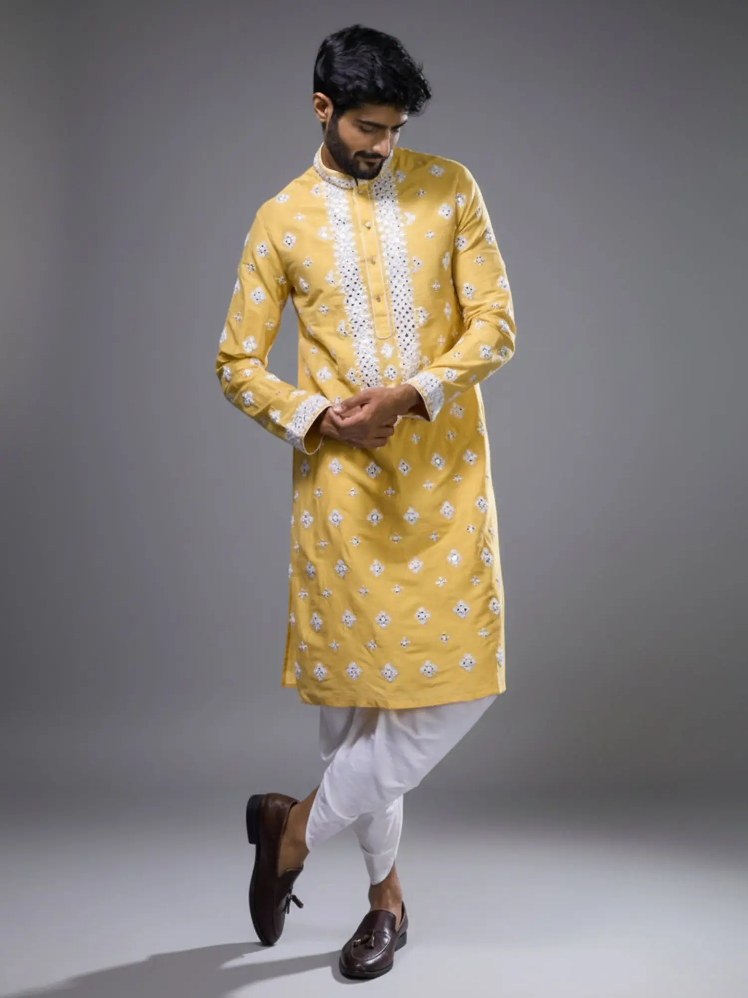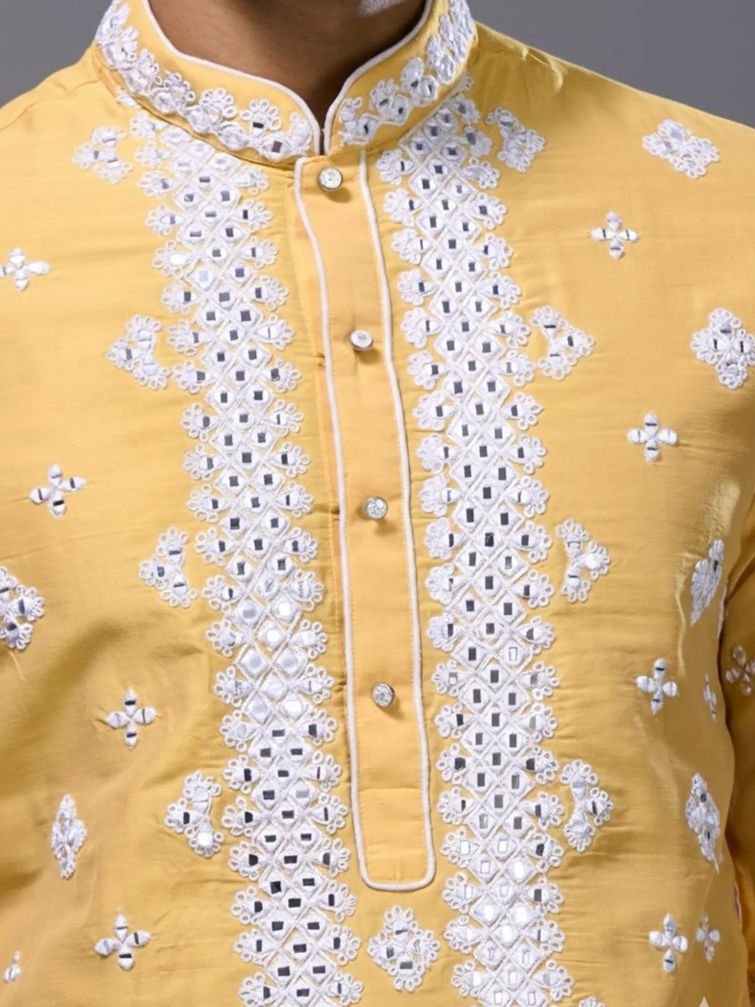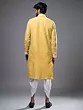 Yellow Silk Kurta Set with Floral Embroidery and Mirror Detailing for Men