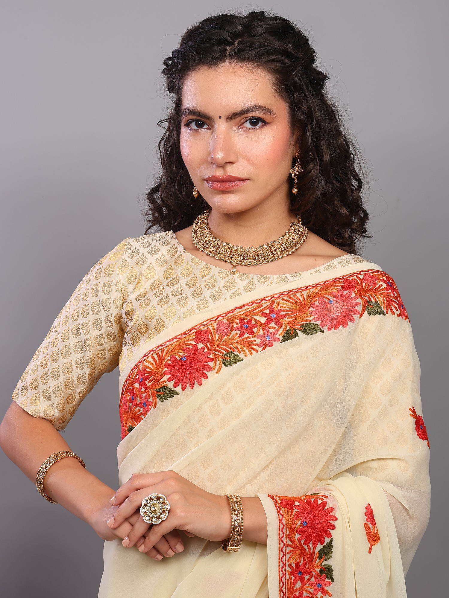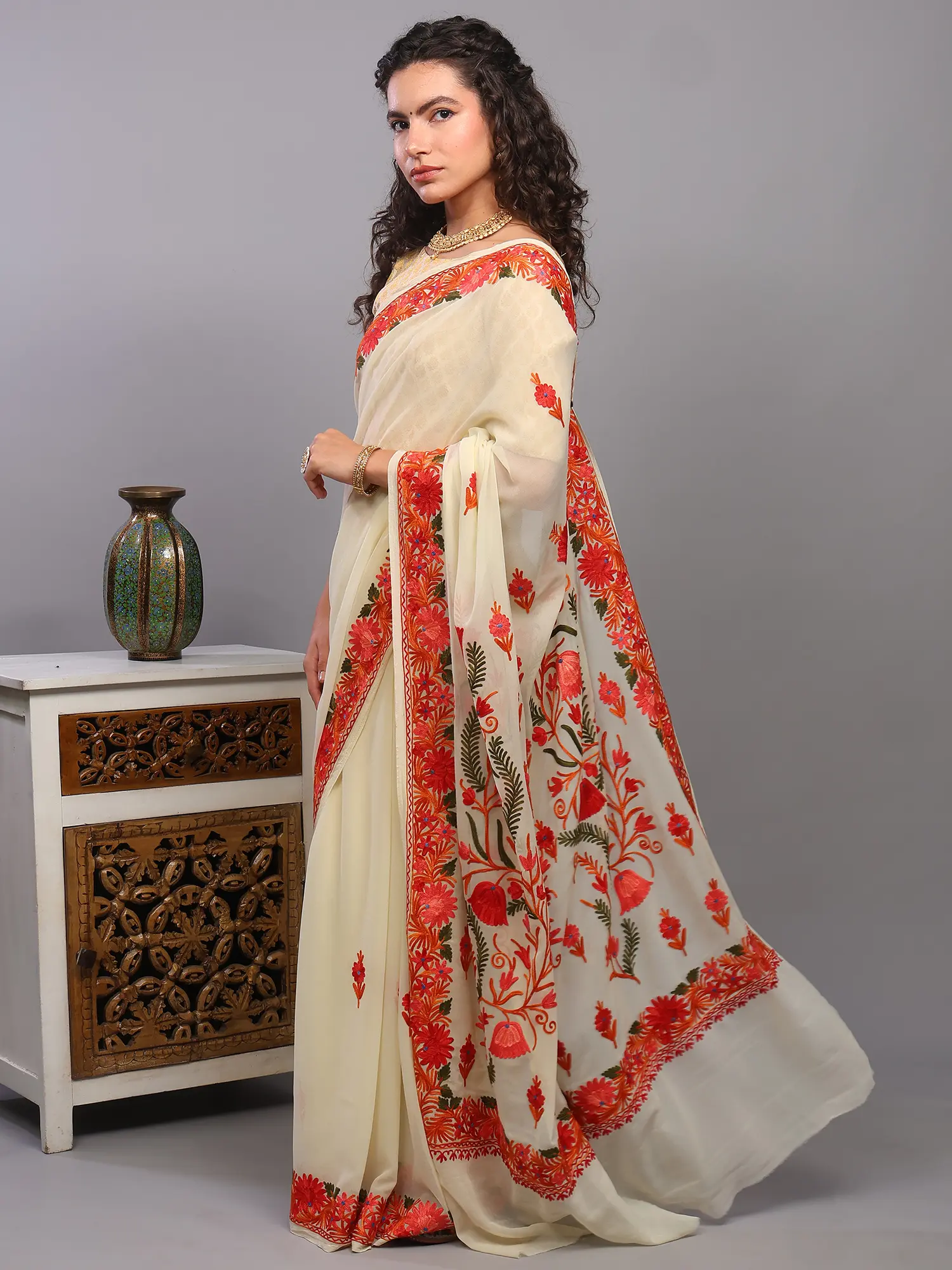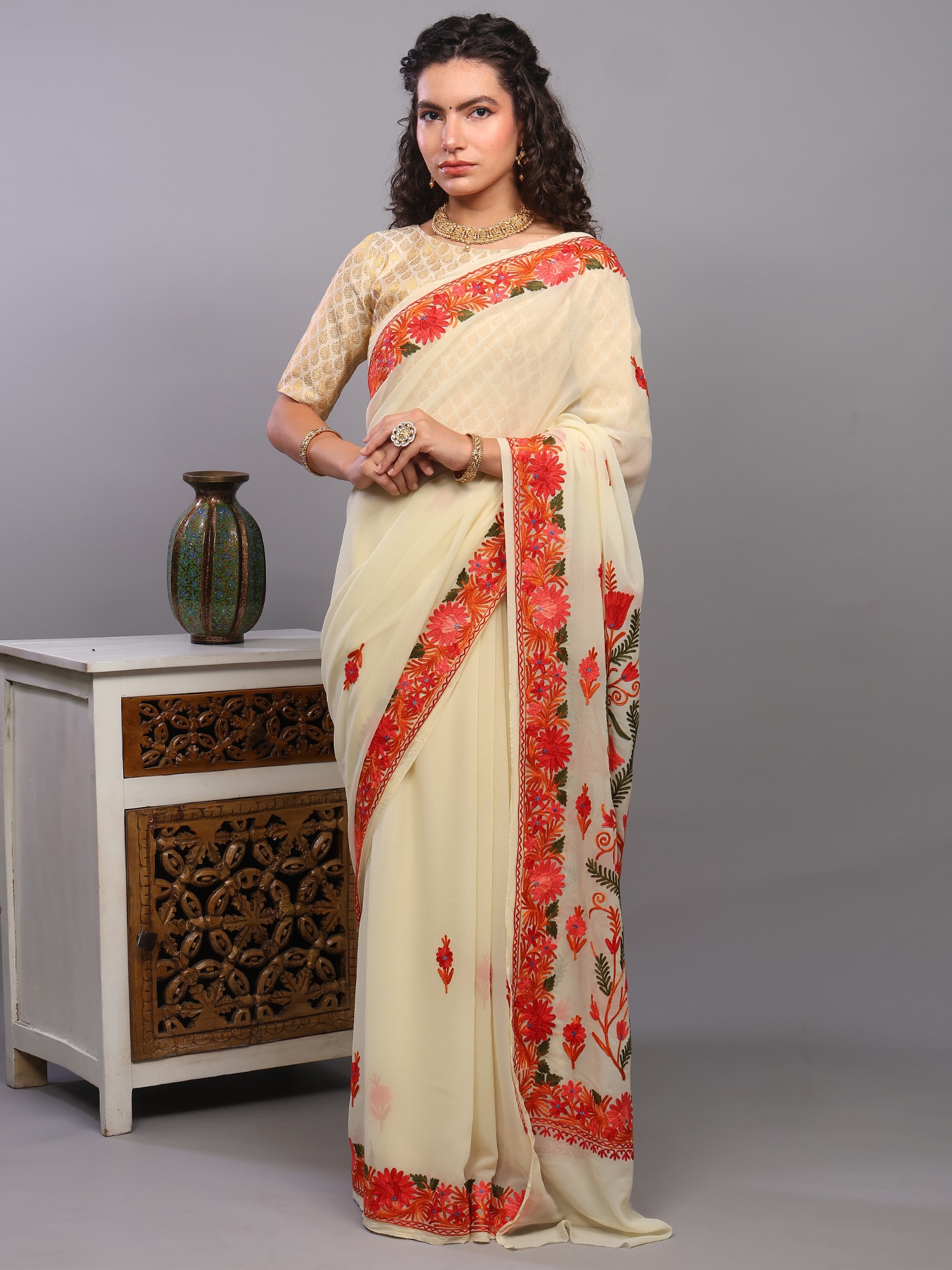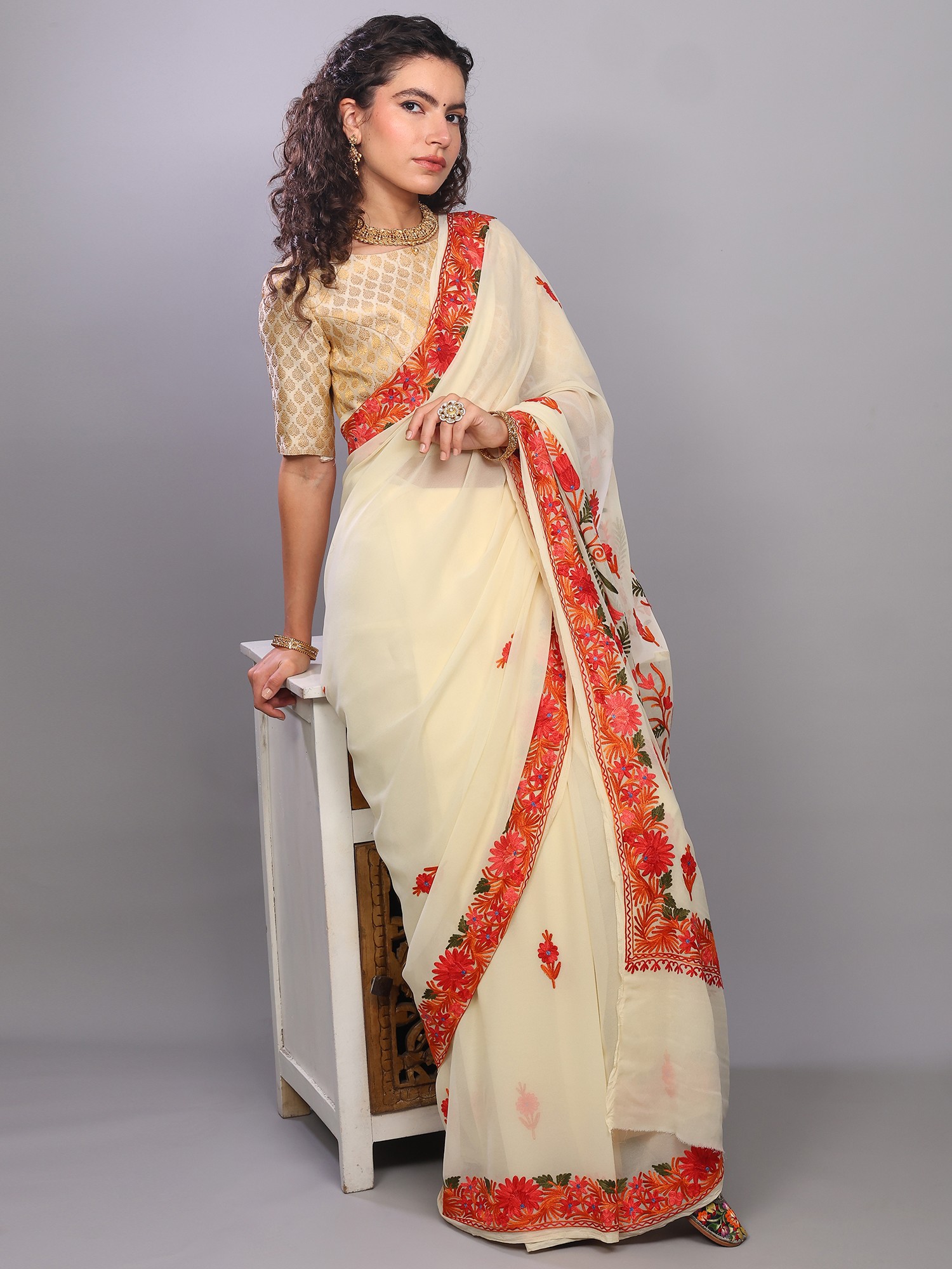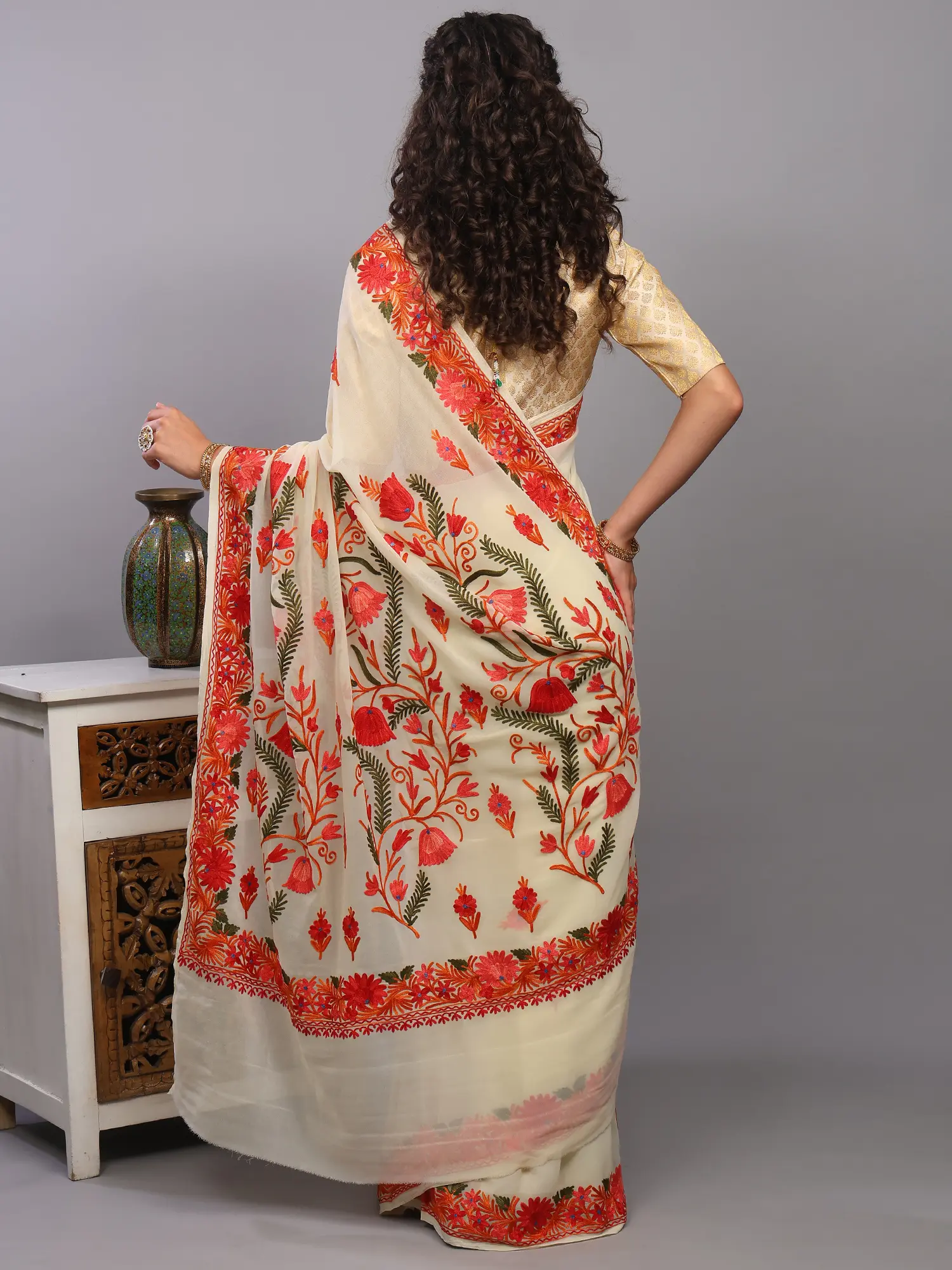 Owning this saree is not just about possessing a beautiful garment; it's about embracing a piece of cultural heritage. Each stitch tells a story of skilled artisans and generations of tradition. The delicate georgette, known for its fluidity and subtle sheen, combined with the enduring beauty of Kashmiri embroidery, creates a timeless piece that will be cherished for years to come. Add this enchanting creation to your wardrobe and experience the magic of authentic Indian craftsmanship.