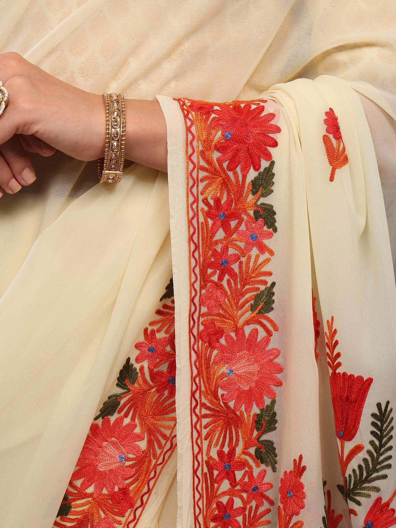 Autumn-Blonde Georgette Saree from Kashmir with Floral Aari Embroidery on Aanchal and Border