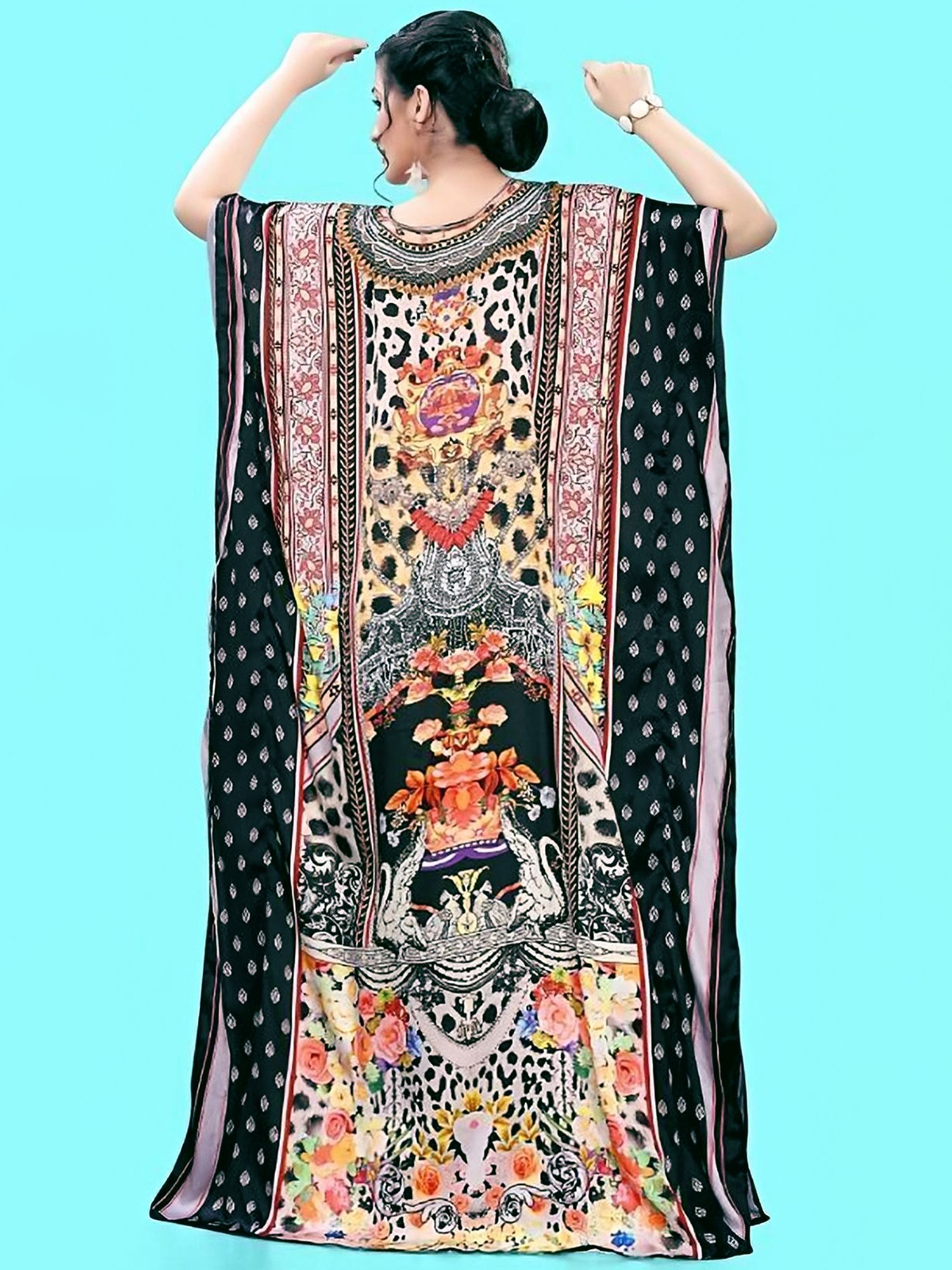 Satin Floor Length Stone work Kaftan with Printed Multicolor Motifs