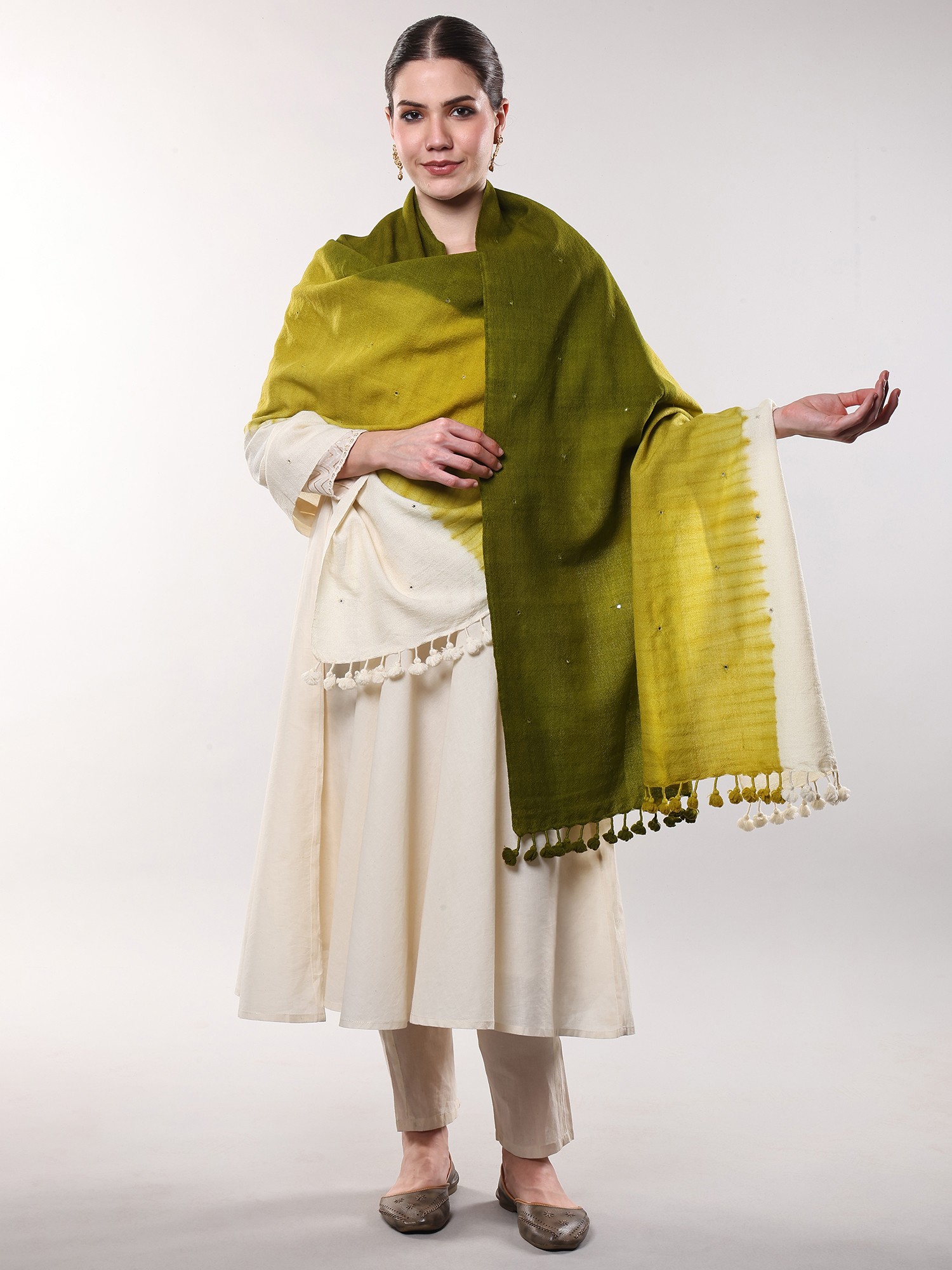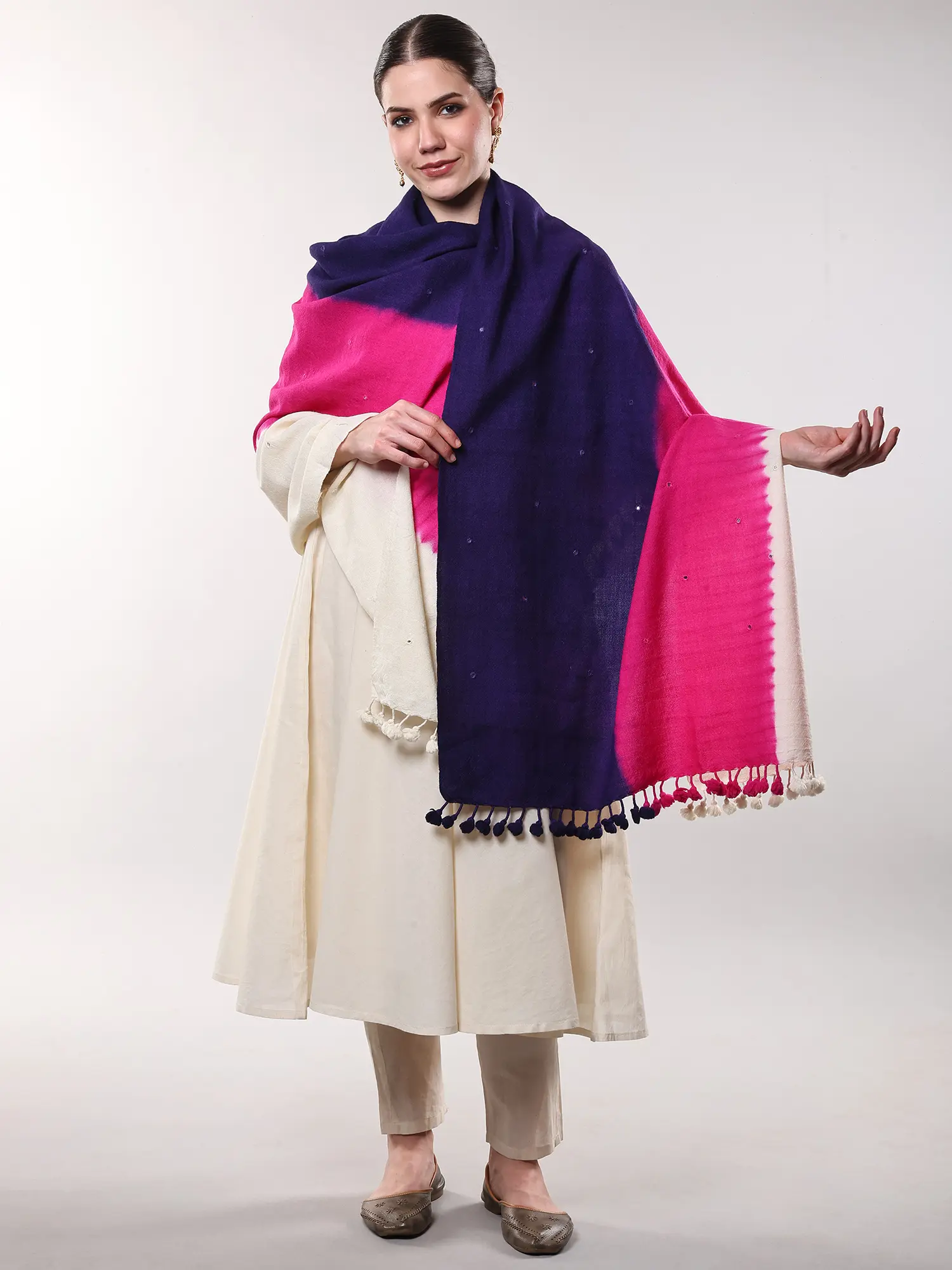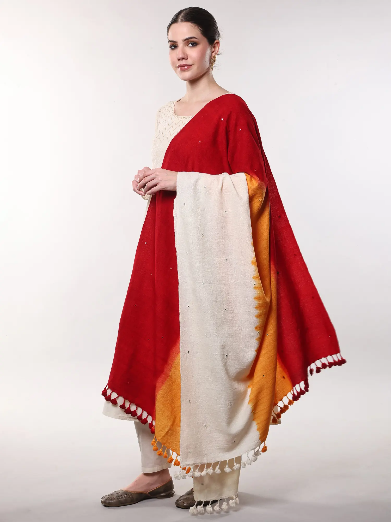 Triple Shaded Tie-Dye Shawl with Mirror Work and Pom-Poms Border from Gujarat