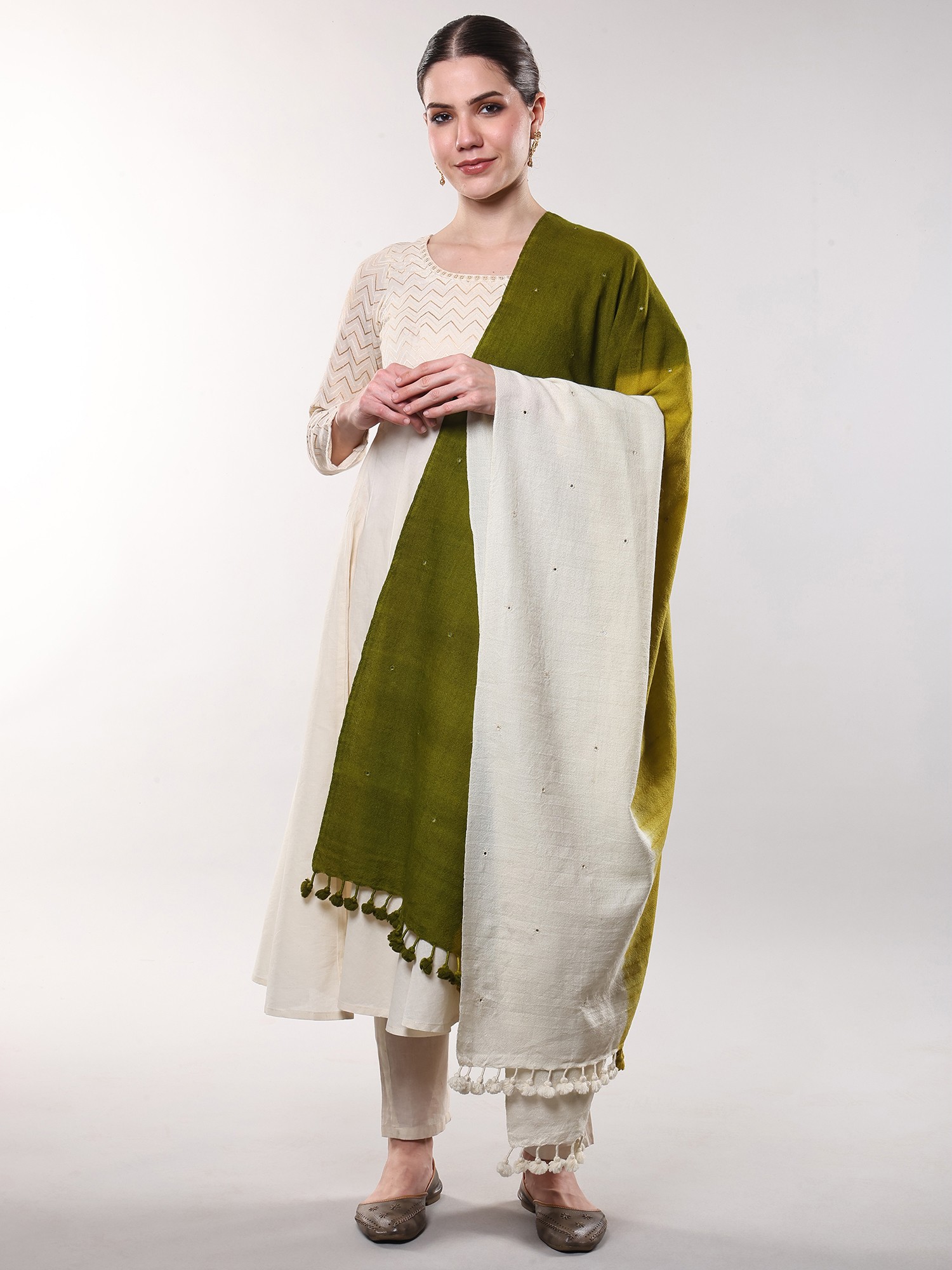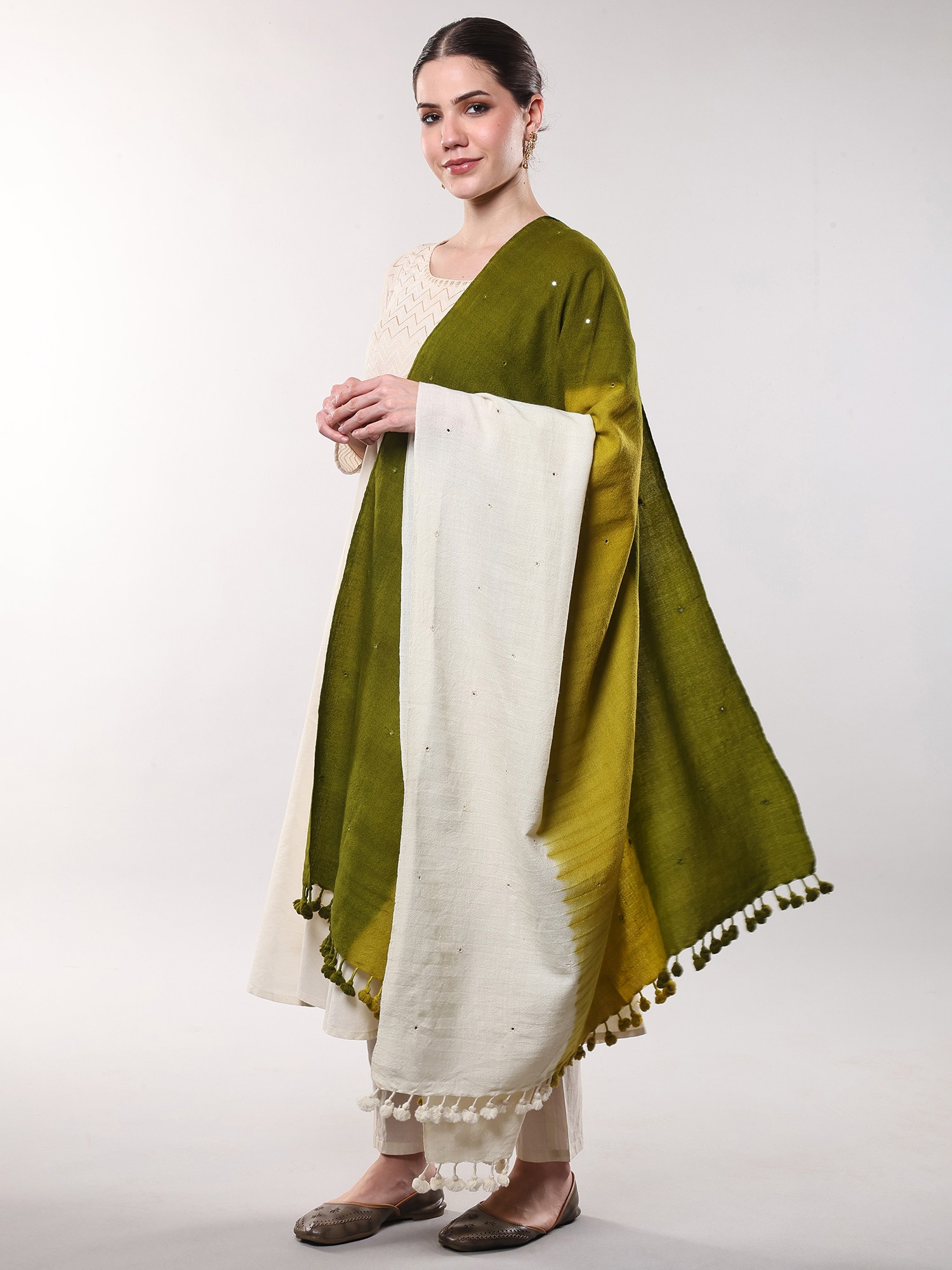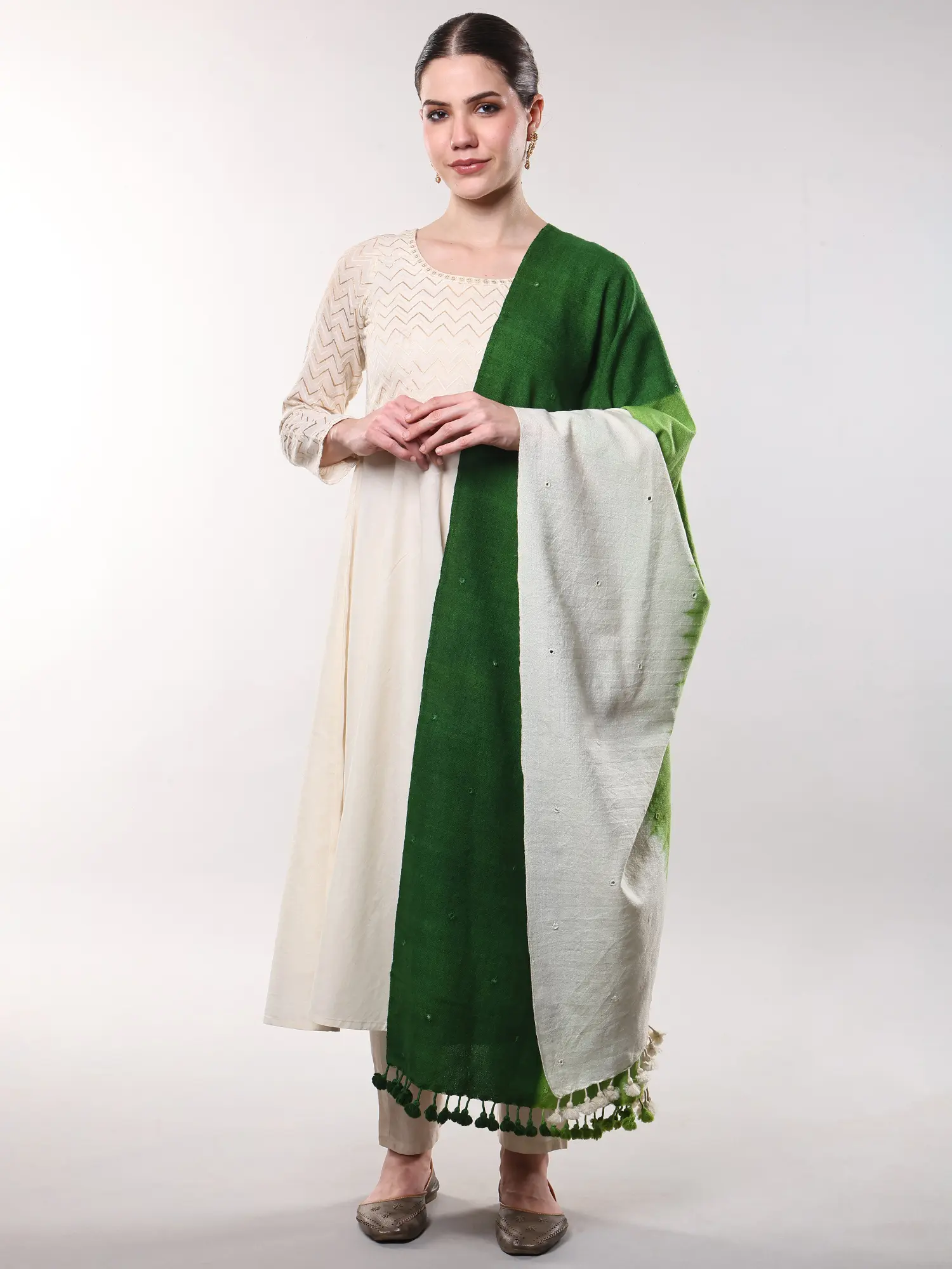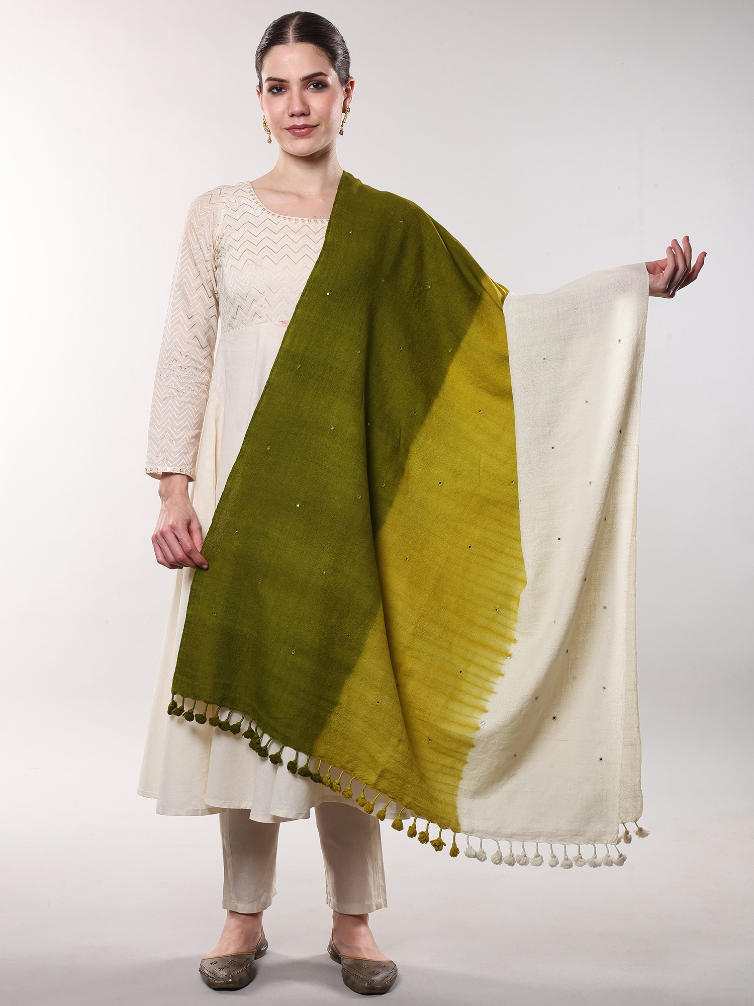 Triple Shaded Tie-Dye Shawl with Mirror Work and Pom-Poms Border from Gujarat