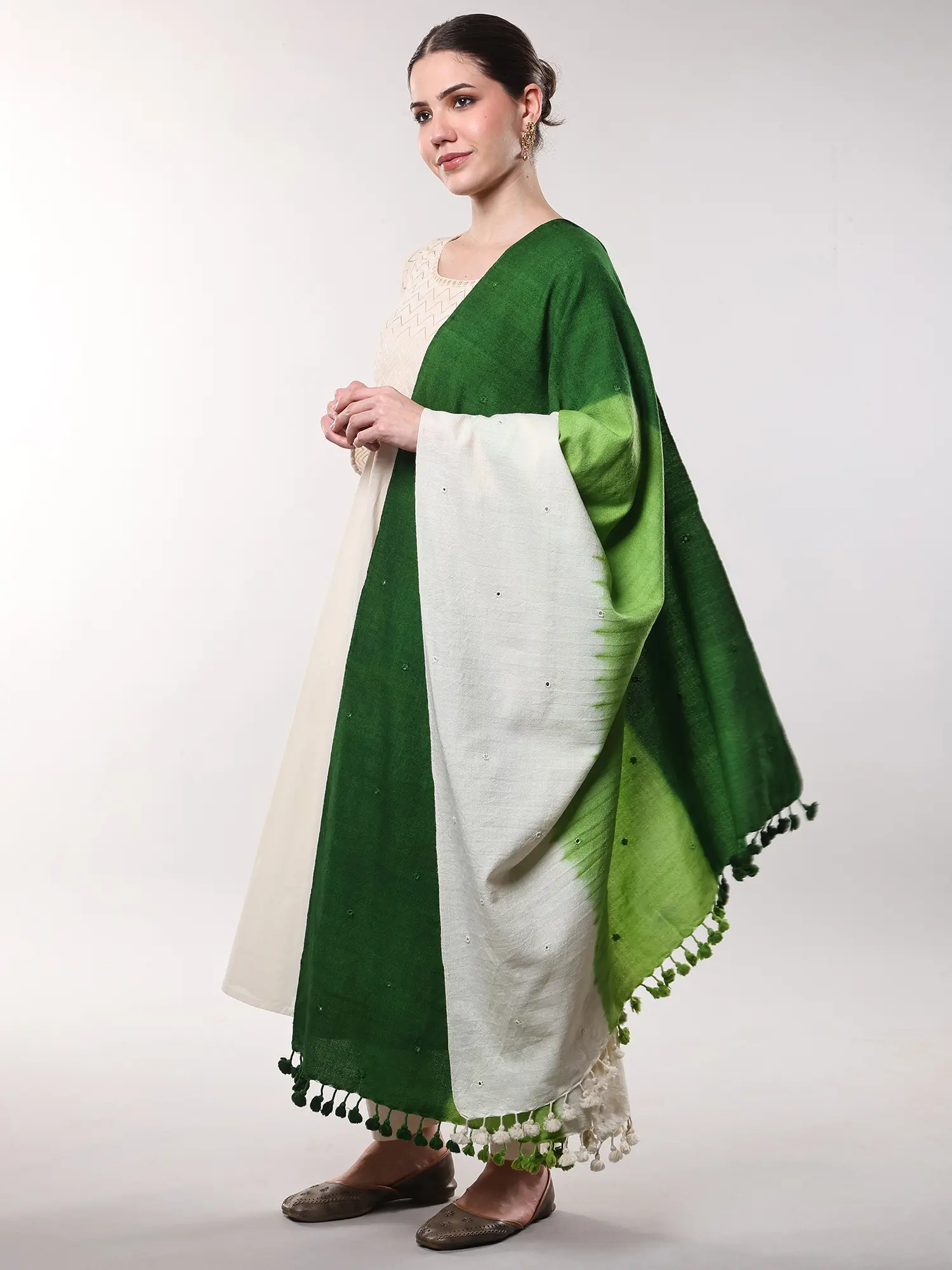 Observe the delicate shimmer as small, carefully placed mirrors catch the light, adding a subtle gleam to the rich wool. The border is adorned with playful, hand-tied pom-poms, a delightful flourish that speaks of a joyful artisan spirit. With a generous length of 82 inches and a width of 38 inches, it offers an expansive canvas for its artistry.