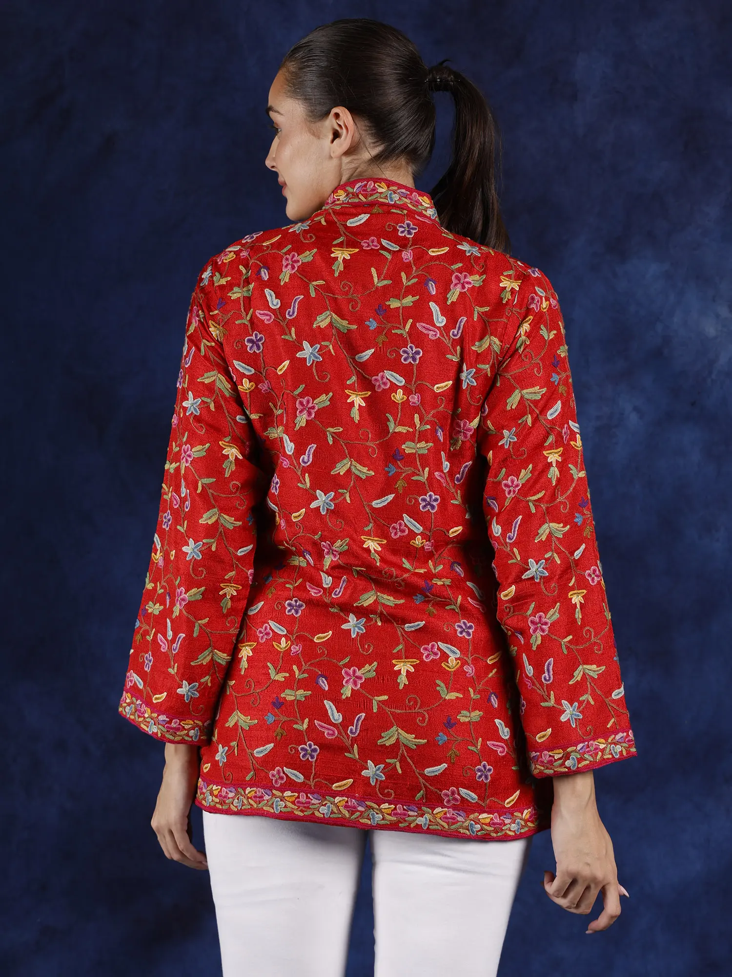 Immerse yourself in the exquisite artistry of Kashmir with this stunning short jacket, a true testament to traditional hand embroidery. Crafted from the finest pure silk, this piece offers a luxurious feel against the skin and a beautiful drape that enhances its elegant silhouette. The vibrant true-red hue serves as a perfect canvas for the intricate floral vine embroidery that adorns the entire jacket.