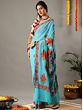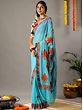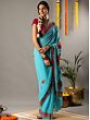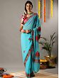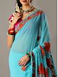 If you have flair for understated style, this turquoise georgette saree, embellished with Aari work is the drape for you. The dreamy blue hue of georgette is intricately detailed with Aari embroidery on the border, which is complemented by enchanting Chinar motifs on the pallu. The Chinar leaf motif is a classic element in Kashmiri embroidery, a representative of the life and culture of the weavers, for whom Chinar leaves carpeting the snowed valleys of Kashmir are a symbol of natural beauty.