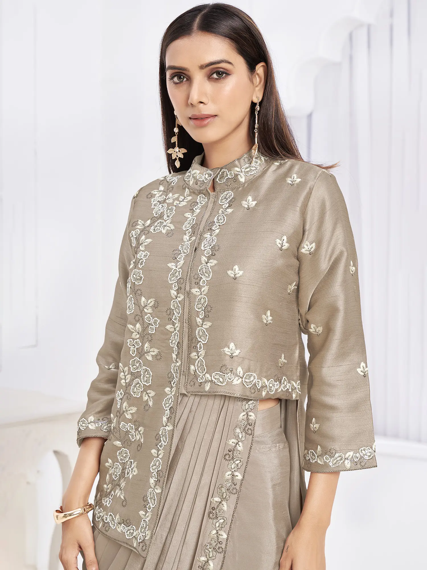 Tussar Silk Embroidery And Handwork Designer Saree With Blouse And Jacket
