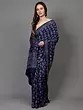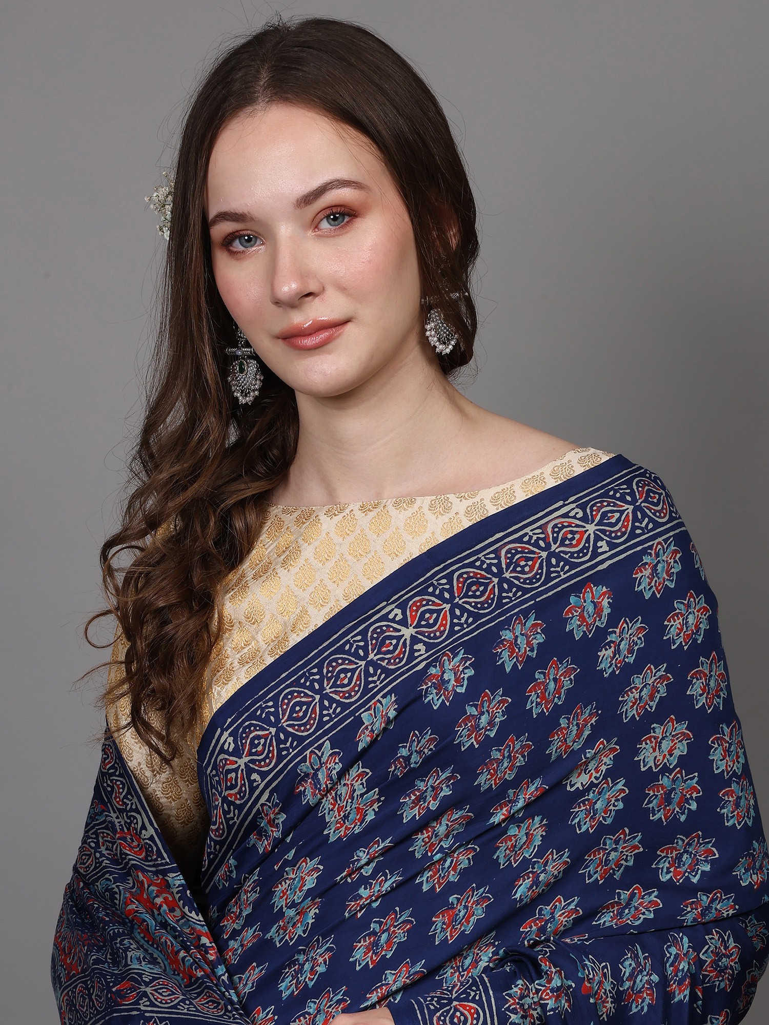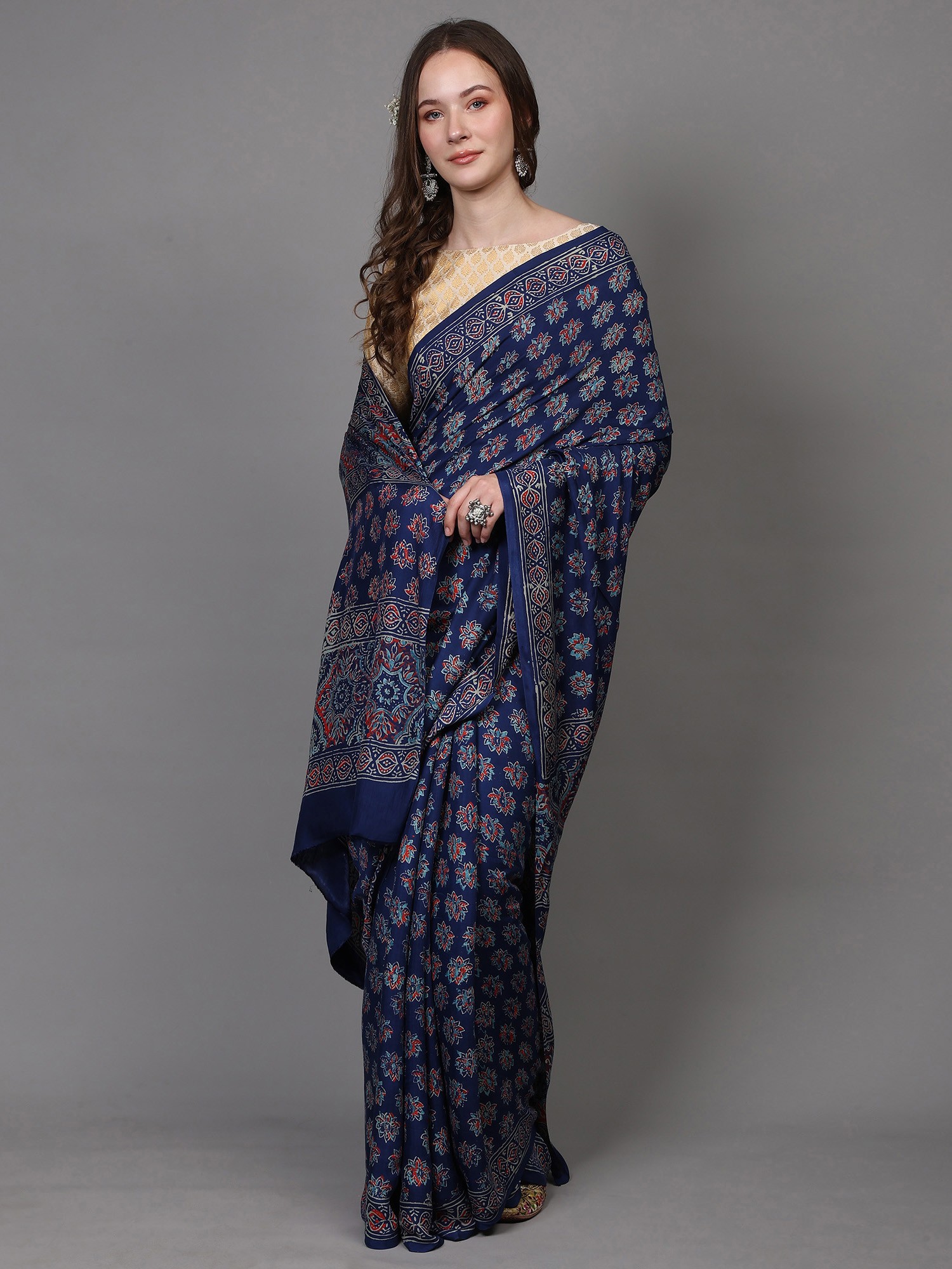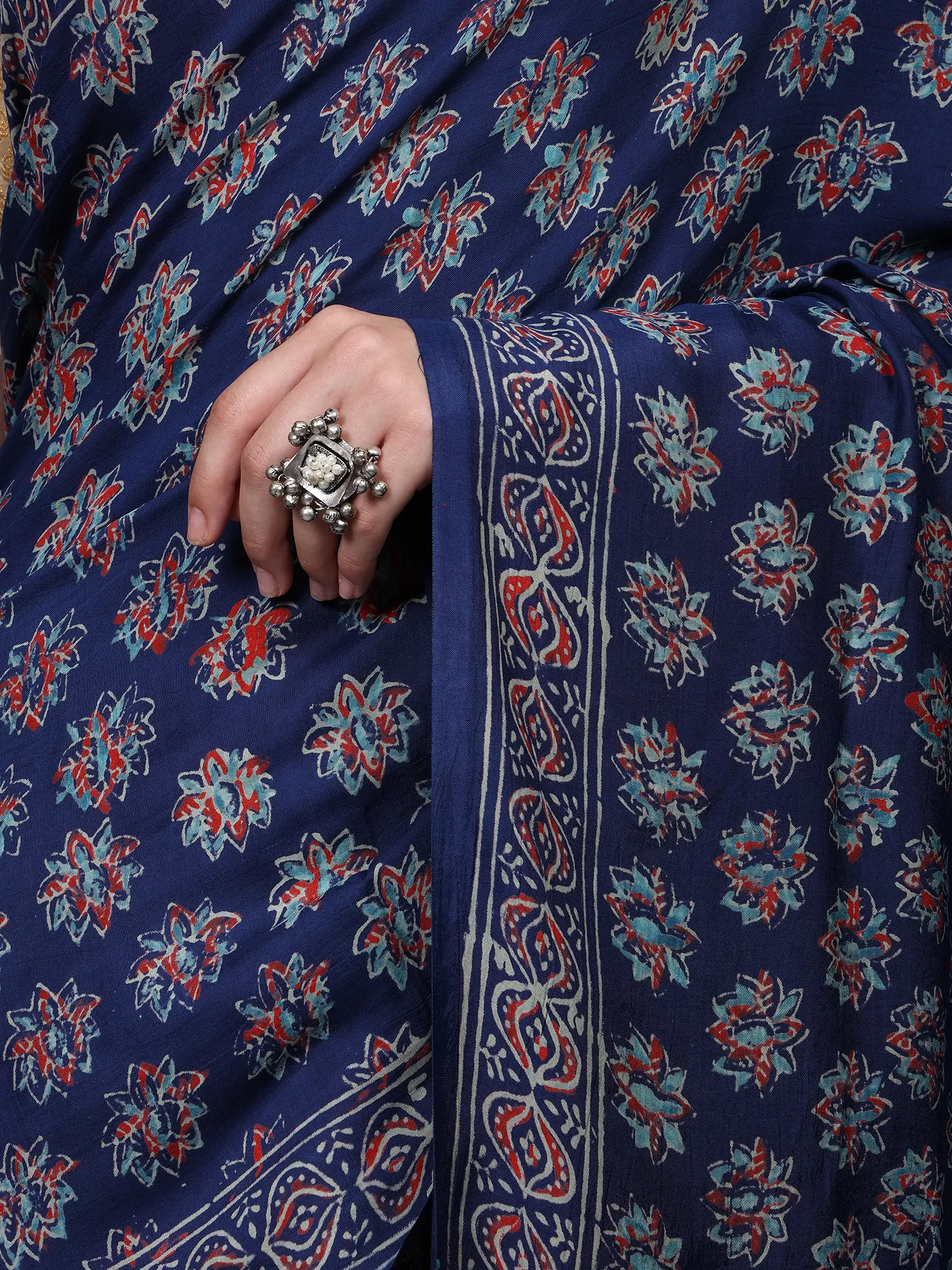 Blue-Depths Saree with Block Printed Floral Leaves All-Over from Madhya Pradesh