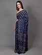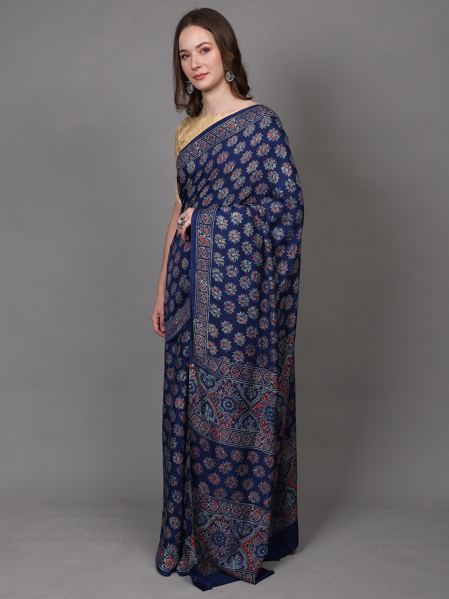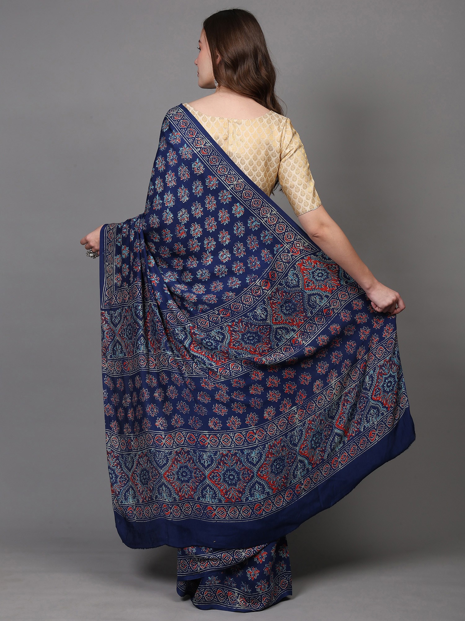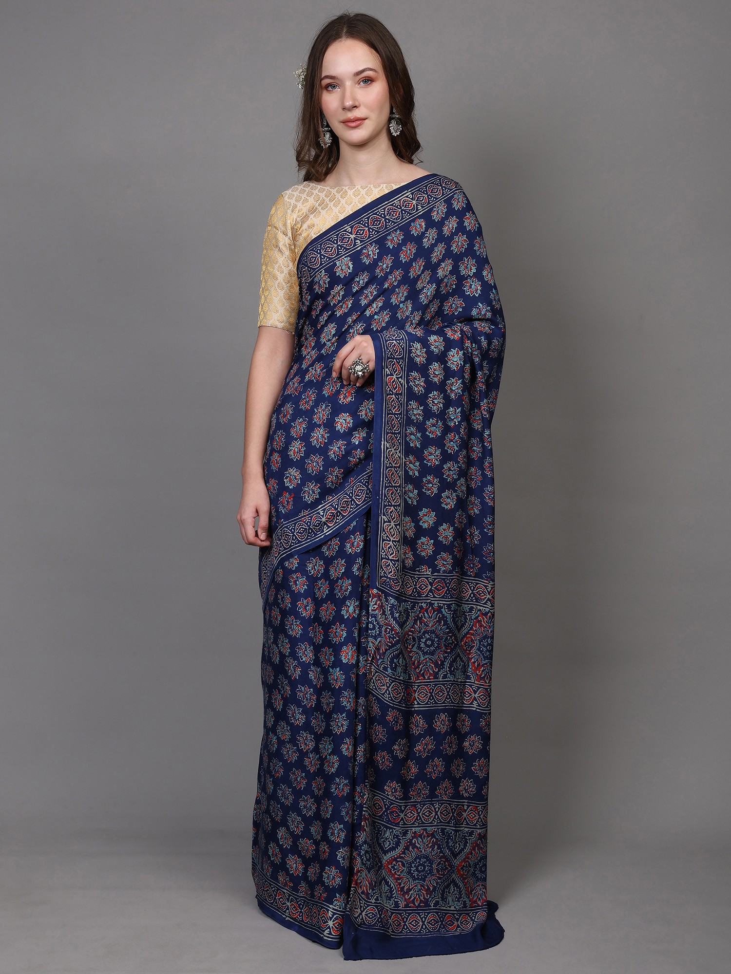 Blue-Depths Saree with Block Printed Floral Leaves All-Over from Madhya Pradesh