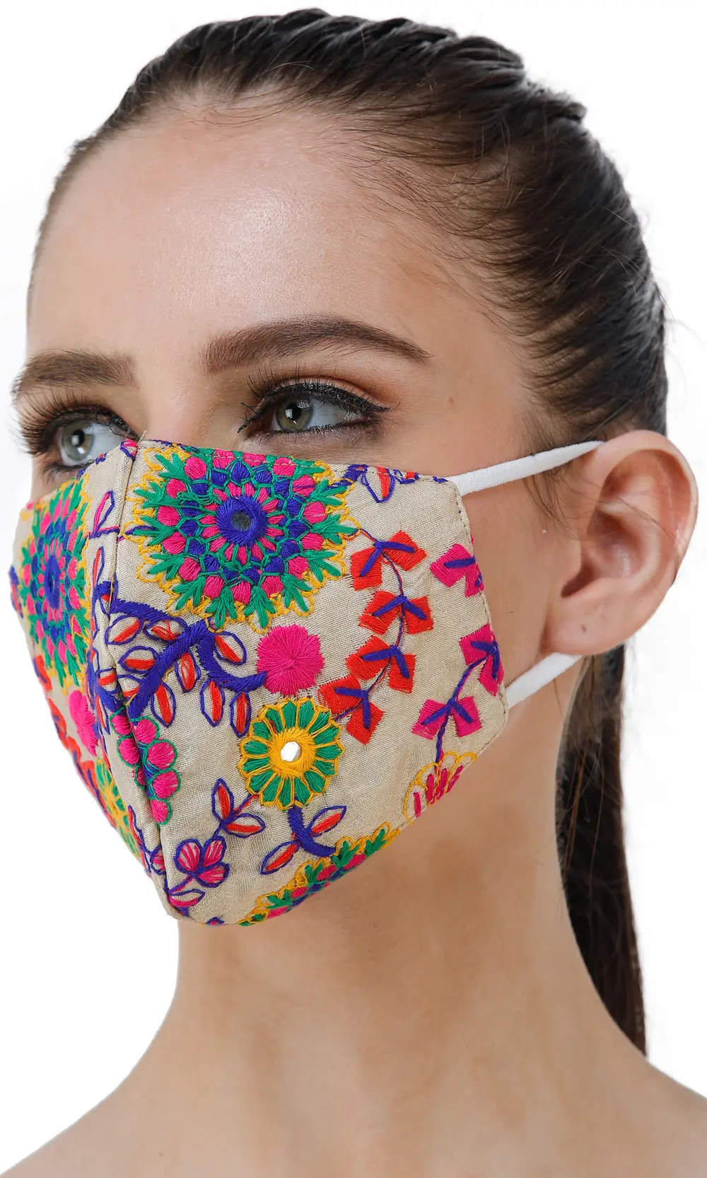 Made from luxurious art silk, this mask embraces comfort while elevating your style effortlessly. Enchant your surroundings with every step, adorned in floral fantasies and mirrored dreams.