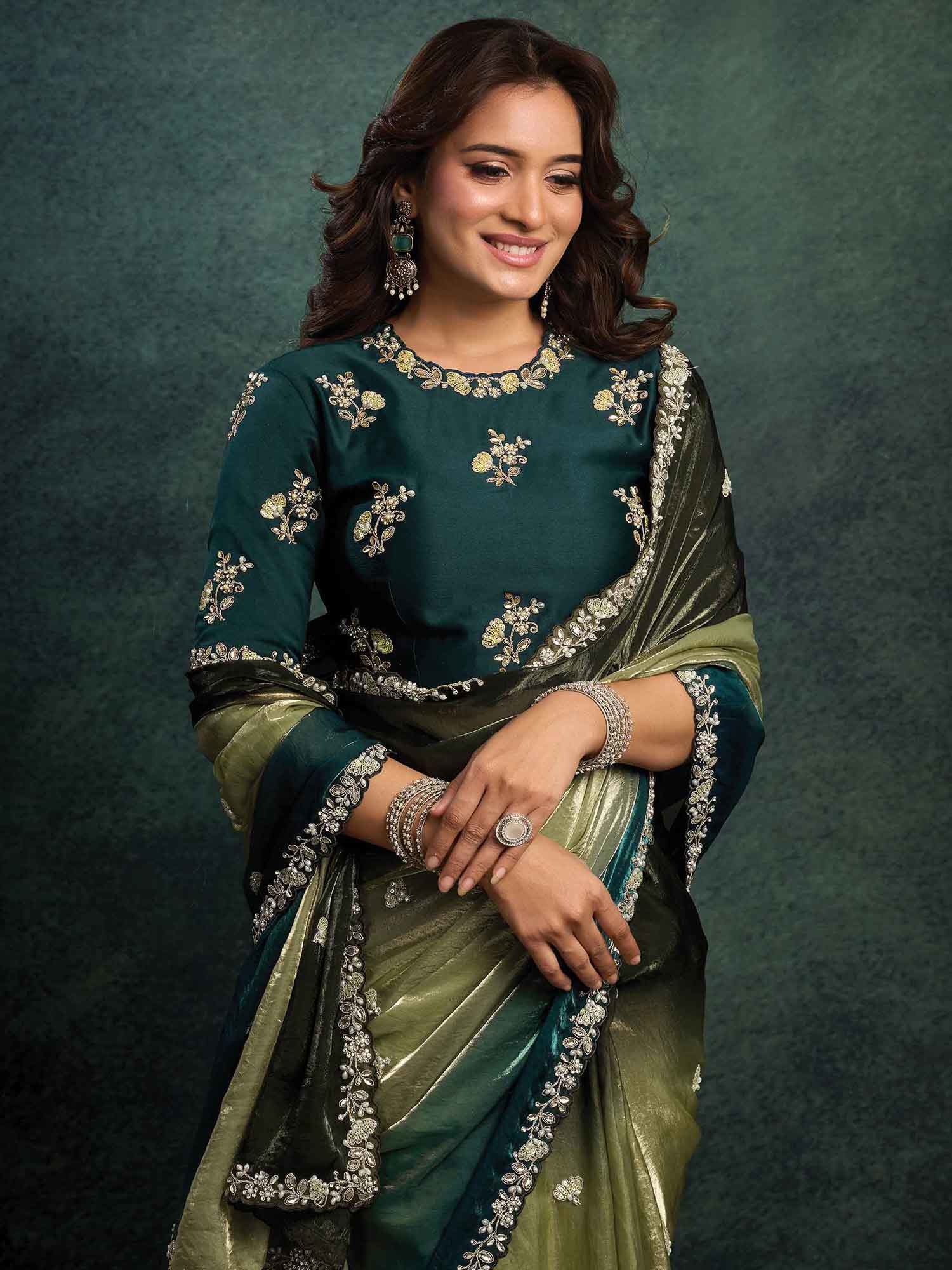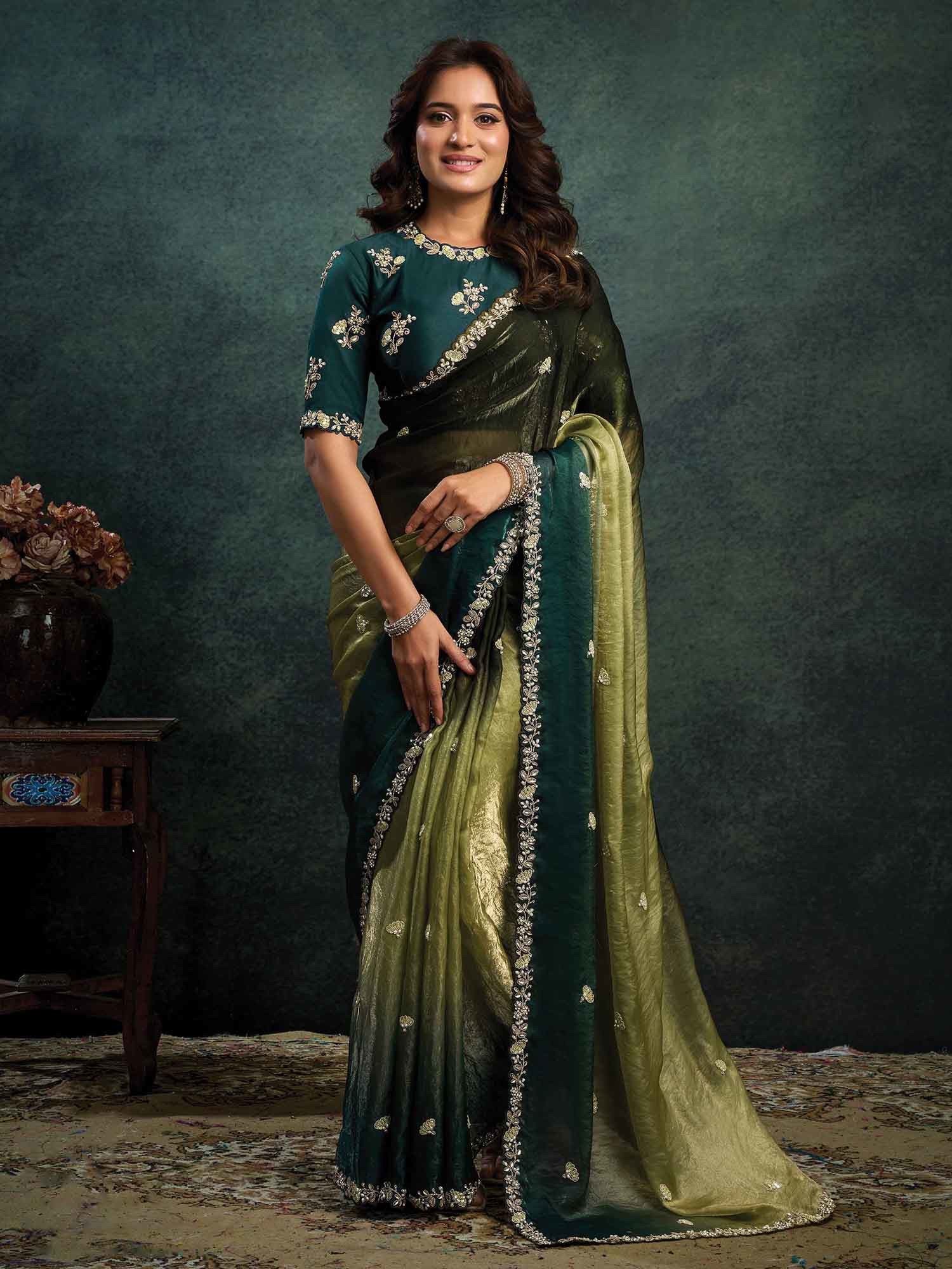 Two Tone Satin Silk Saree With Sequins Embroidery Multi Stone And Handwork Designer Party Wear Saree For Women