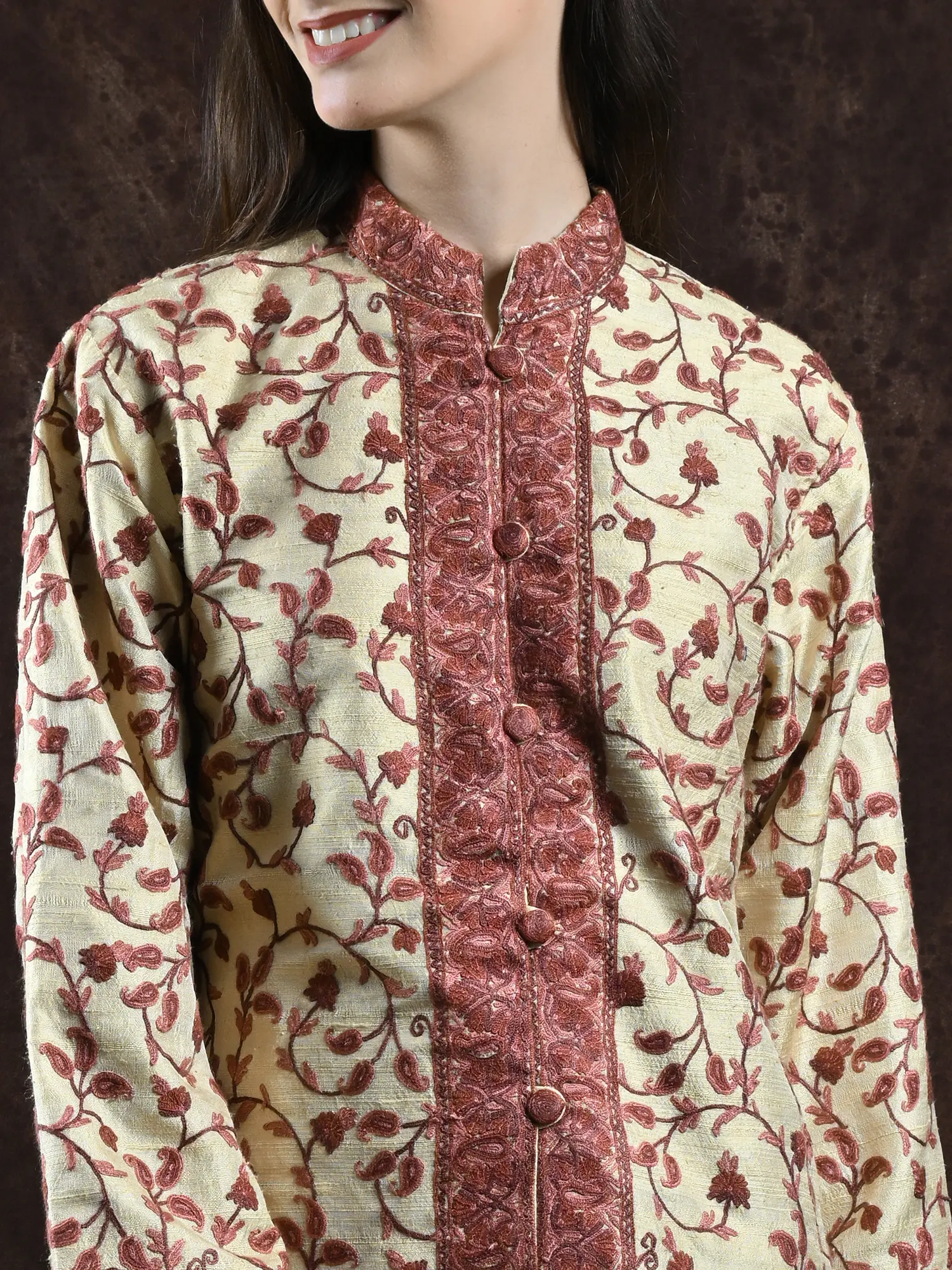 Frosted-Almond Kashmiri Long Jacket with Aari Embroidered Flowers in Multicolor Thread