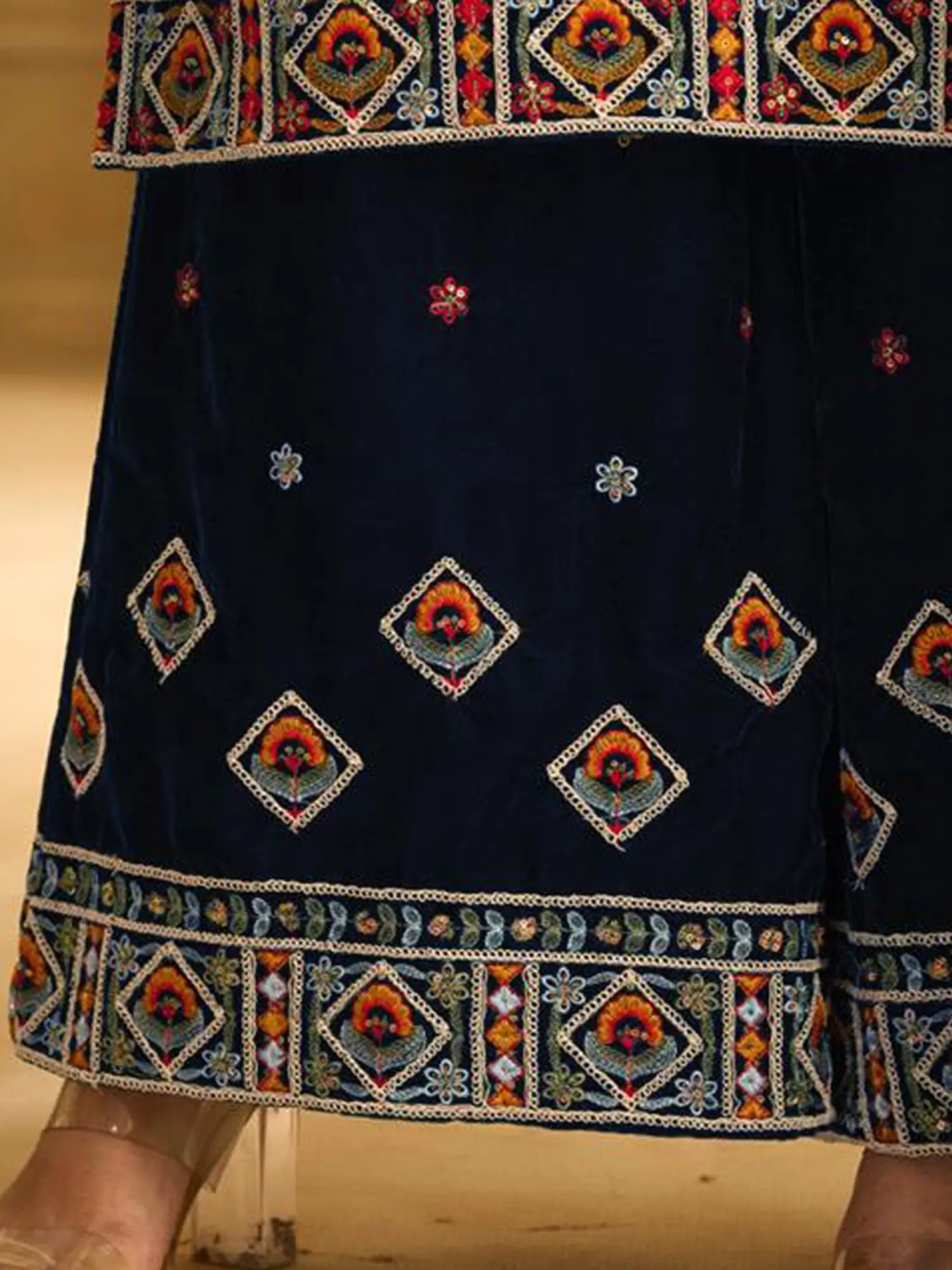 The true masterpiece lies in the details. The neckline and yoke are adorned with meticulous bead embroidery and delicate sequins work. This handcrafted artistry elevates the ensemble to a work of art, showcasing the skill and dedication of the artisans. The embroidery features a vibrant palette of colors that dance across the dark backdrop. Further down, both the main piece and the palazzo pants incorporate intricate geometric patterns, bordered on top and bottom with elegant beading and tiny shimmering sequins. The dupatta mirrors these patterns, giving an overall sense of refinement. The interplay of textures and embellishments creates a mesmerizing effect, catching the light with every movement. This attention to detail ensures that you'll stand out from the crowd, captivating onlookers with your impeccable taste.