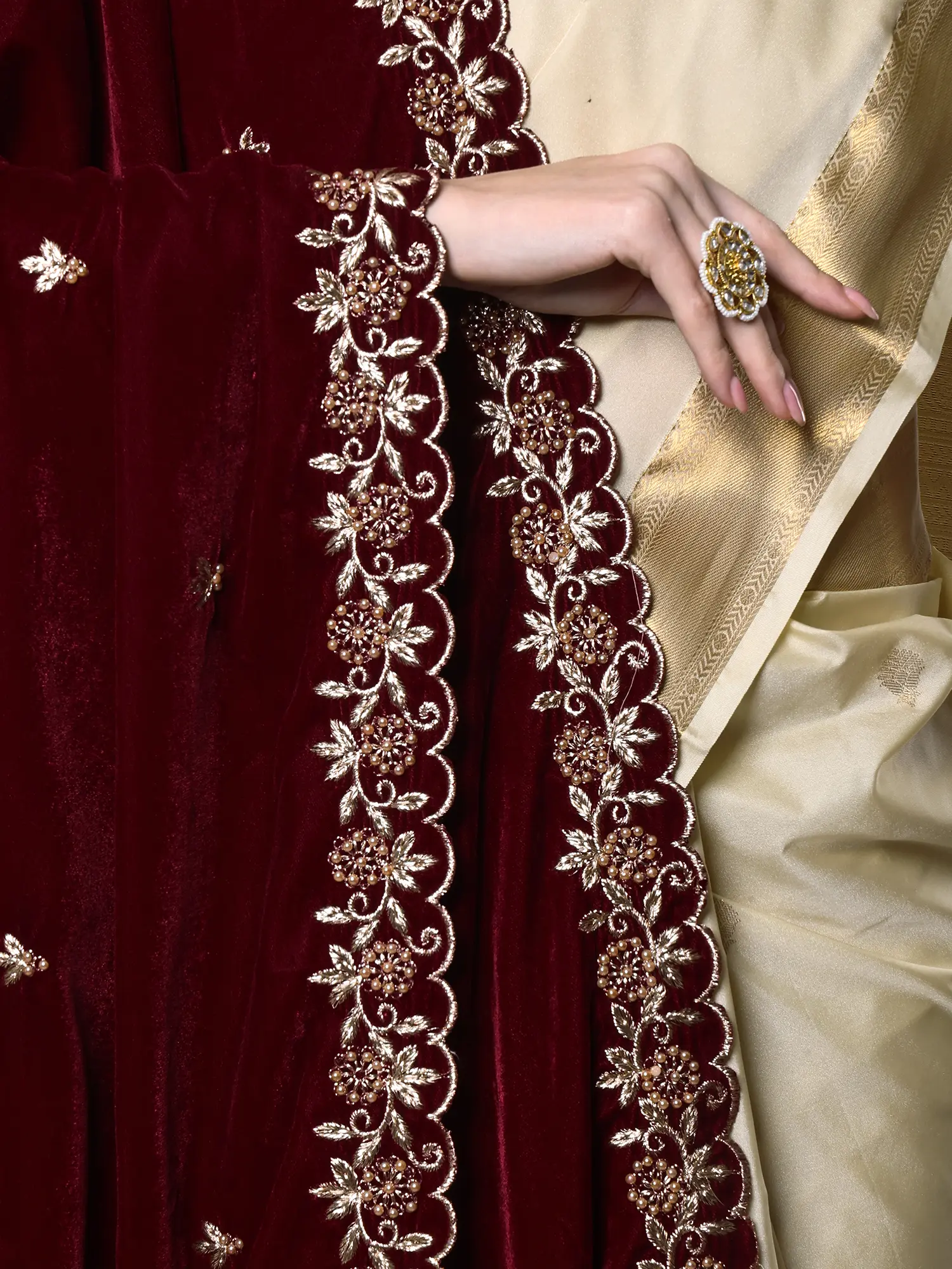 Velvet Dupatta with Zari-Sequins Embroidered Floral Vines and Scalloped Border from Amritsar