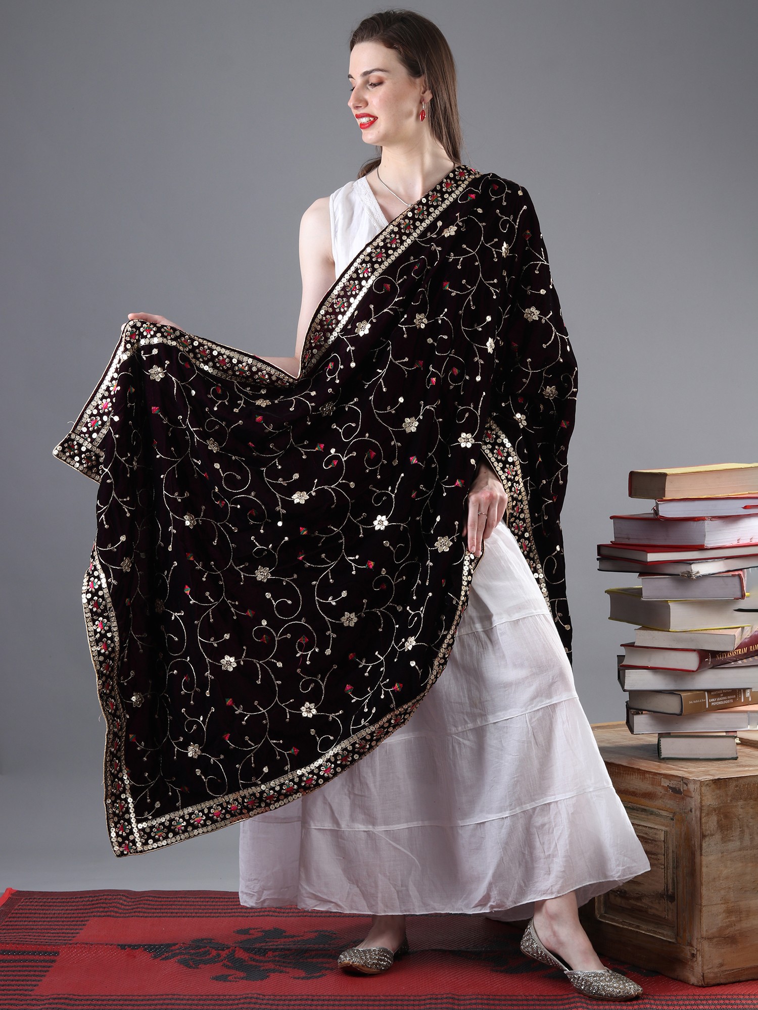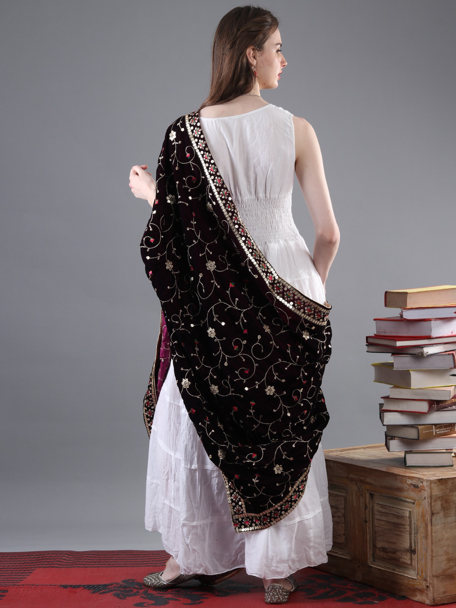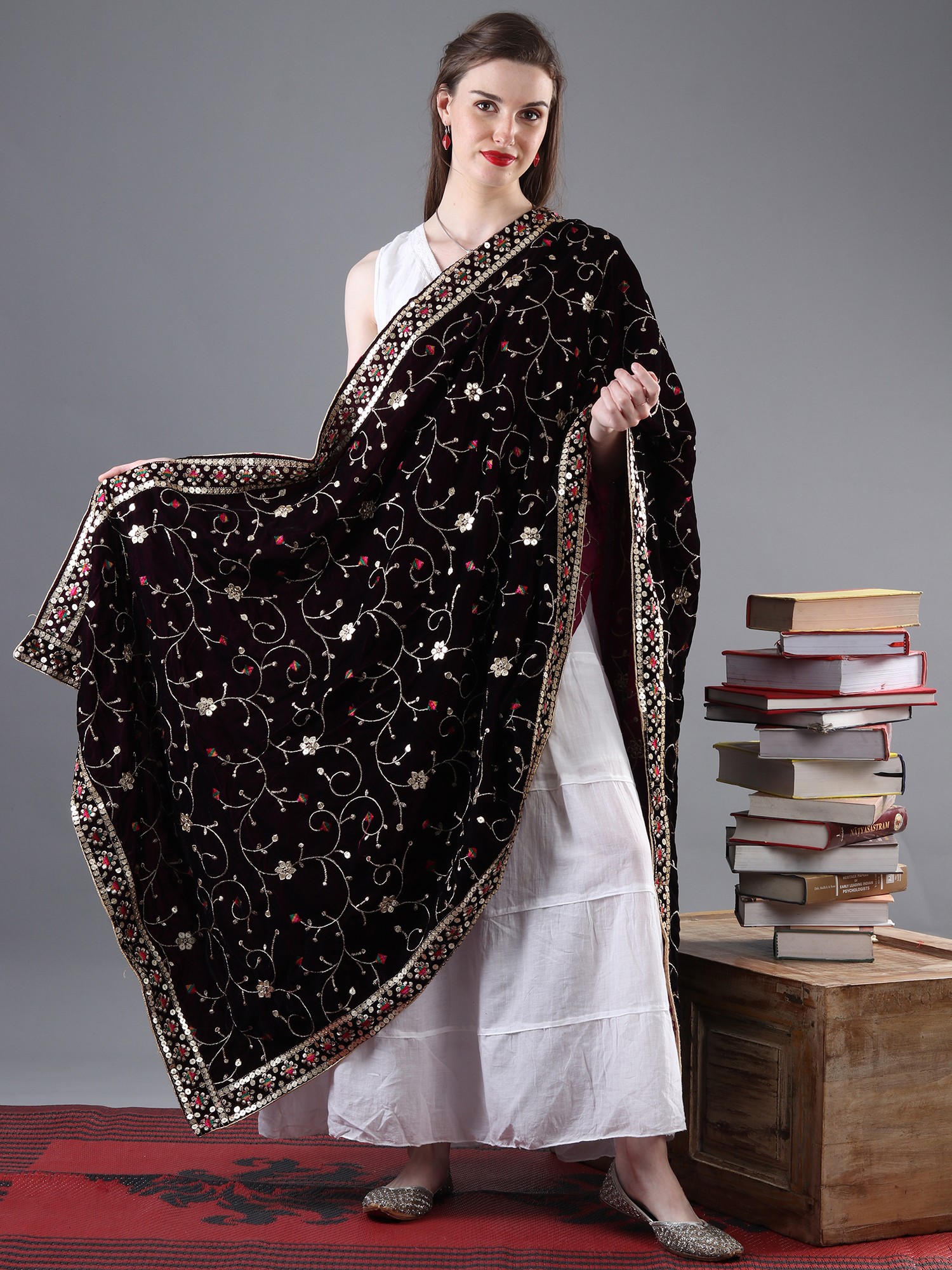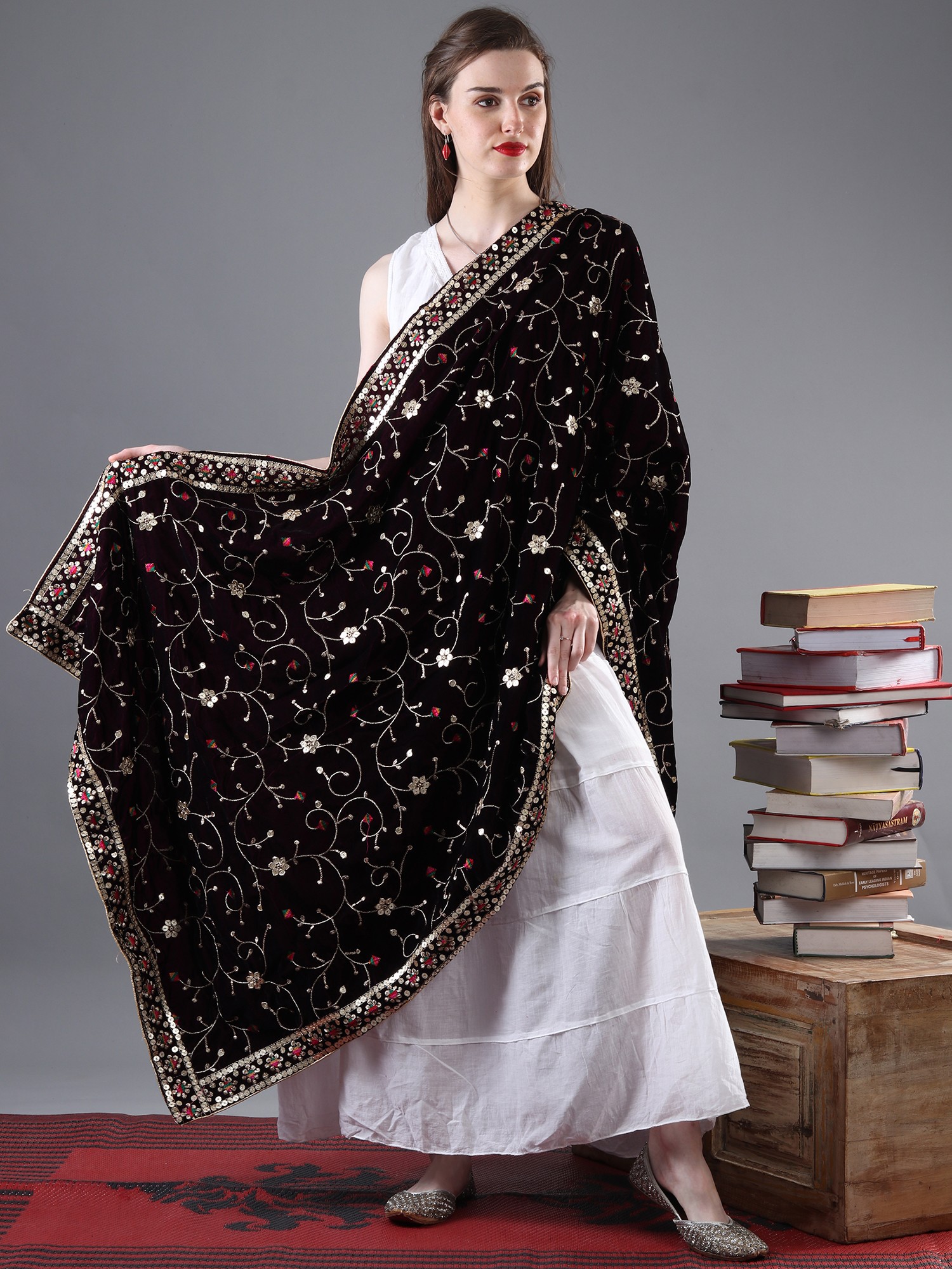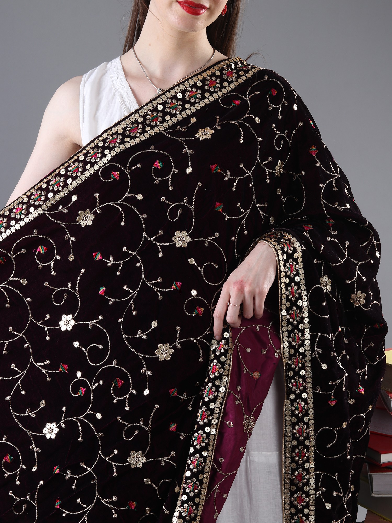 From the cultural hub of Amritsar, comes a velvet dupatta adorned with zari and sequinned flower bail embroidered. The velvety texture is an embrace of luxury, and the flower embroidered bail, resplendent with shimmering zari and sequins, exudes a regal allure. Draping this exquisite piece is akin to wearing a work of art, a harmonious blend of tradition and modernity that represents the fine craftsmanship of Amritsar. This is more than just an accessory; it's a tangible connection to a rich cultural heritage and a symbol of enduring elegance.