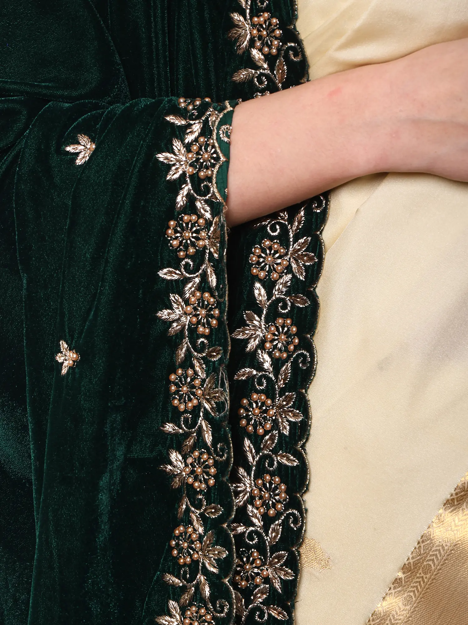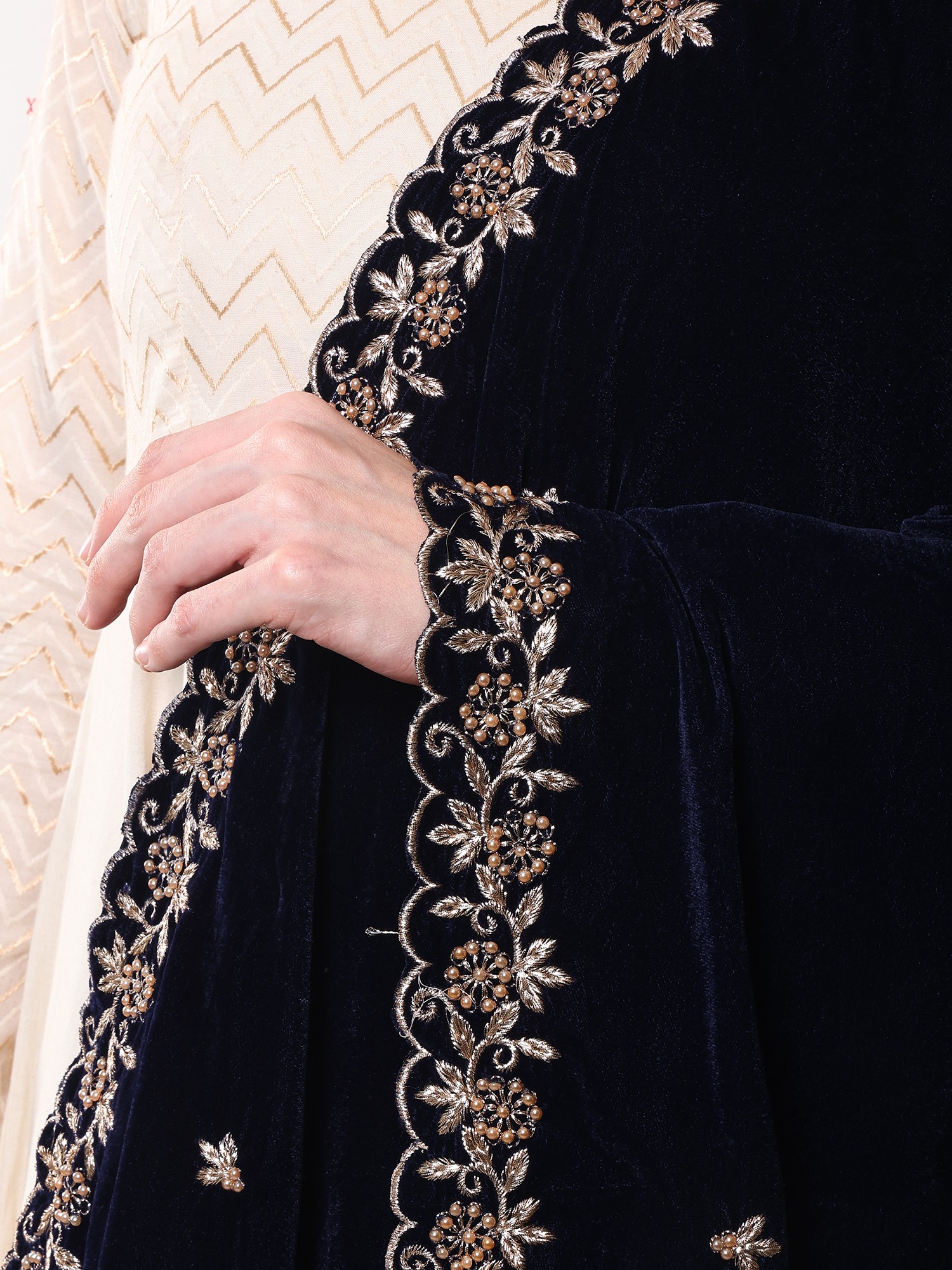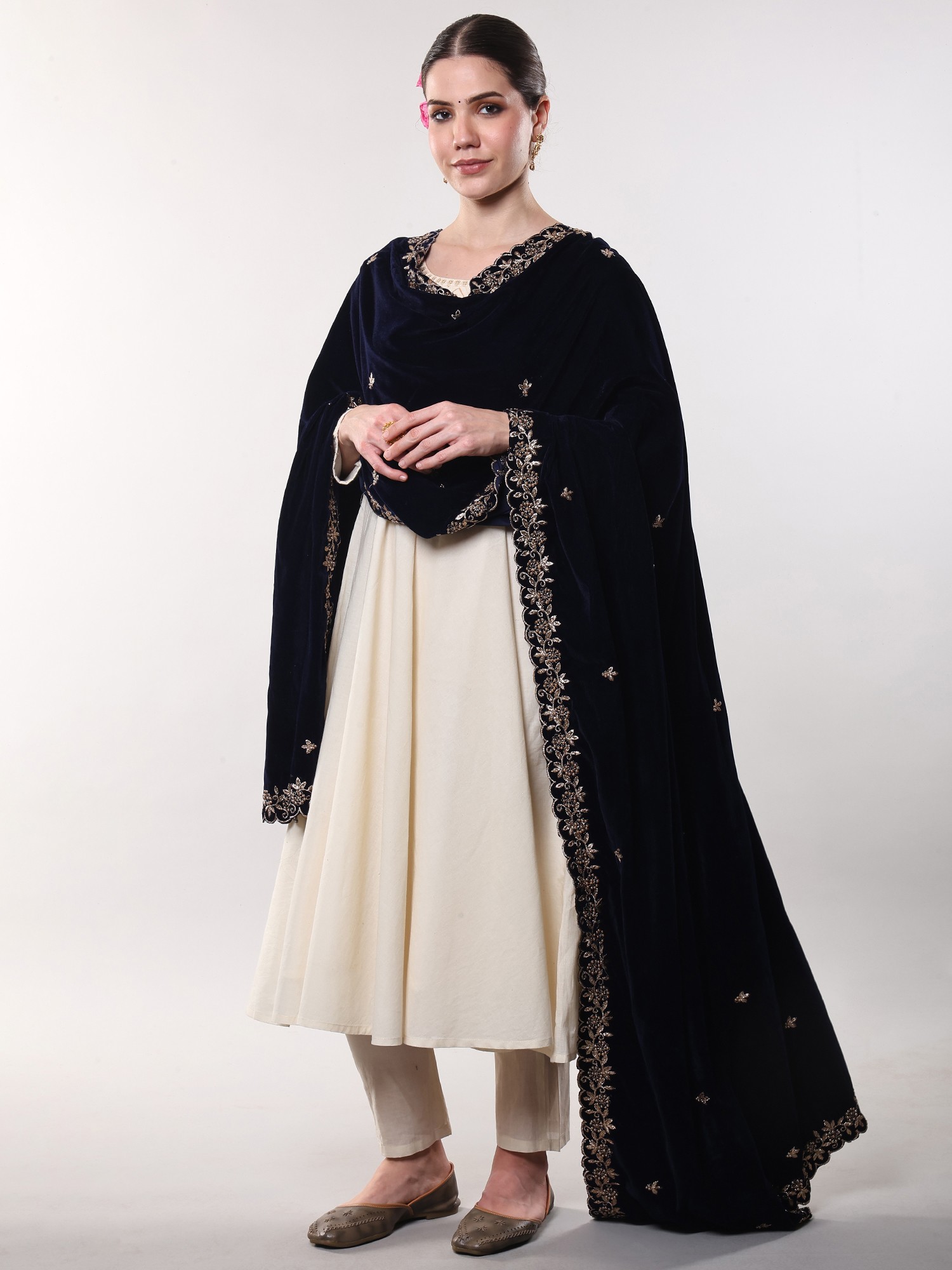 Each one is brought to life from sumptuously soft velvet, a material chosen for its inherent richness and luxurious drape. The intricate embroidery, featuring delicate zari-beads arranged in charming bootis and a captivating floral vine pattern along the scalloped border, is meticulously hand-applied by skilled artisans. This dedication to detail ensures that you possess not merely an accessory, but a wearable work of art, a testament to generations of artisanal heritage.