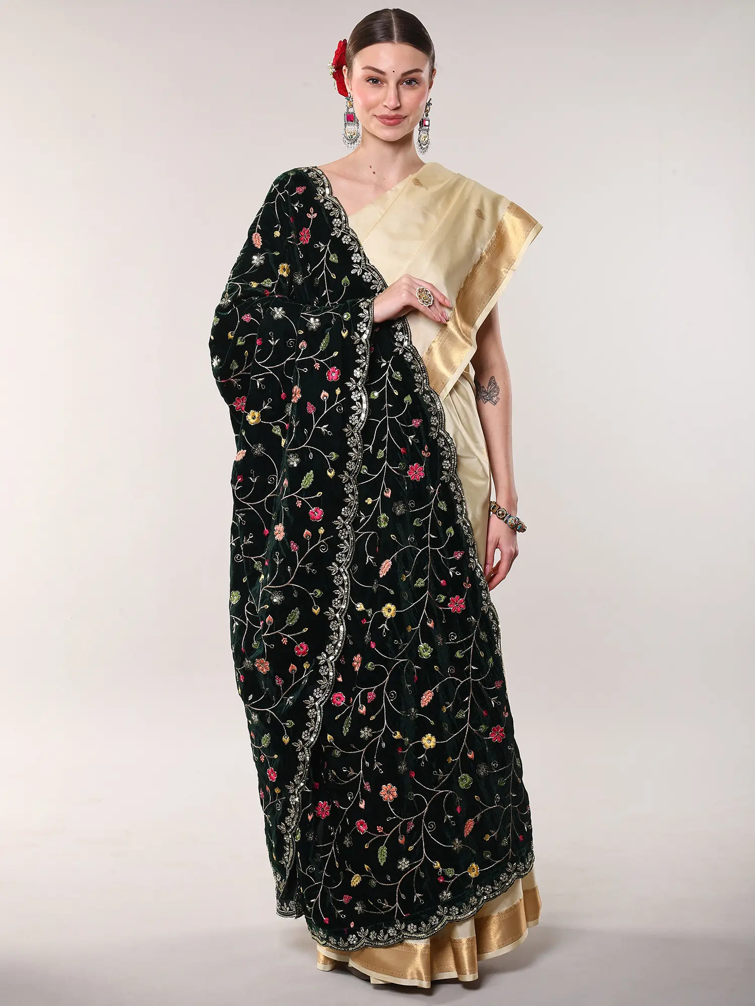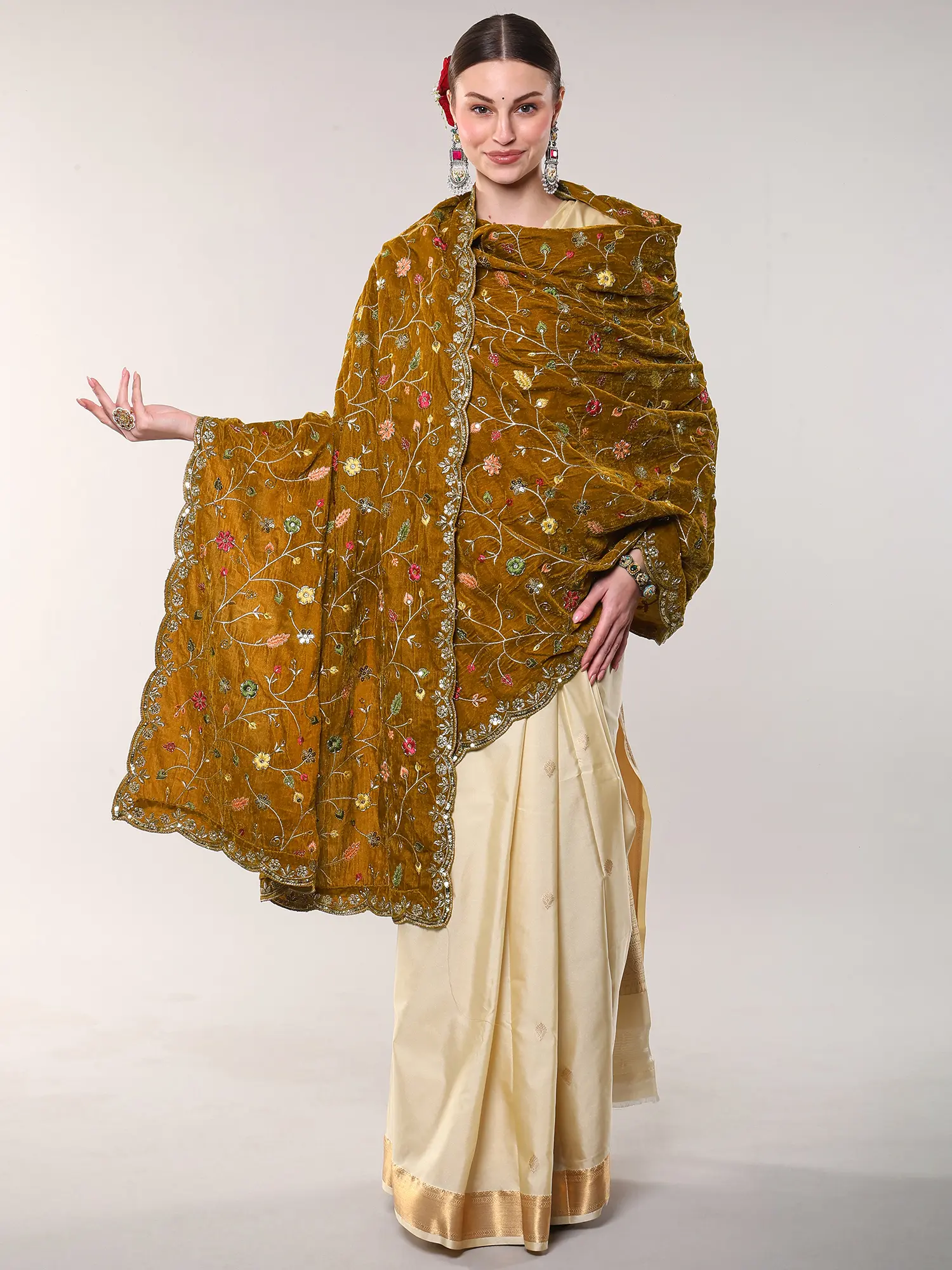 The rich, warm hue of the velvet serves as a perfect canvas for the intricate tapestry of embroidered floral vines that gracefully unfurl across its expanse. Edged with a finely scalloped border, further embellished with sparkling sequins, this creation captures the light with every movement. Its generous proportions provide a fluid drape, allowing for versatile styling options that enhance your silhouette.