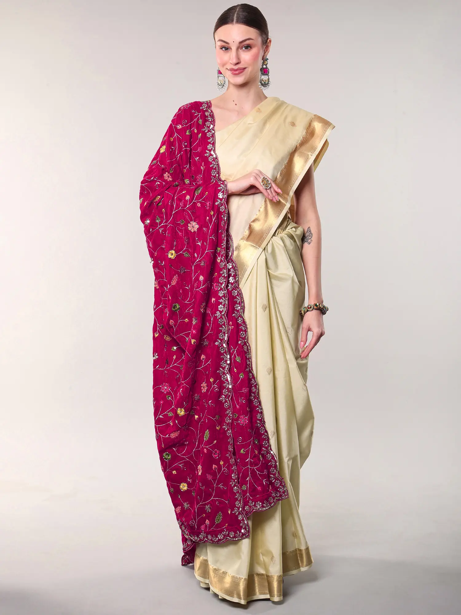 Imagine draping this exquisite accent over a simple silk kurta for a sophisticated daytime look, or pairing it with a formal lehenga for an unforgettable evening. It effortlessly transforms a classic saree into a statement piece, adding a layer of regal charm. Its versatility makes it a cherished addition to your wardrobe, ready for any occasion that calls for understated glamour.