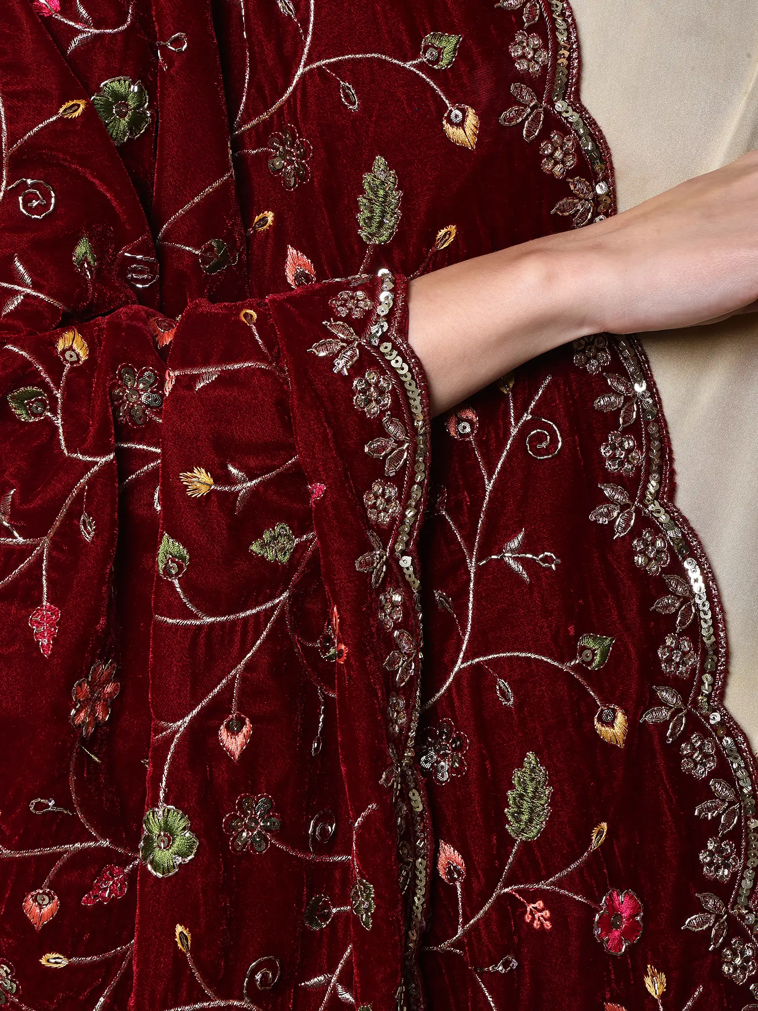 Velvet Dupatta with Zari-Sequins Embroidered Floral Vines and Scalloped Border from Amritsar