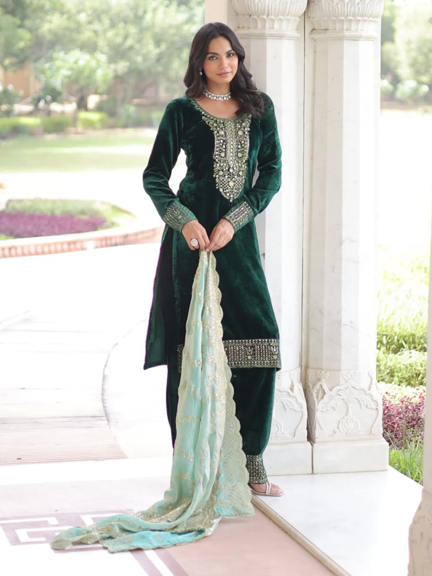 To preserve the exquisite sheen of the velvet and the brilliance of the embellishments, we recommend professional dry cleaning. Handle with care and store in a breathable garment bag to protect its delicate artistry. With proper maintenance, this ensemble will remain a treasured piece in your wardrobe, ready to bring its captivating allure to countless future celebrations.