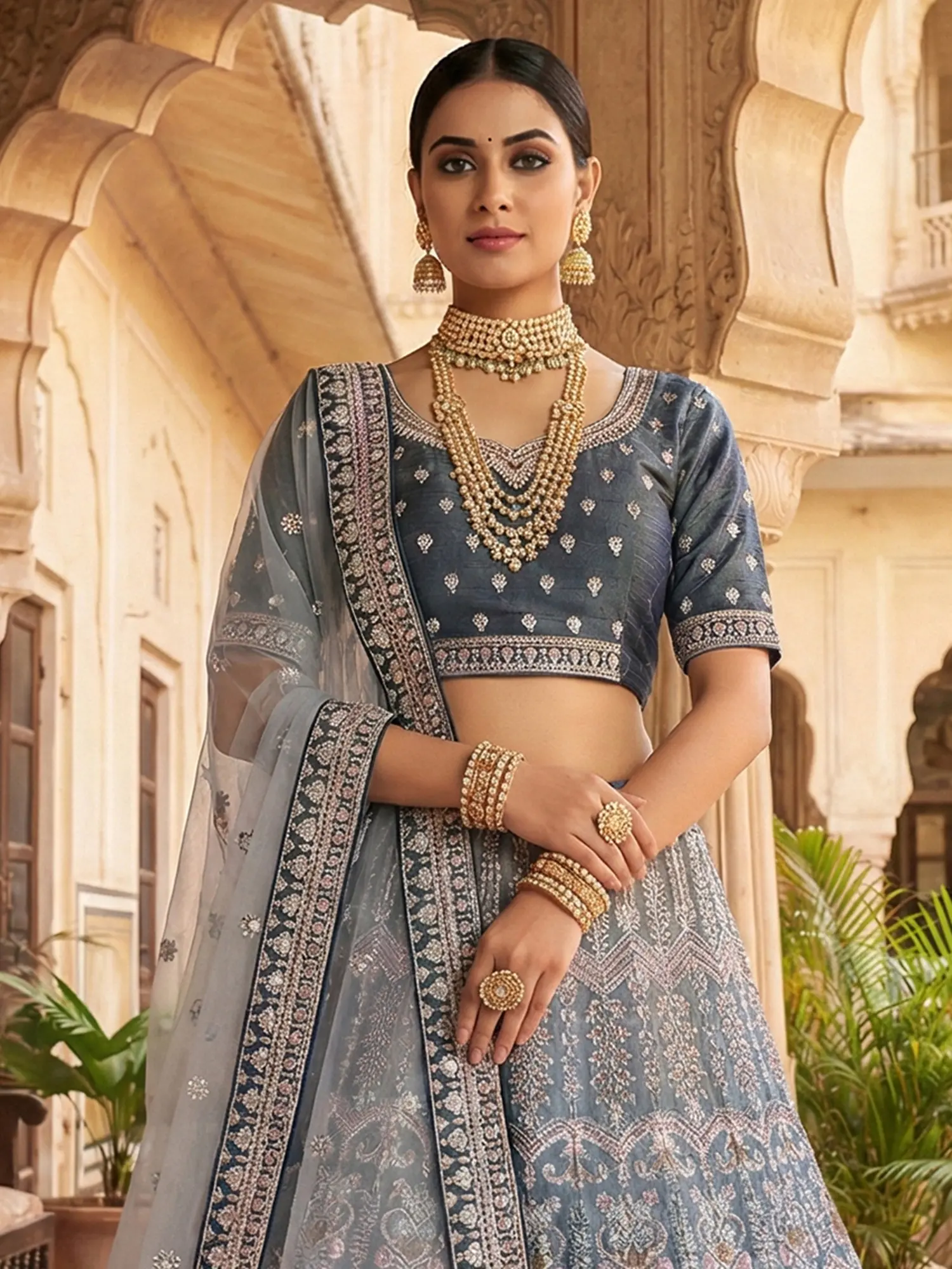 Stunning Lehenga Set In Two Tone Cotton Organza Silk With Intricate Zari And Sequence Embroidery For Celebrations