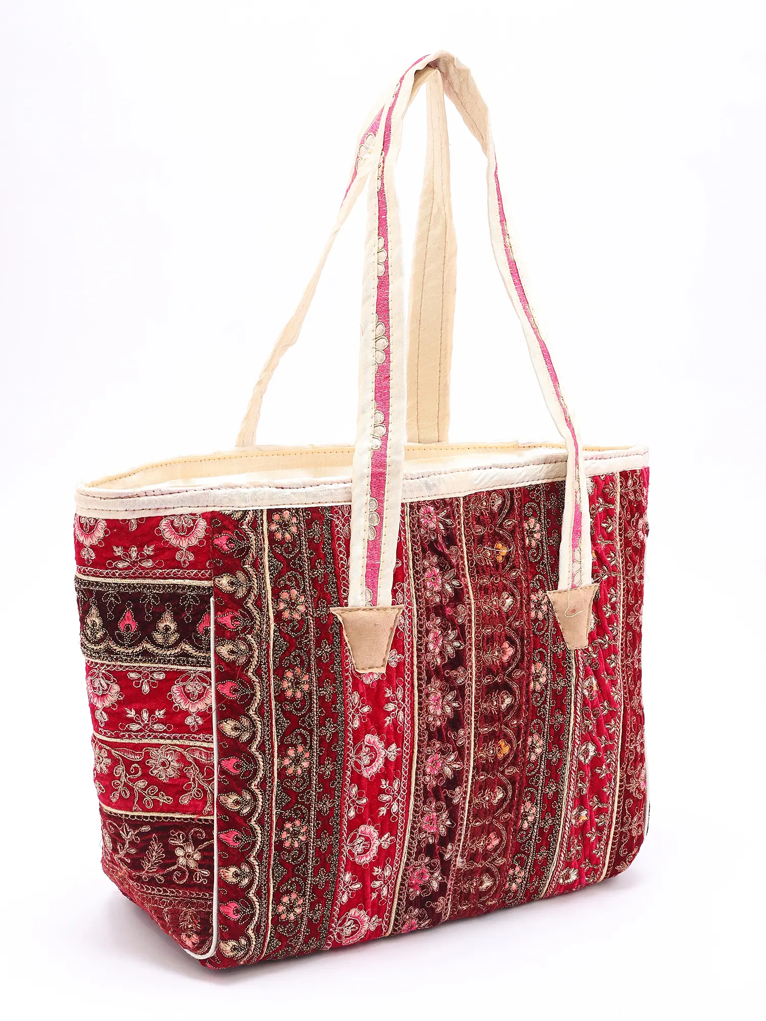The foundation of this luxurious tote is sumptuously soft velvet, providing a rich backdrop for the dazzling floral motifs. Adorning the velvet are delicate Zari threads, a type of metallic embroidery that lends a brilliant shimmer and an air of opulence. The intricate floral patterns, rendered in shades of crimson, rose, and touches of warm orange, are not just decorative; they are a language of nature woven into fabric, evoking the beauty of blooming gardens and verdant landscapes. The patchwork design creates a dynamic visual appeal, with vertical strips of varying velvet textures and embroidery styles, each panel complementing the other to form a harmonious and eye-catching composition.