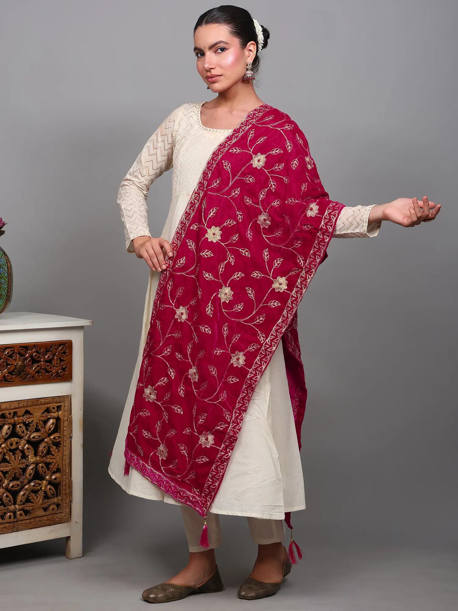 Elevate your ethnic wardrobe with this stunning velvet stole, a masterpiece of traditional craftsmanship. Infused with the rich heritage of Amritsar, this stole is a testament to exquisite detail and luxurious comfort. The deep, vibrant red hue of the velvet provides a dramatic backdrop for the intricately embroidered floral vine, which seems to unfurl gracefully across its surface. Each bloom and leaf is meticulously rendered with delicate golden threads, catching the light and adding a subtle shimmer that speaks of understated opulence.
