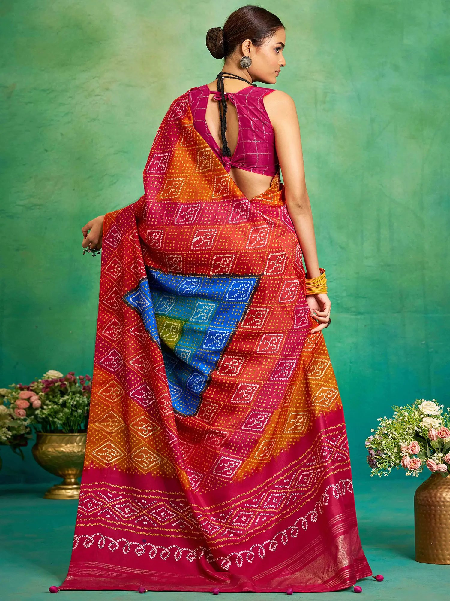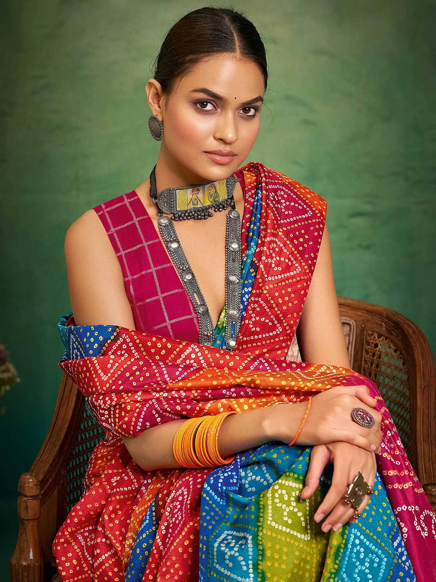 The interplay of vibrant hues – from deep emerald greens and sapphire blues to striking fuchsias and sunny yellows – creates a mesmerizing visual spectacle. Each section of the fabric showcases intricate, meticulously printed Bandhani patterns, a traditional Indian tie-dye art form reimagined. The overall effect is a dynamic mosaic, alive with a playful yet sophisticated spirit, making a bold statement without overwhelming.