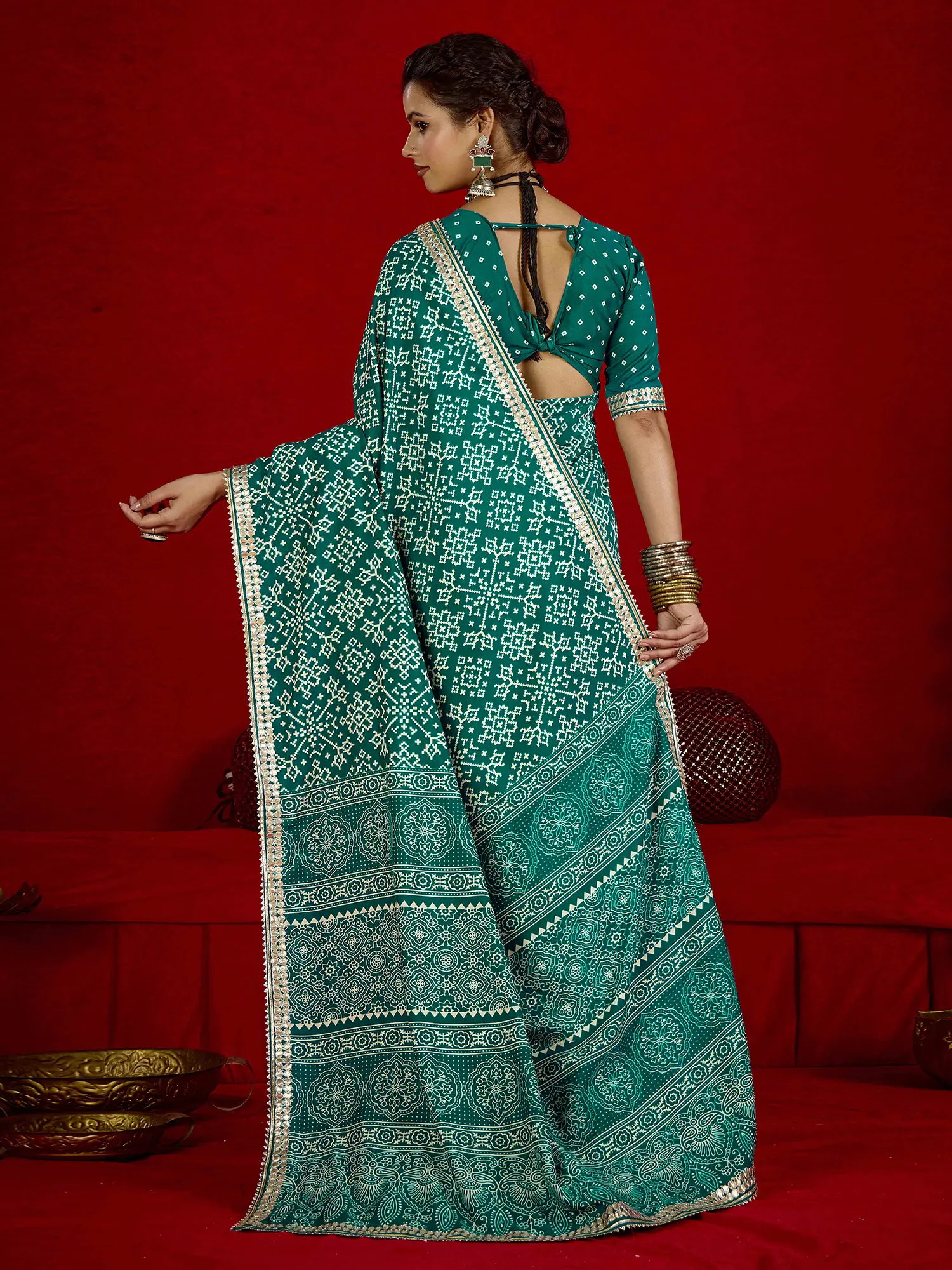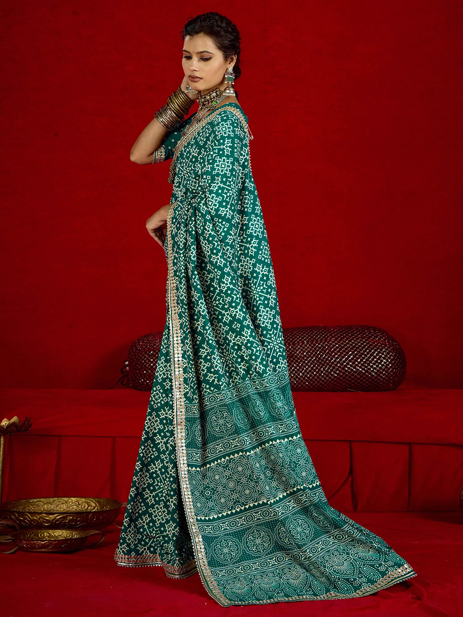 The deep, alluring green provides a stunning canvas for the crisp, boutique prints that adorn its expanse. You'll appreciate the delicate contrast, highlighted by an exquisite lace border that frames the silhouette with shimmering sophistication. The accompanying blouse and underskirt are tailor-made to perfectly complement your form, ensuring a flawless and harmonious ensemble.