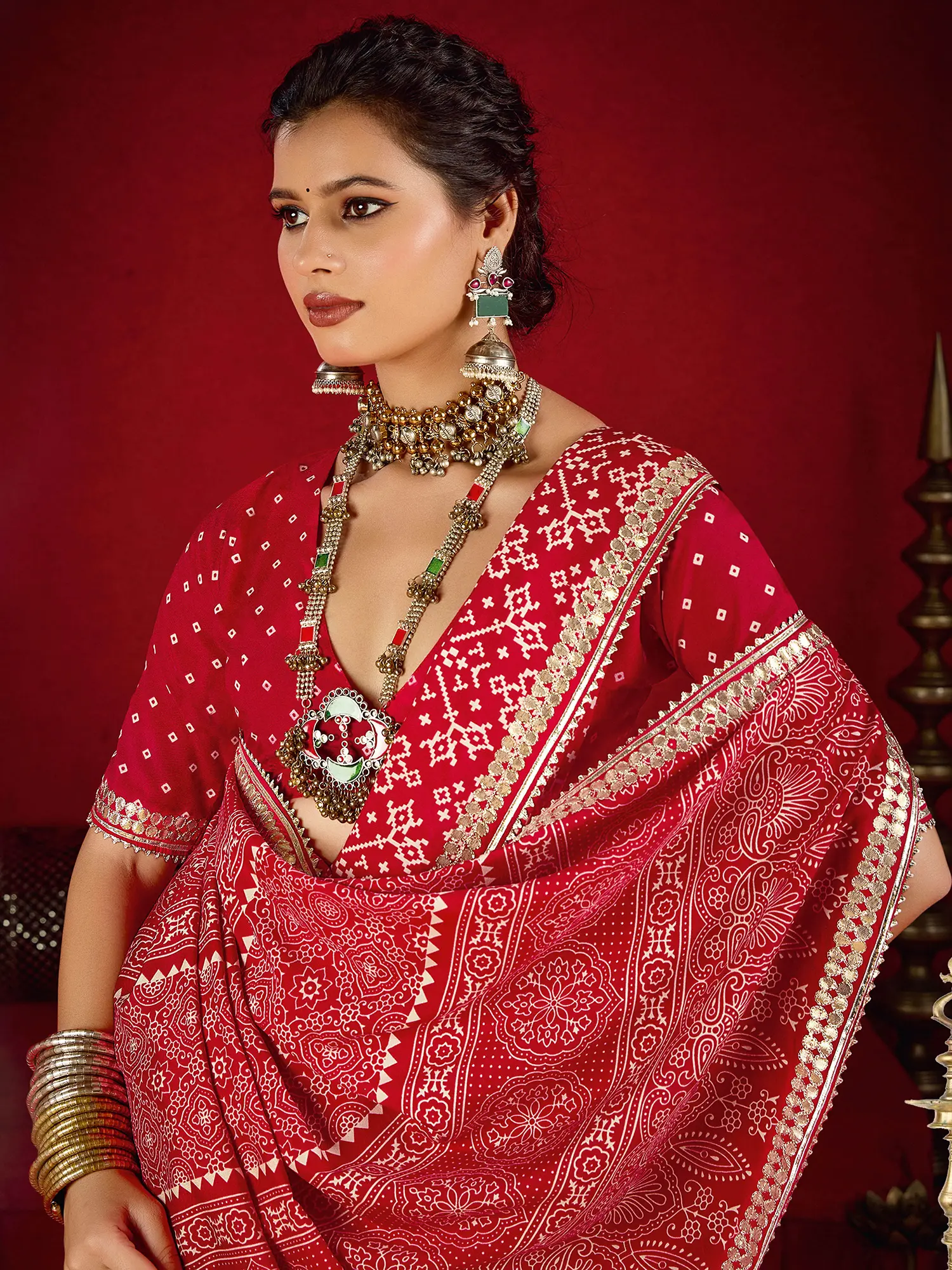 Commanding attention with its vibrant hue and intricate detailing, this masterpiece is designed to make you the center of every celebration. Its luxurious drape and exquisite design promise to elevate your presence, ensuring you radiate confidence and timeless elegance at any festive gathering or wedding.