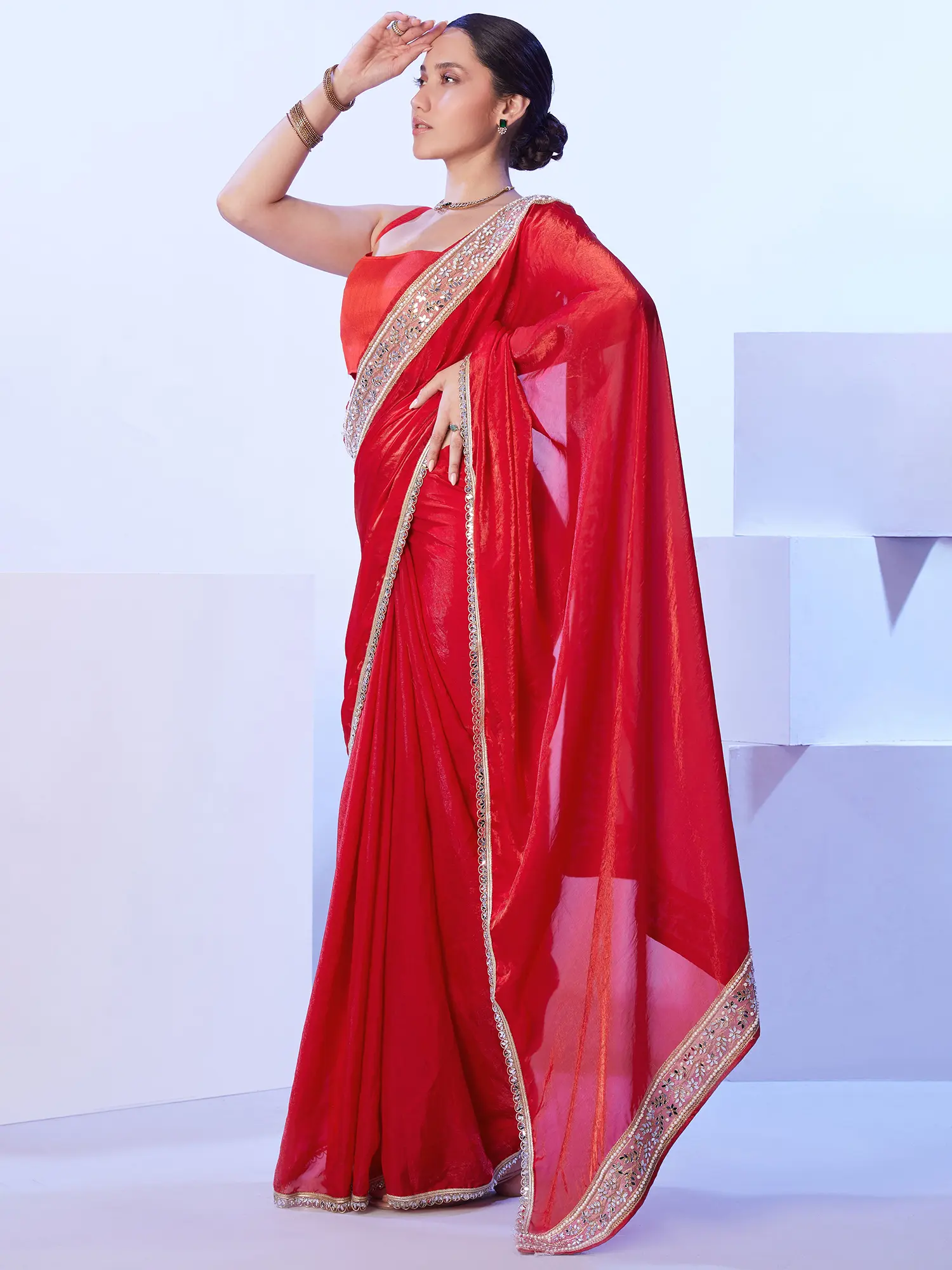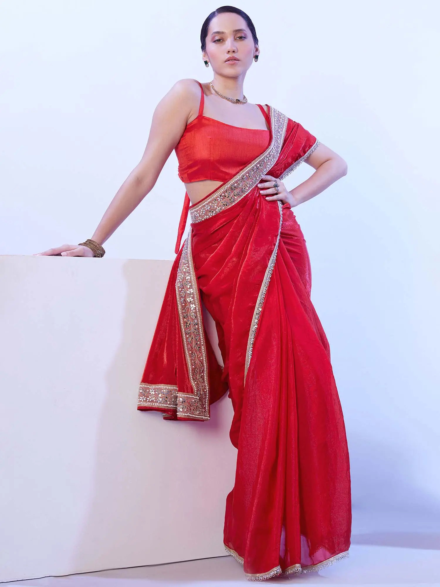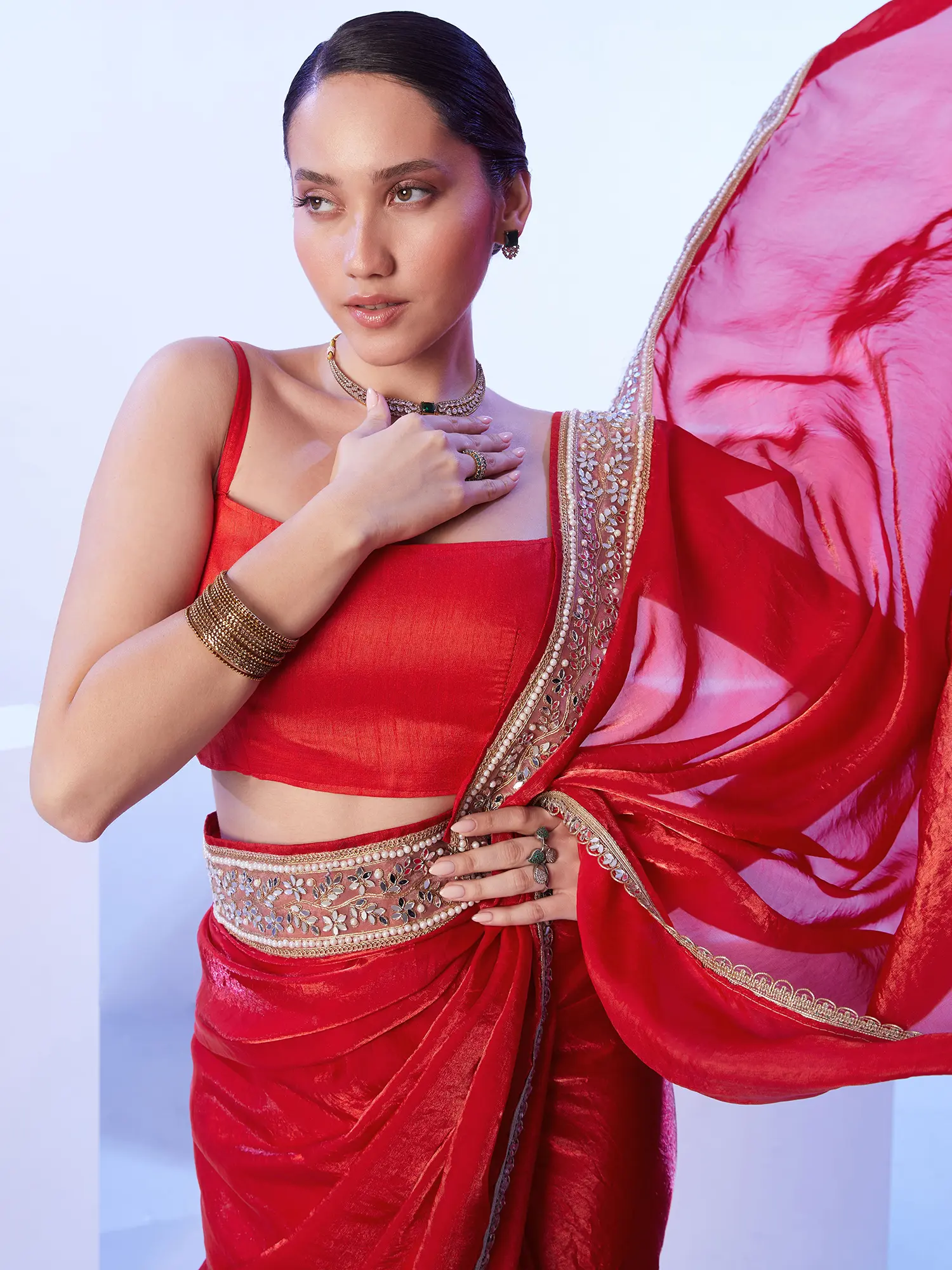 The saree’s solid color allows the exquisite lacework and embellishments to truly shine. The Venetian-red is a timeless classic that complements a wide range of skin tones and effortlessly elevates your style. The fabric itself is incredibly soft and comfortable against the skin, ensuring you feel as confident as you look. The elegant drape of the satin Jimmy Choo material moves gracefully with your every step, adding a touch of fluidity and allure to your presence. The designer blouse complements the saree perfectly, enhancing the overall aesthetic cohesiveness and luxurious feel.