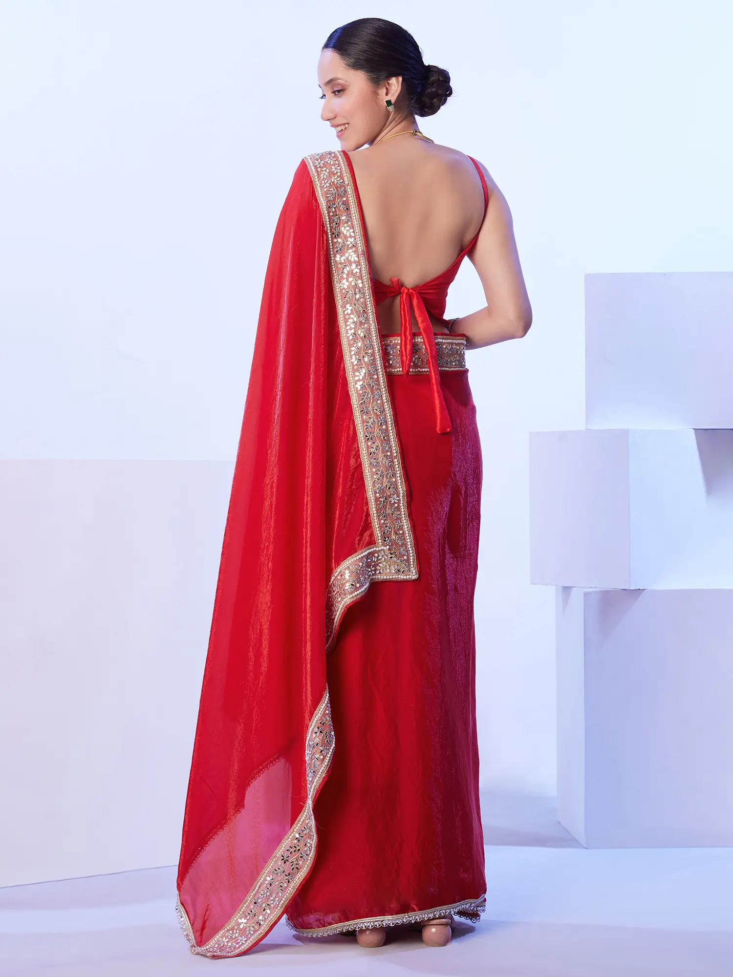This Venetian-Red saree is more than just an outfit; it's a testament to exceptional quality and craftsmanship. Every detail, from the selection of the premium satin Jimmy Choo fabric to the meticulous hand-stitching of the lace work, reflects our commitment to excellence. The saree is durable and beautifully made to ensure lasting elegance and many years of wear. You can trust in the quality and attention to detail that went into creating this stunning piece. Own a piece of artistry, a timeless classic that will make you feel radiant and confident.