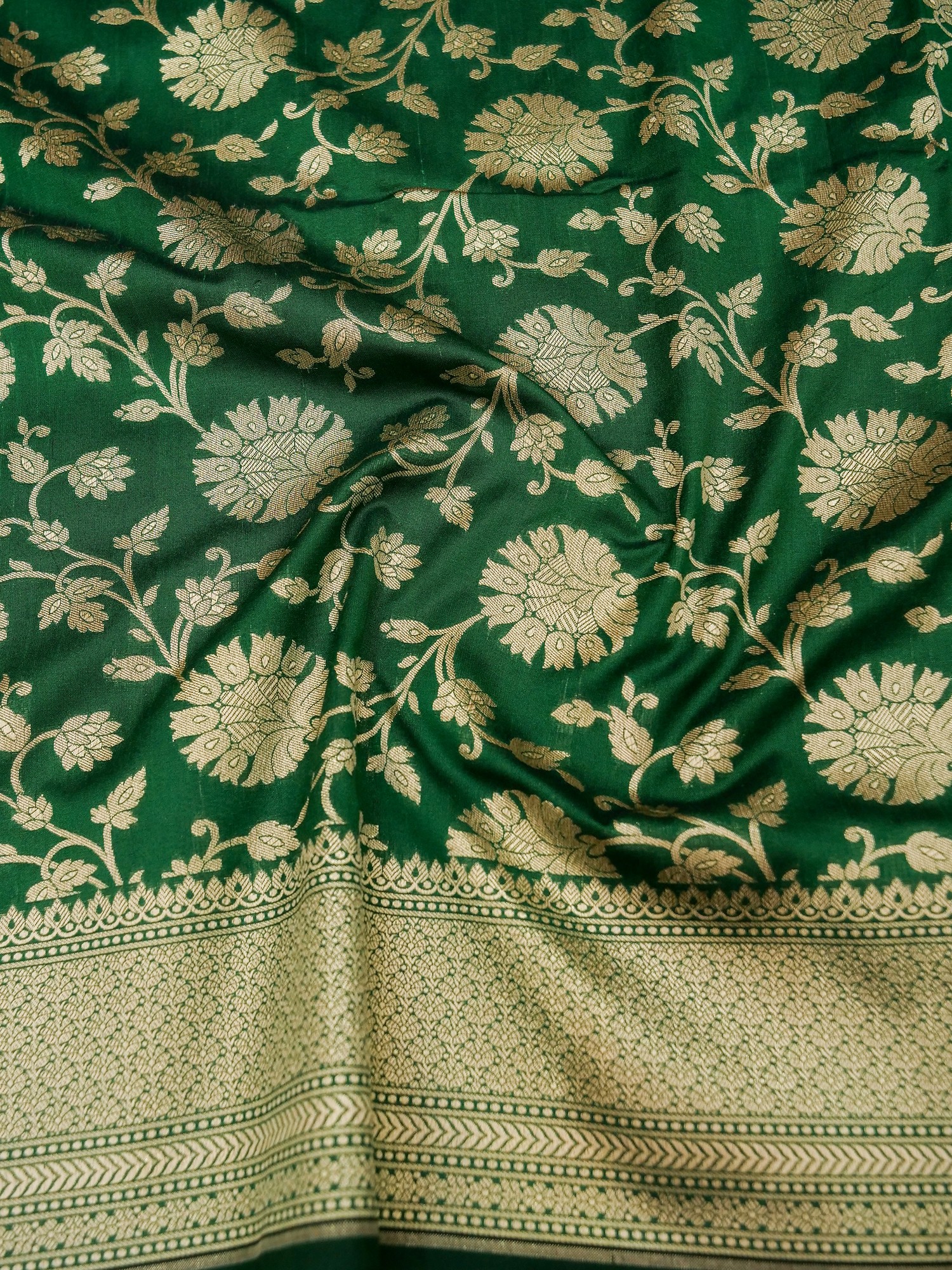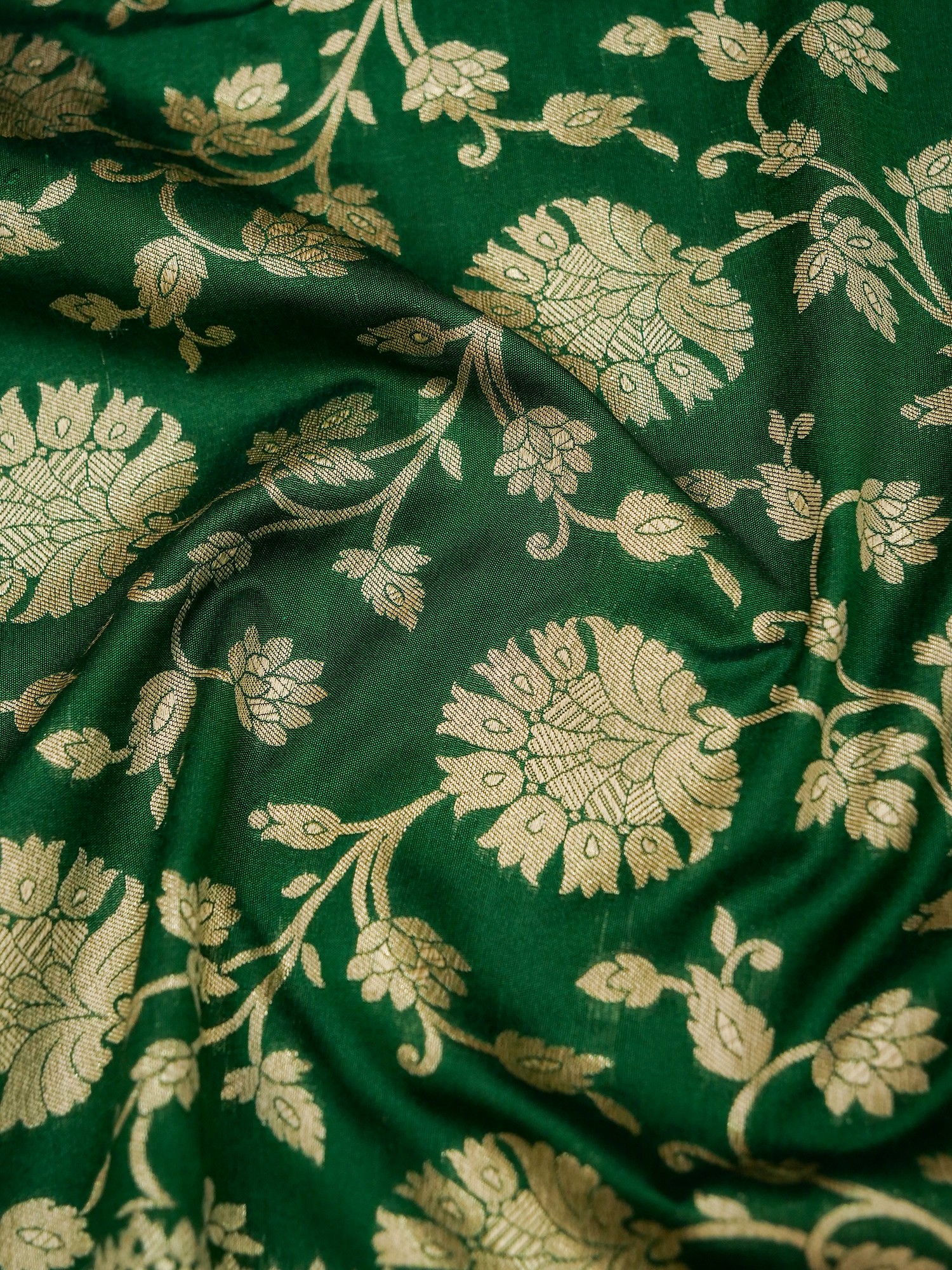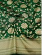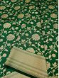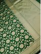 The Verdant-Green Silk Floral Jaal Pattern Banarasi Saree is a true embodiment of regal splendor. Deep green, an emblem of royalty, graces this traditional Banarasi saree, exuding timeless charm and sophistication. Its exquisite floral jaal pattern, meticulously handwoven on rich silk, adds a touch of artistic grandeur. The contrast broad border, shimmering in golden embellishments, elevates this drape to a masterpiece fit for royalty. This saree is not just a garment; it's a piece of art that deserves a place in the wardrobe of those who appreciate the beauty of tradition and the allure of elegance. Embrace the royalty within with this magnificent Banarasi saree.