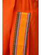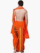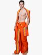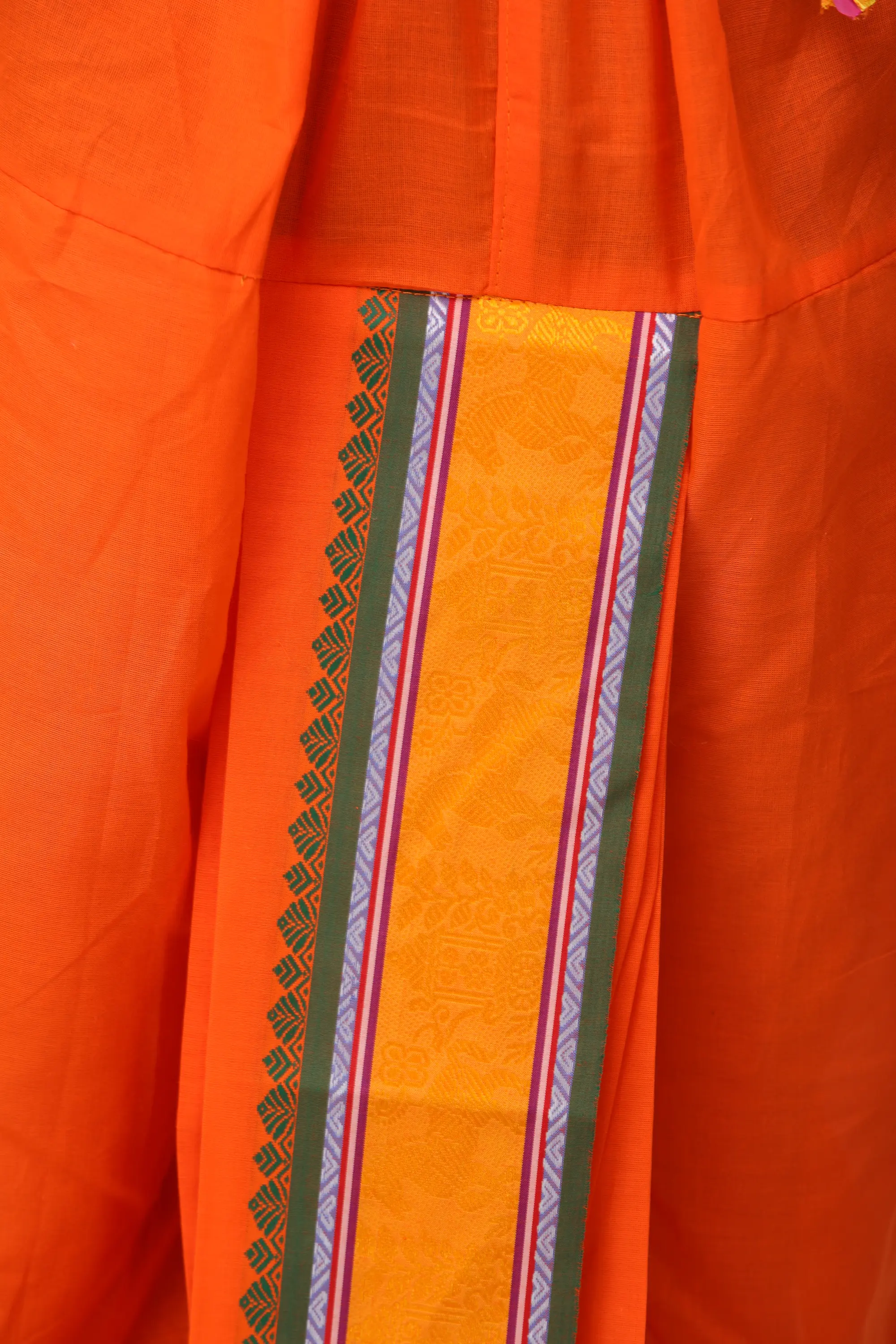 What truly sets this set apart is the breathtaking detail of the zari thread work. The borders of both the dhoti and angavastram are adorned with meticulously woven motifs. You'll find charming horse cart imagery, evoking a sense of movement and tradition, intricately intertwined with delicate floral patterns. These motifs, rendered in shimmering zari, catch the light beautifully, adding a luxurious dimension to the garment. The contrast between the bright orange cotton and the gleam of the gold and silver threads creates a visually stunning effect that is both eye-catching and refined. This intricate craftsmanship speaks to a heritage of skilled artistry, transforming a simple garment into a wearable work of art.