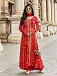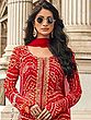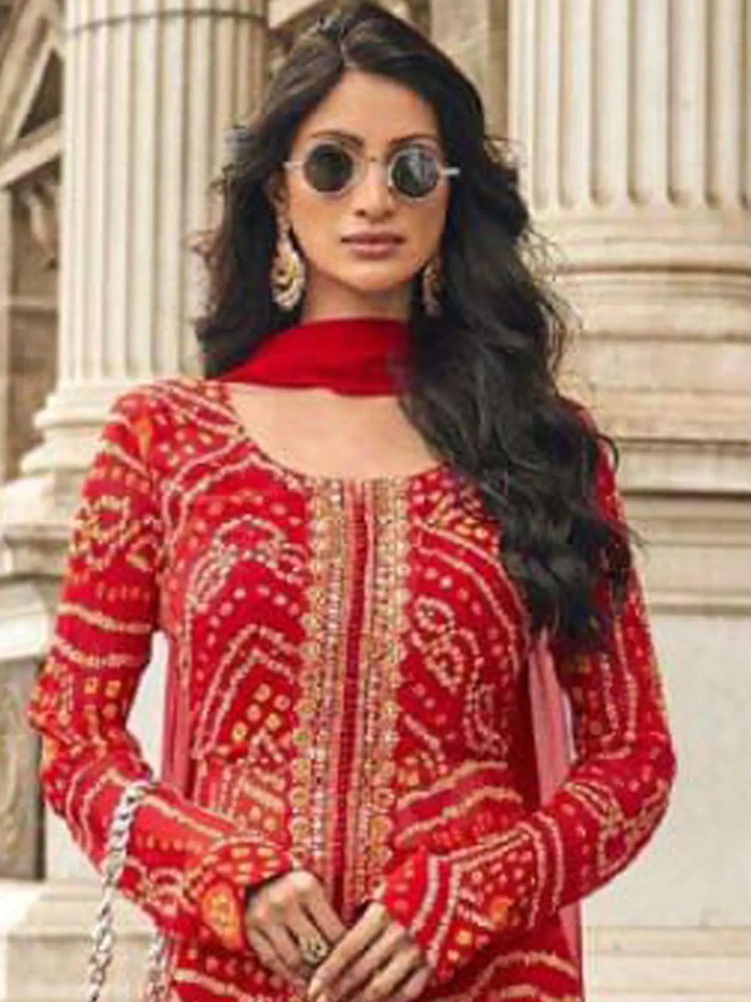 The flowing Anarkali cut is designed to flatter, offering a graceful movement with every step you take. The vibrant red hue serves as a perfect canvas for the intricate bandhani motifs and the dazzling embellishments. This ensemble, presented in a Medium size (fitting a size #38), ensures a comfortable and elegant silhouette, embodying sophisticated style.