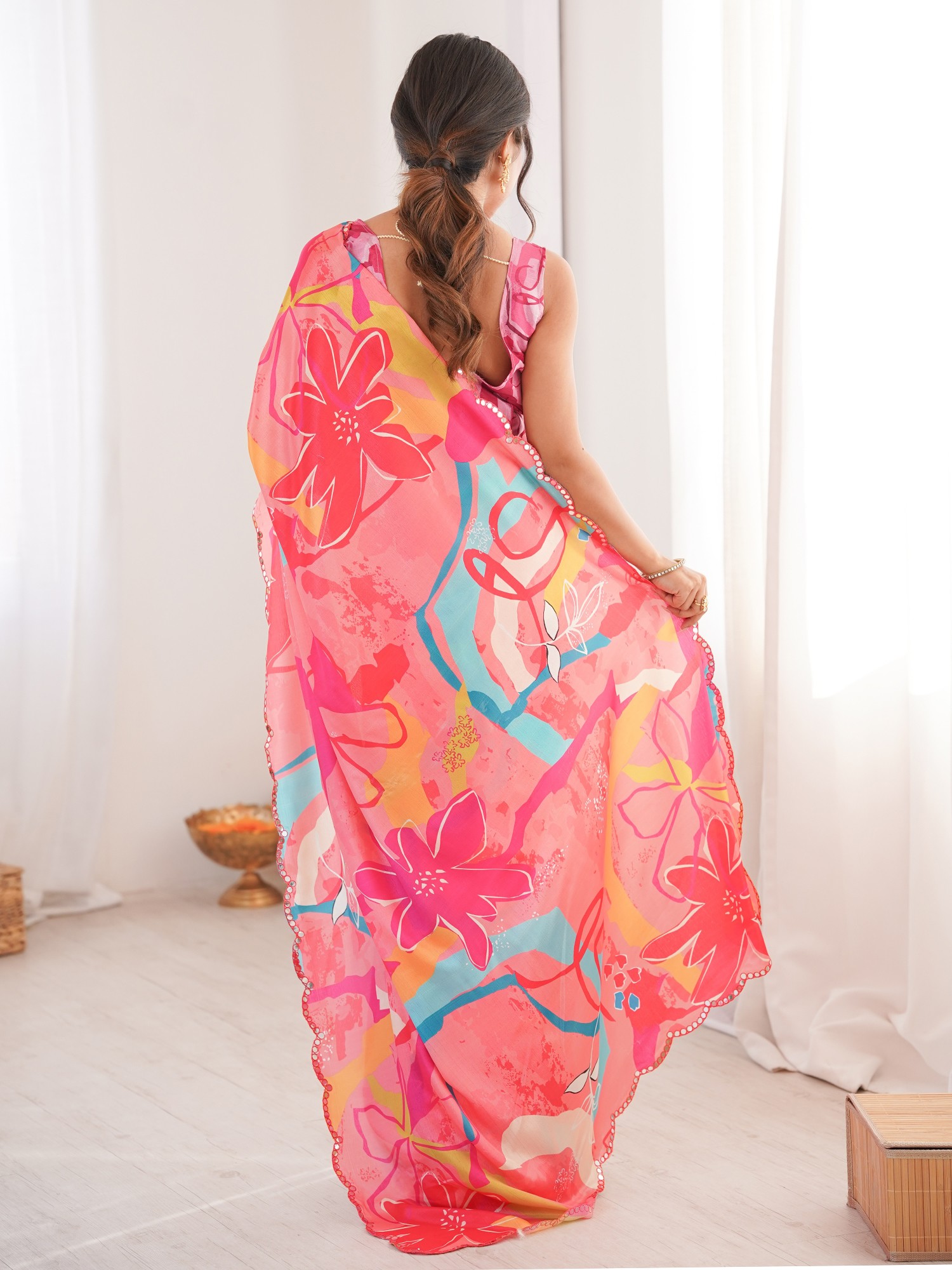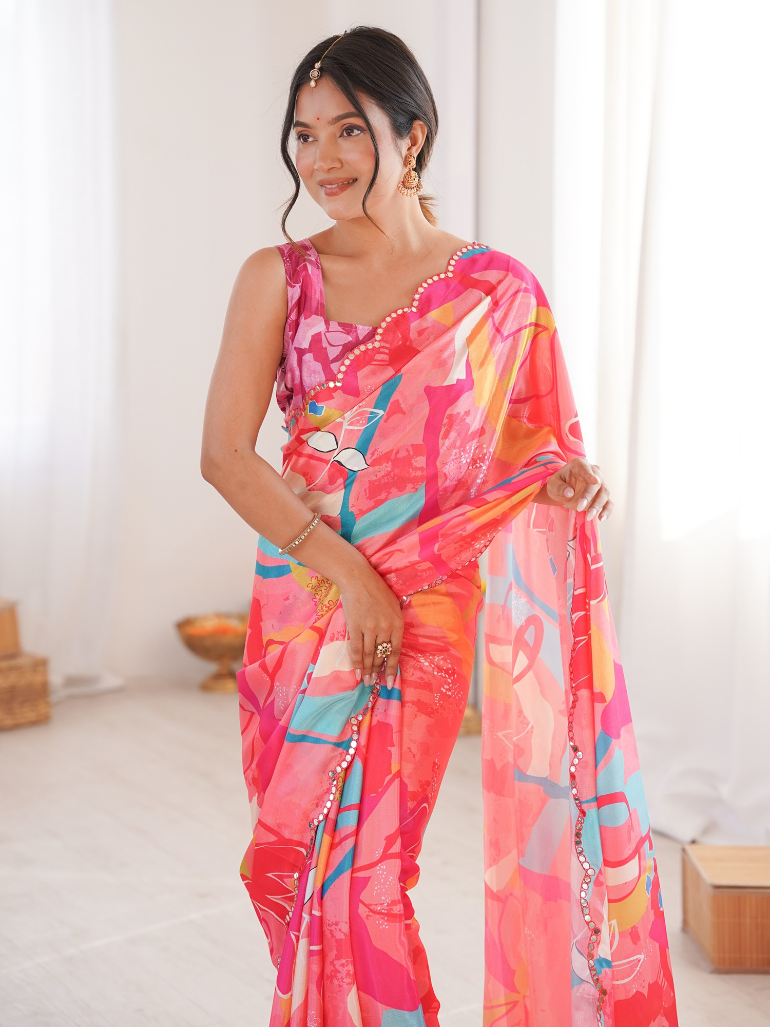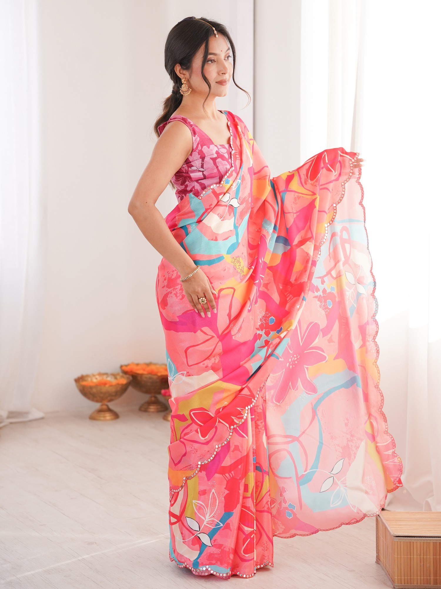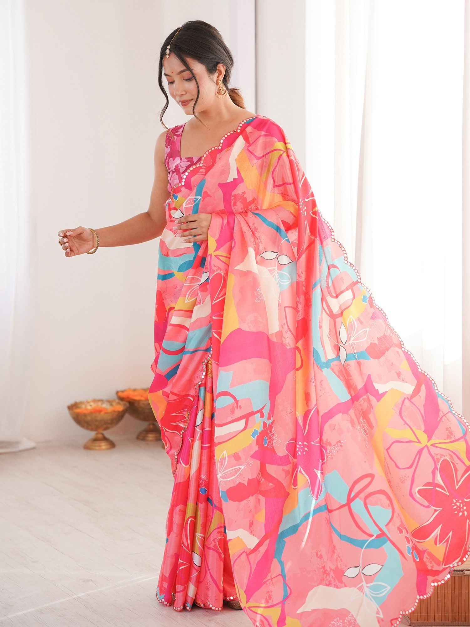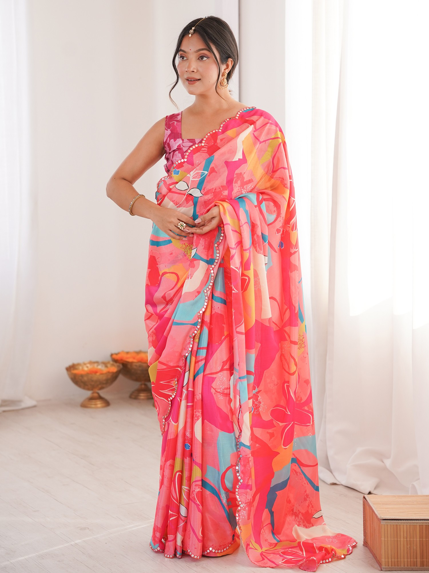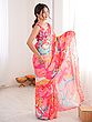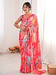 Chinon Saree With Elegant Floral Print And Mirror Cut Work Perfect For Party And Festive Occasions Traditional Stylish Saree For Women