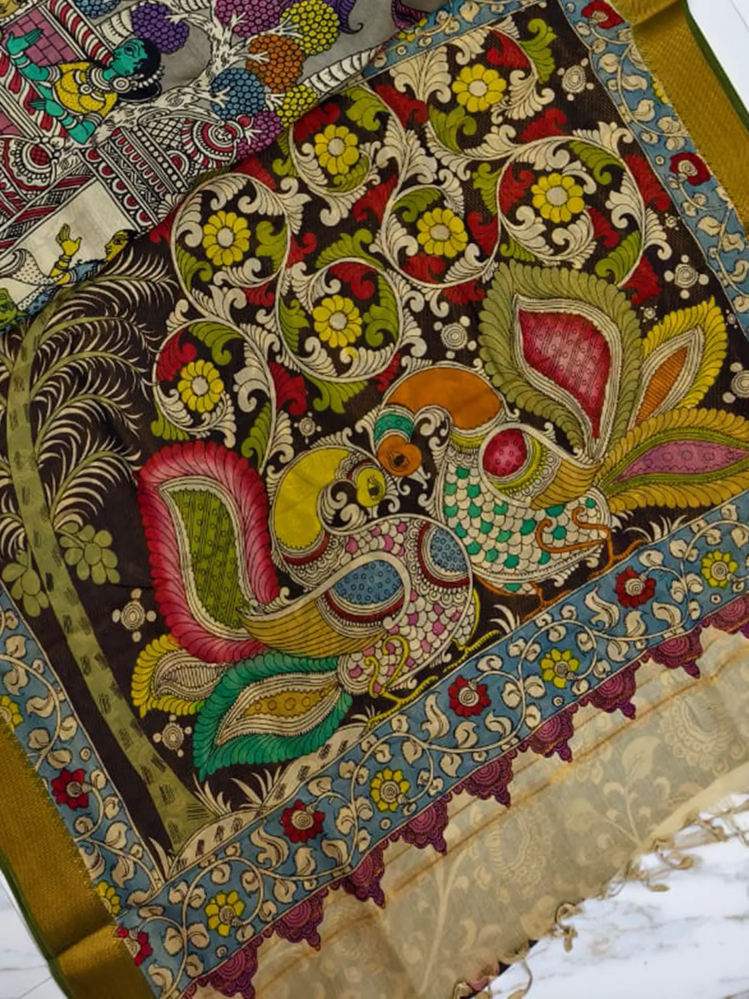 Crafted from a fine semi-silk blend, this saree offers a beautiful drape that is both elegant and comfortable. The subtle sheen of the silk enhances the intricate Kalamkari work, making the colors pop and the details stand out. The borders are further embellished with a delicate golden thread, adding a touch of regal splendor and catching the light with every movement. The rich, detailed patterns on the body of the saree are balanced by a soft, flowing base, ensuring that the overall impression is one of refined beauty.